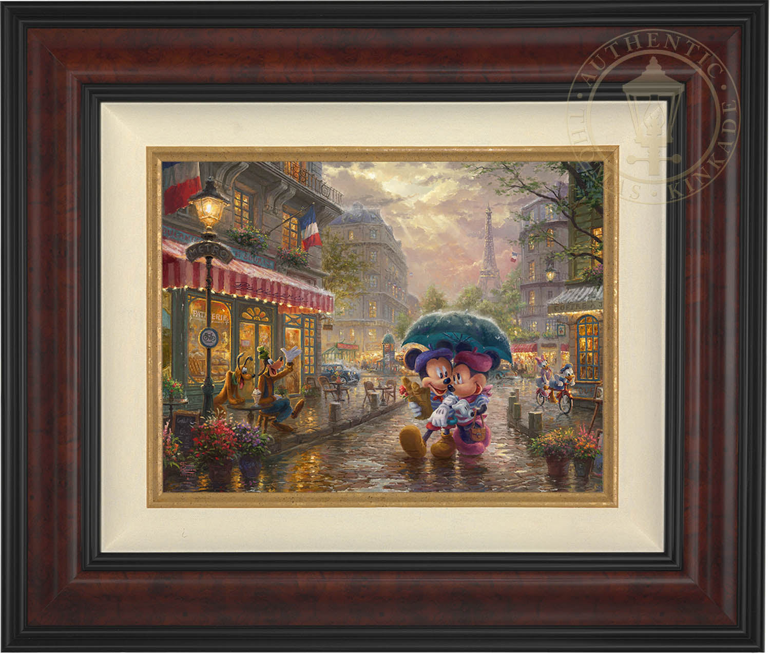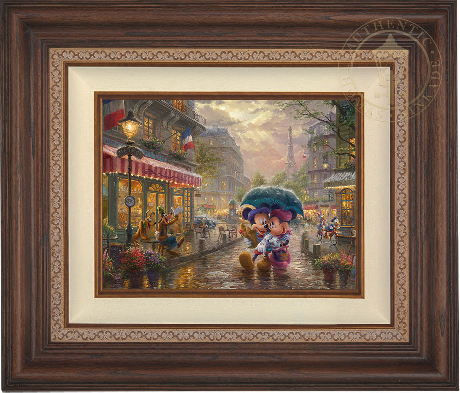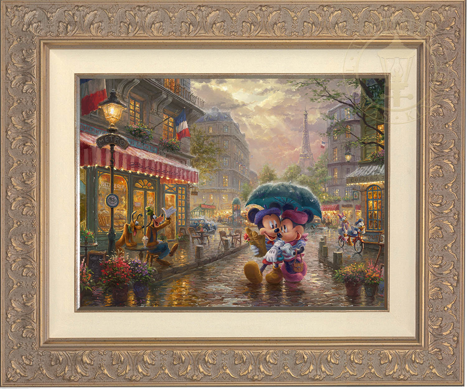 In the Passport to Adventures series by Thomas Kinkade Studios, Mickey and Minnie, along with some of their closest friends, explore famous travel destinations around the world. Mickey and friends find themselves on an adventure in arguably the most romantic city in the world, Paris! Dressed in traditional French attire, Mickey and Minnie enjoy playing tourist in their berets and stripped shirts after spending the morning at the cafe. Behind them are their dear friends, Daisy and Donald, creating quite a splash on their tandem bikes as they ride through the puddle filled streets of Paris. As Goofy greets his friends passing by, Pluto can’t help but drool over the ice cream sundae that is left unattended.