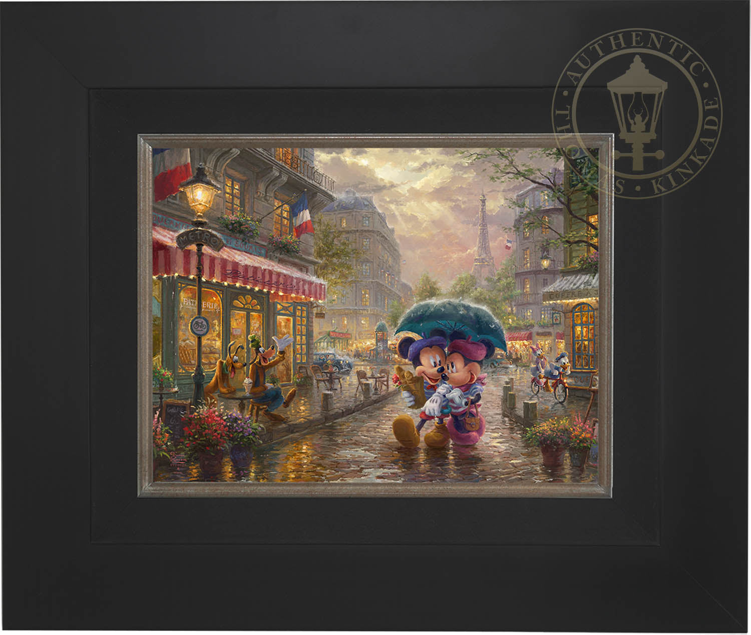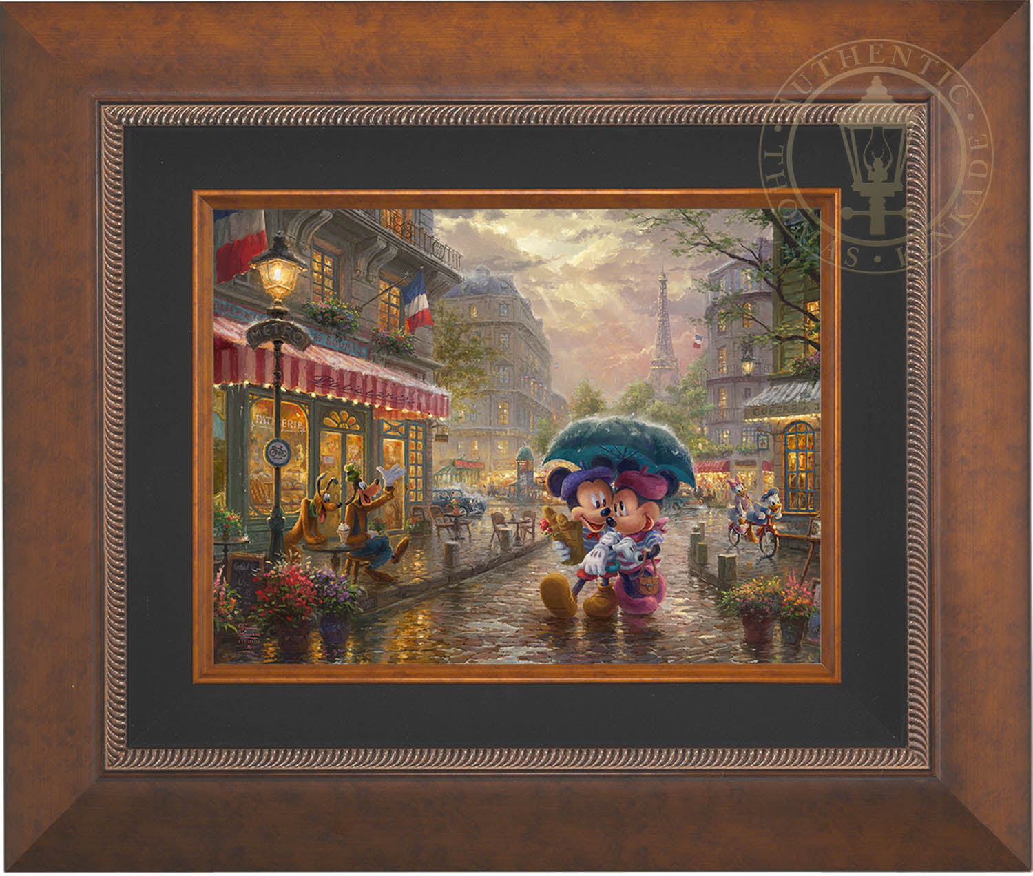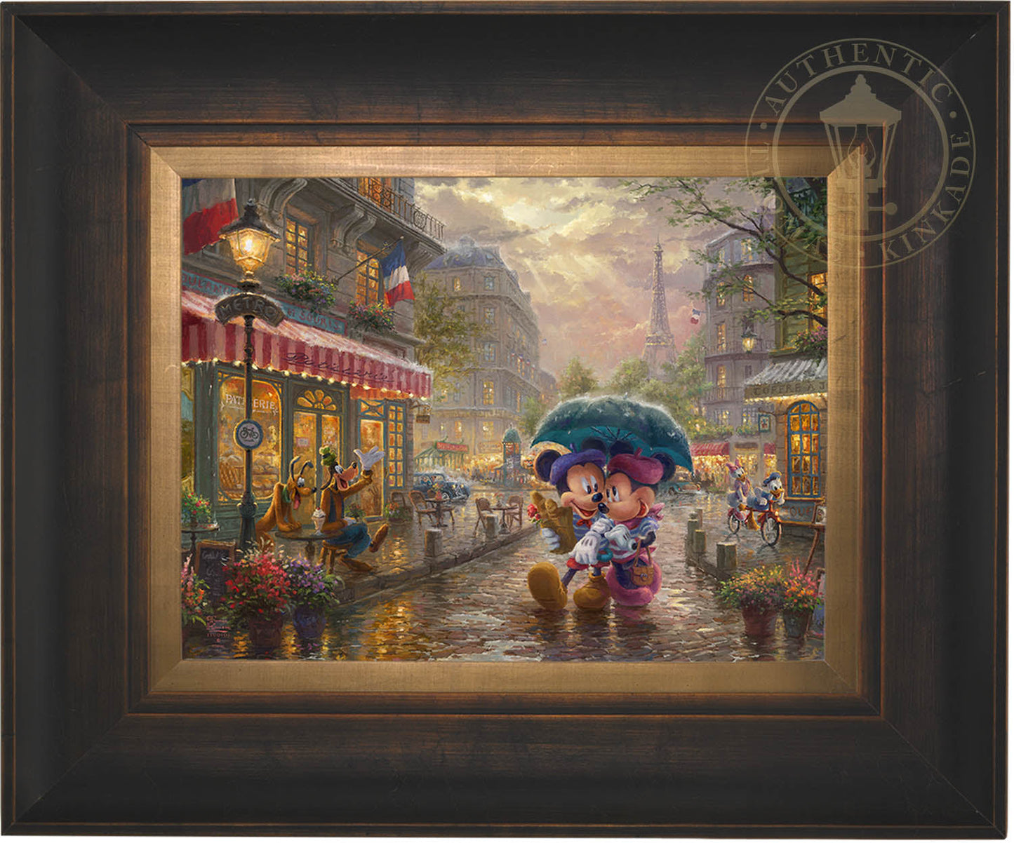 In the Passport to Adventures series by Thomas Kinkade Studios, Mickey and Minnie, along with some of their closest friends, explore famous travel destinations around the world. Mickey and friends find themselves on an adventure in arguably the most romantic city in the world, Paris! Dressed in traditional French attire, Mickey and Minnie enjoy playing tourist in their berets and stripped shirts after spending the morning at the cafe. Behind them are their dear friends, Daisy and Donald, creating quite a splash on their tandem bikes as they ride through the puddle filled streets of Paris. As Goofy greets his friends passing by, Pluto can’t help but drool over the ice cream sundae that is left unattended.