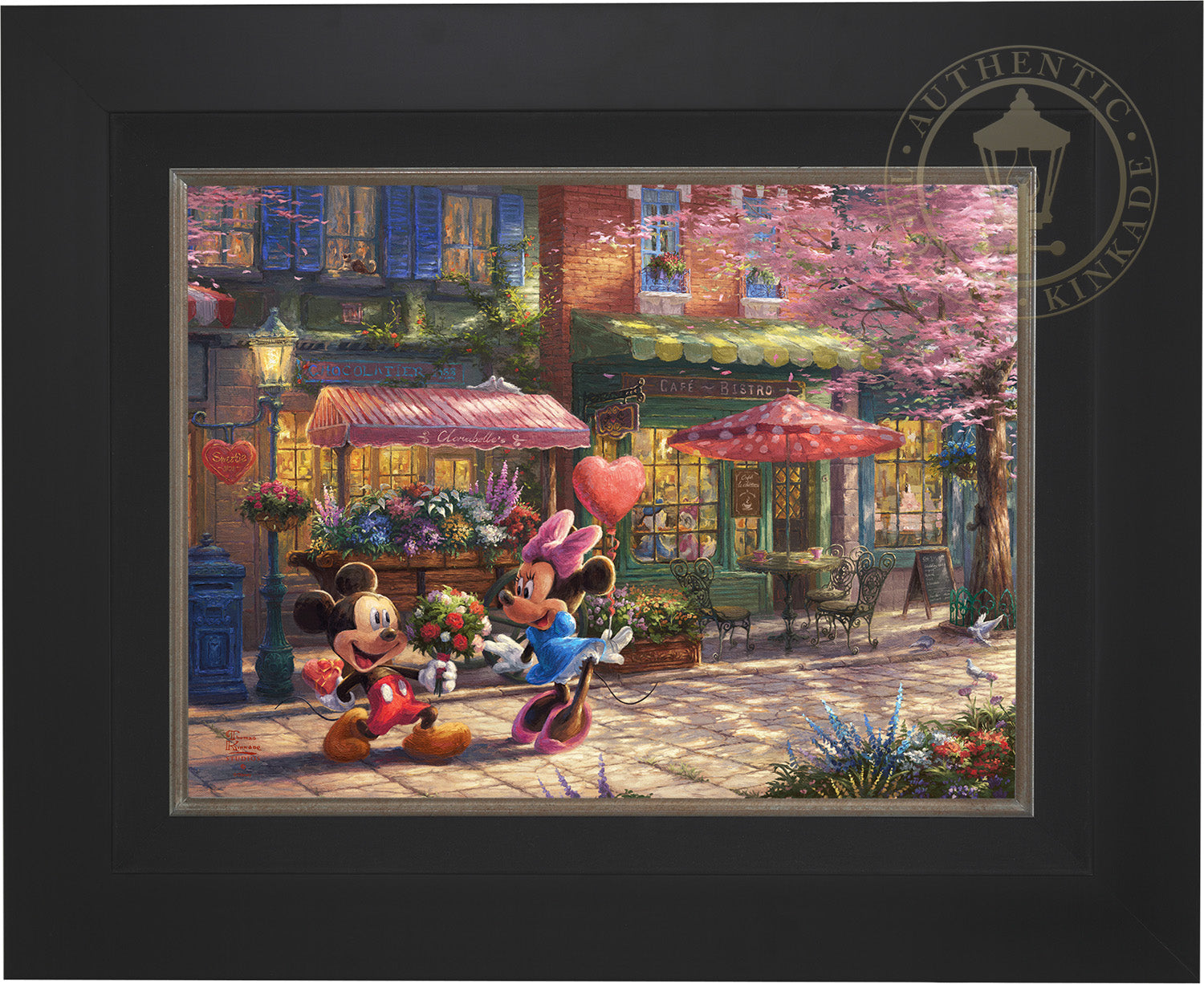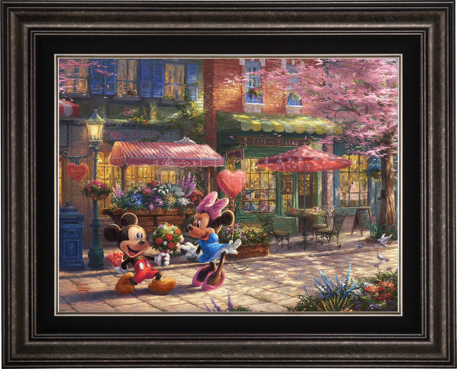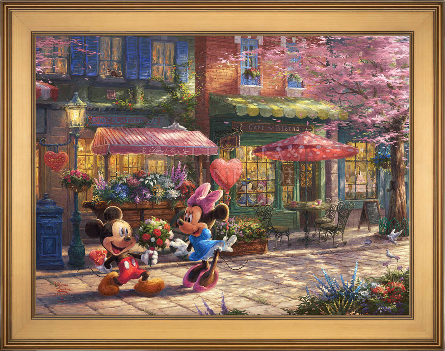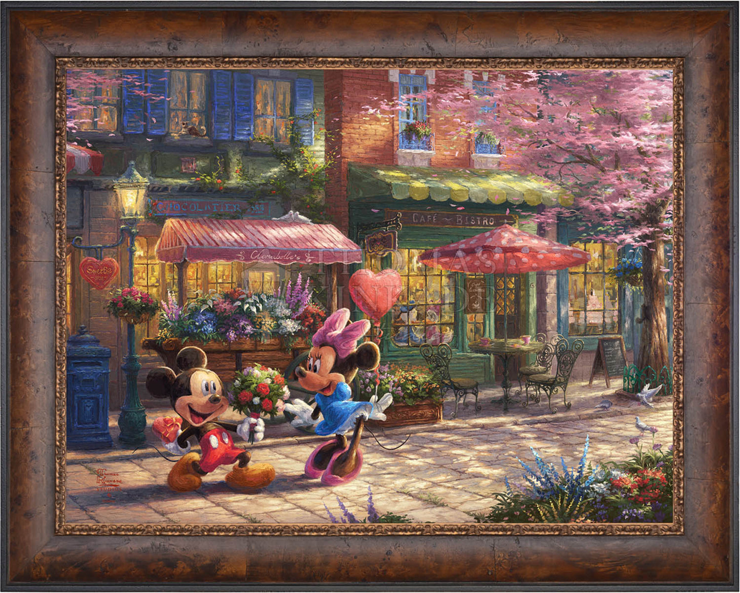 Thomas Kinkade was a life-long admirer of Walt Disney and the wonderful characters he created. While Thom re-created many of his favorite stories on canvas, he also envisioned classic Disney characters set within traditional Kinkade images. In these paintings from Thomas Kinkade Studios, his dream is proudly brought to life. In this gorgeous spring setting, Mickey Mouse presents Minnie Mouse with tokens of his affection – flowers, chocolates and a heart-shaped balloon. Romance is in the air as the pair enjoy an afternoon at their favorite sidewalk café. Dogwoods are in bloom, colorful flower boxes line the cobblestone lane, and love birds perch peacefully above the pair. Minnie Mouse glows with joy, deeply touched by Mickey Mouse's gifts. Disney Mickey and Minnie - Sweetheart Café reminds us how beautiful love is and how thoughtful gestures can mean so much.
