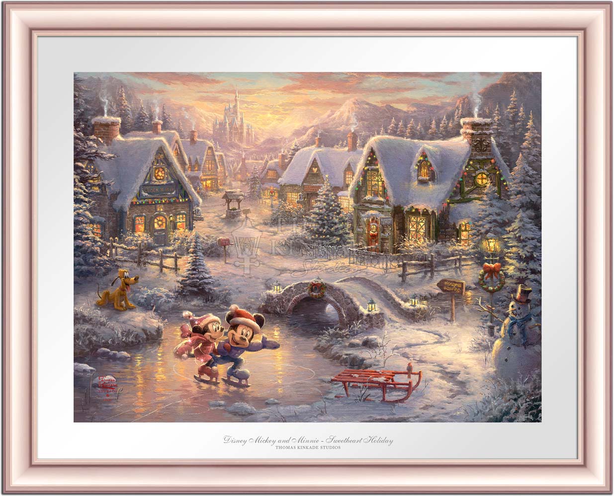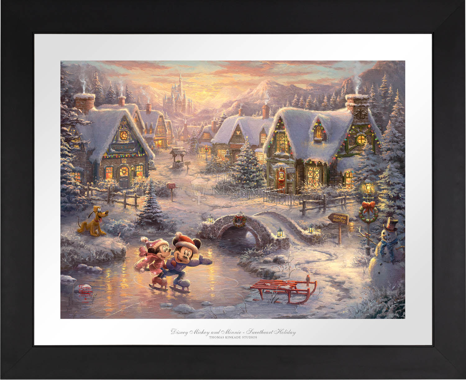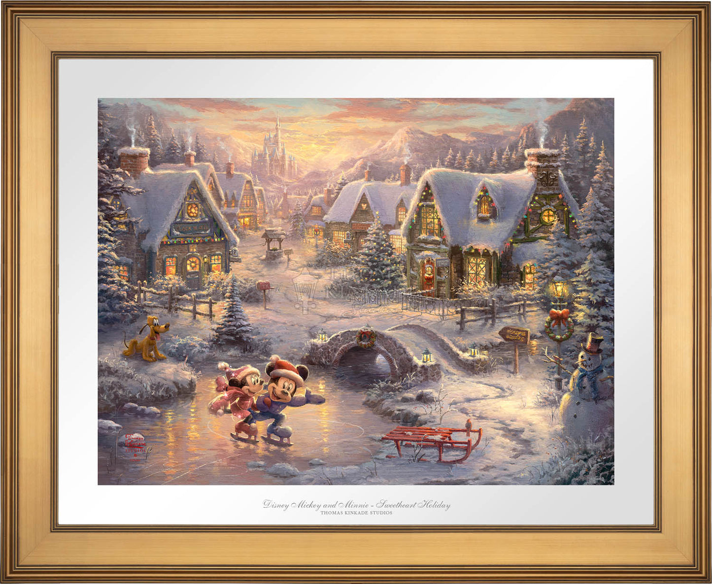 In this beautiful winter scene, Mickey Mouse and Minnie Mouse joyfully skate across a frozen pond, celebrating the magic of the Holidays together. Along with their friends, they have festively decorated “Mickey’s Square” with lights, wreaths, bows, a snowman, and all that makes the Holidays bright! Although it is cold outside, the skaters are warmed by friendship and love as they enjoy the wonders of the season together.