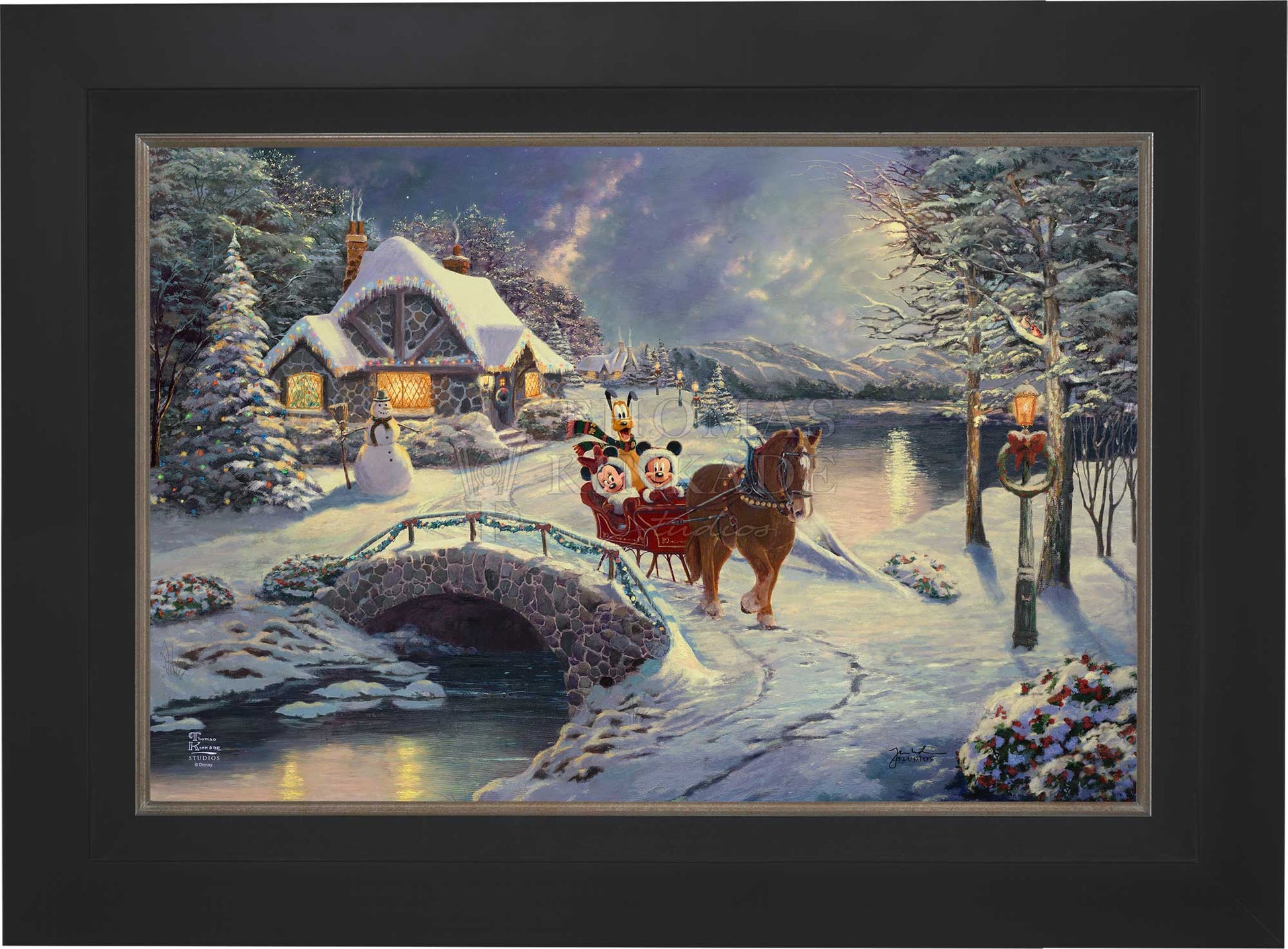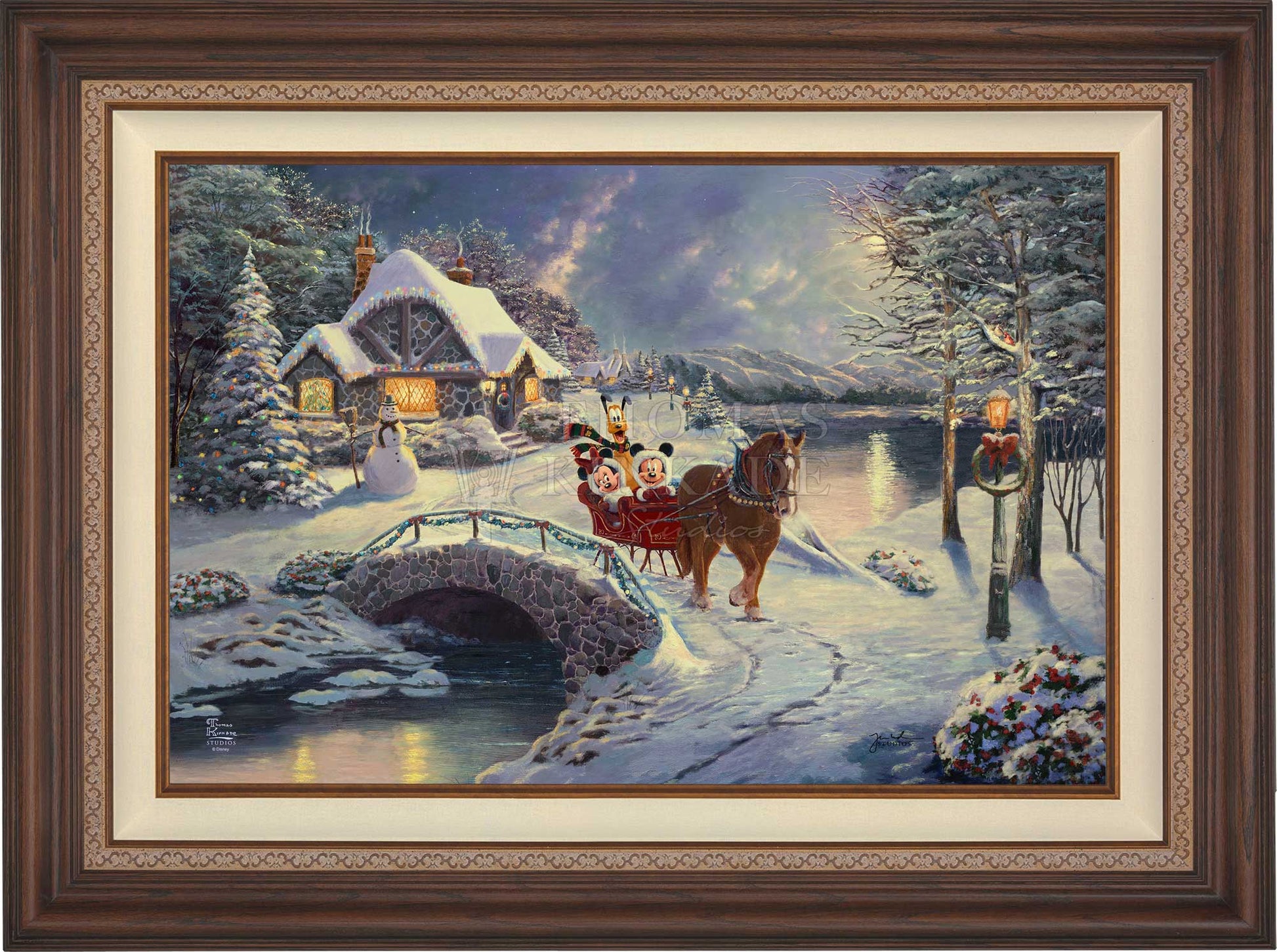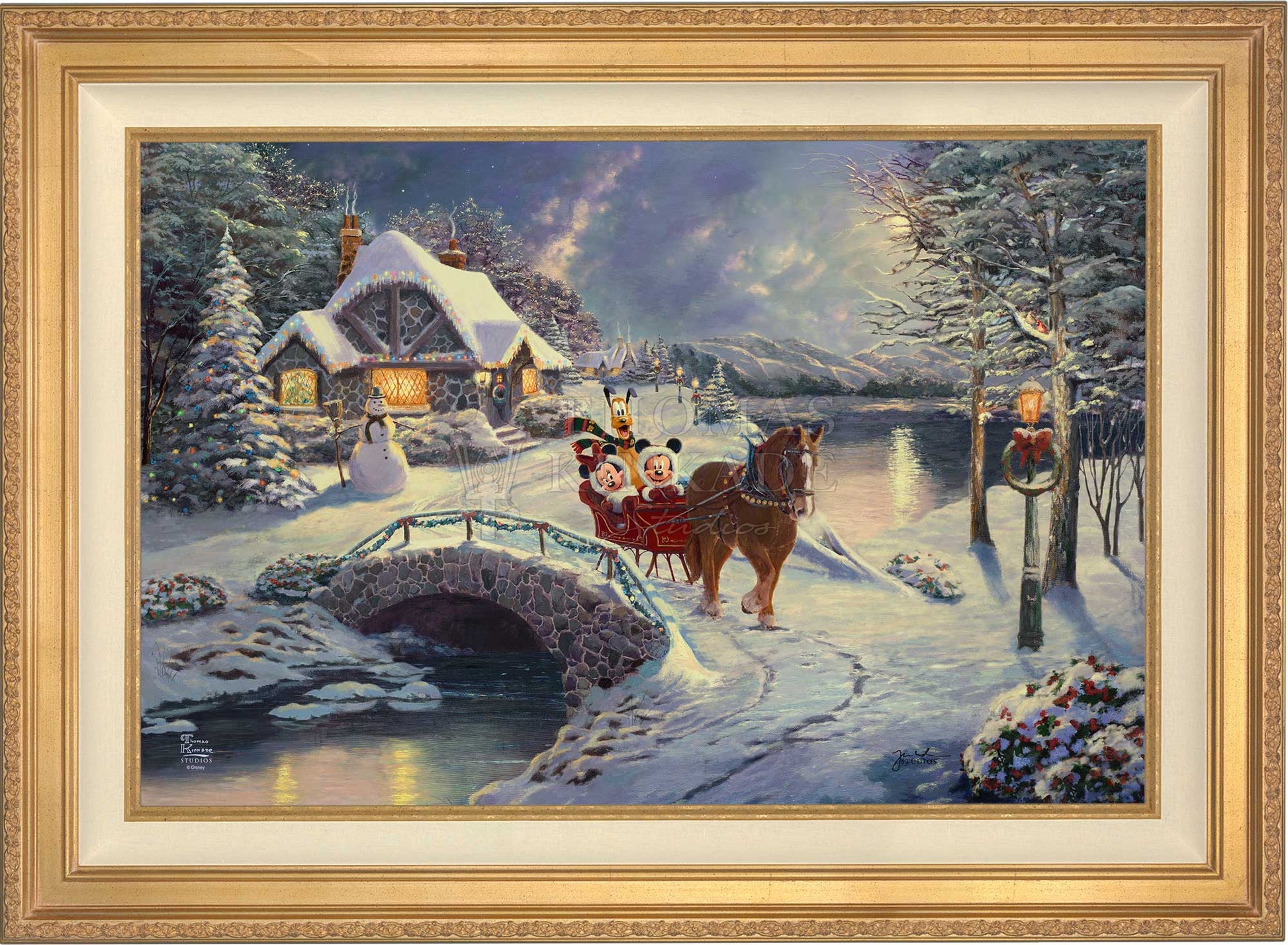 Call UsThomas Kinkade was a life-long admirer of Walt Disney and the wonderful characters he created. In collaboration with Disney, Thomas Kinkade Studios has created the Friendship Moments series, a collection of art featuring favorite characters and their best friends painted in beautiful Kinkade settings. One can almost feel the cool wintery breeze blowing across the smiling faces of Mickey, Minnie and Pluto as they enjoy their evening winter sleigh ride. The snow muffles the sounds of their horse’s hooves, as it drawMickey and Minnie Evening Sleigh Rides the sleigh over the stone bridge. The Christmas trees twinkle against the evening sky and the holly berry bushes bloom a vibrant red along their snowy path. This is a most wondrous time for Mickey and Minnie as the Christmas season is almost upon them. Are they off on a winter adventure, or are they on the way to the nearby village to shop for family and friends? Thomas Kinkade Studios invites you to join in on the Holiday fun in Mickey and Minnie Evening Sleigh Ride.