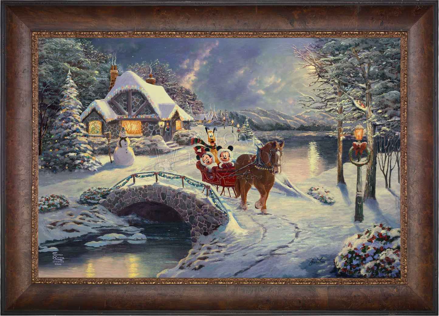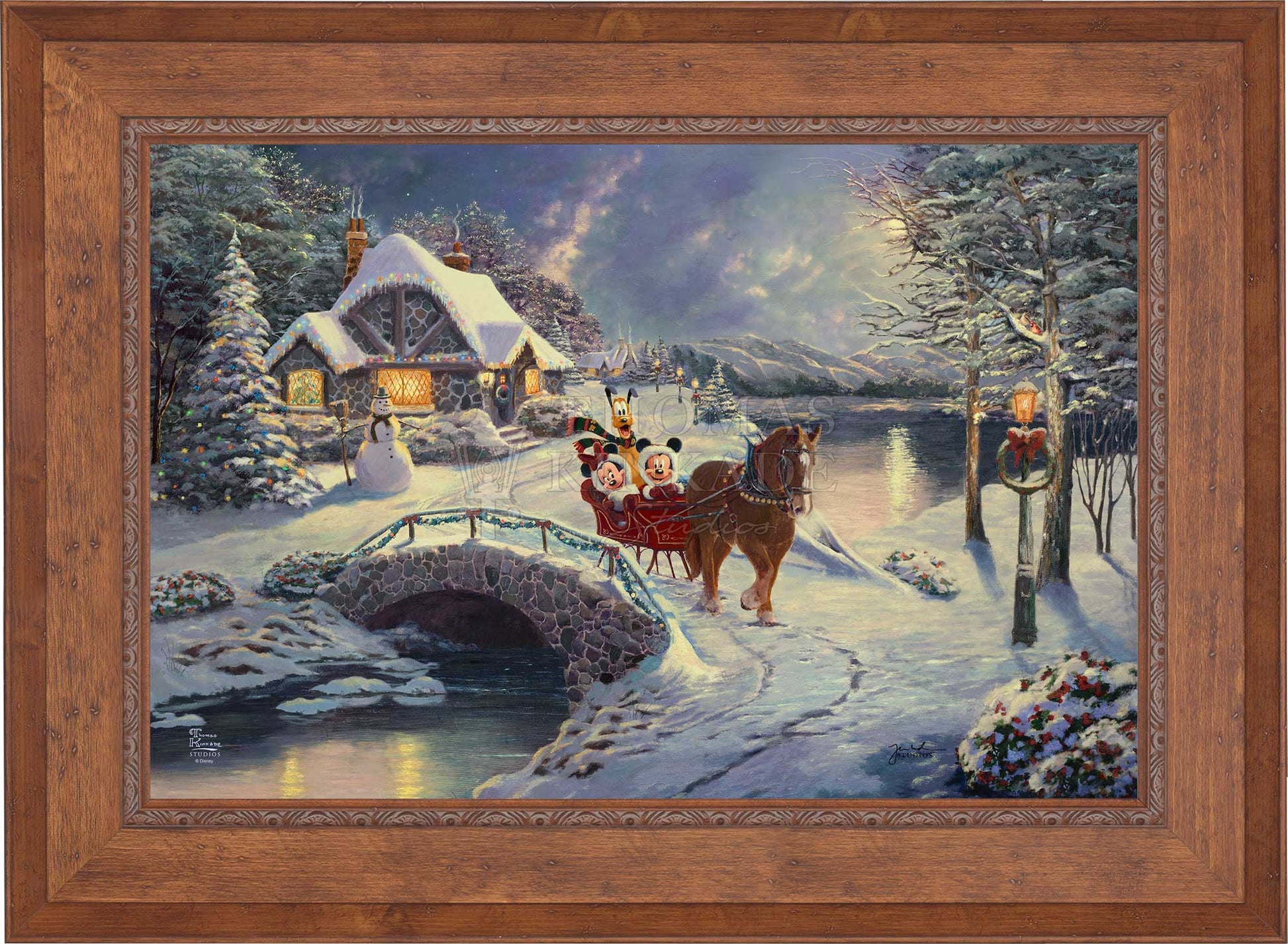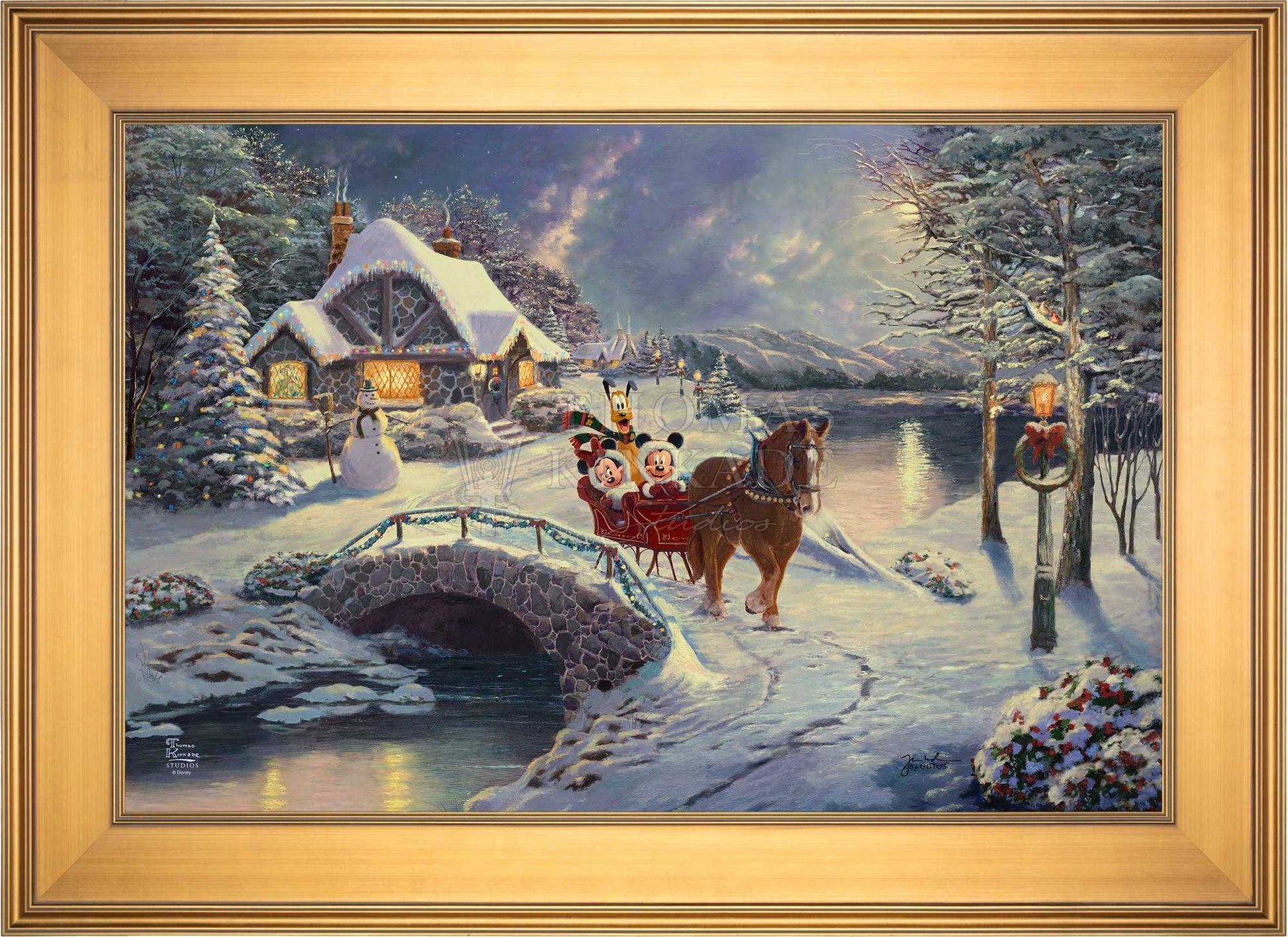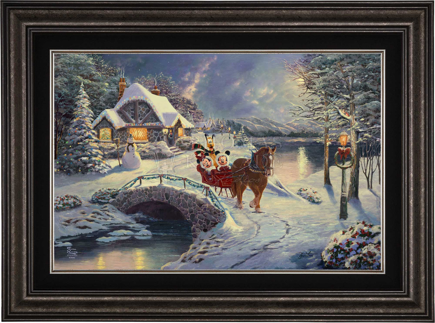 Call UsThomas Kinkade was a life-long admirer of Walt Disney and the wonderful characters he created. In collaboration with Disney, Thomas Kinkade Studios has created the Friendship Moments series, a collection of art featuring favorite characters and their best friends painted in beautiful Kinkade settings. One can almost feel the cool wintery breeze blowing across the smiling faces of Mickey, Minnie and Pluto as they enjoy their evening winter sleigh ride. The snow muffles the sounds of their horse’s hooves, as it drawMickey and Minnie Evening Sleigh Rides the sleigh over the stone bridge. The Christmas trees twinkle against the evening sky and the holly berry bushes bloom a vibrant red along their snowy path. This is a most wondrous time for Mickey and Minnie as the Christmas season is almost upon them. Are they off on a winter adventure, or are they on the way to the nearby village to shop for family and friends? Thomas Kinkade Studios invites you to join in on the Holiday fun in Mickey and Minnie Evening Sleigh Ride.
