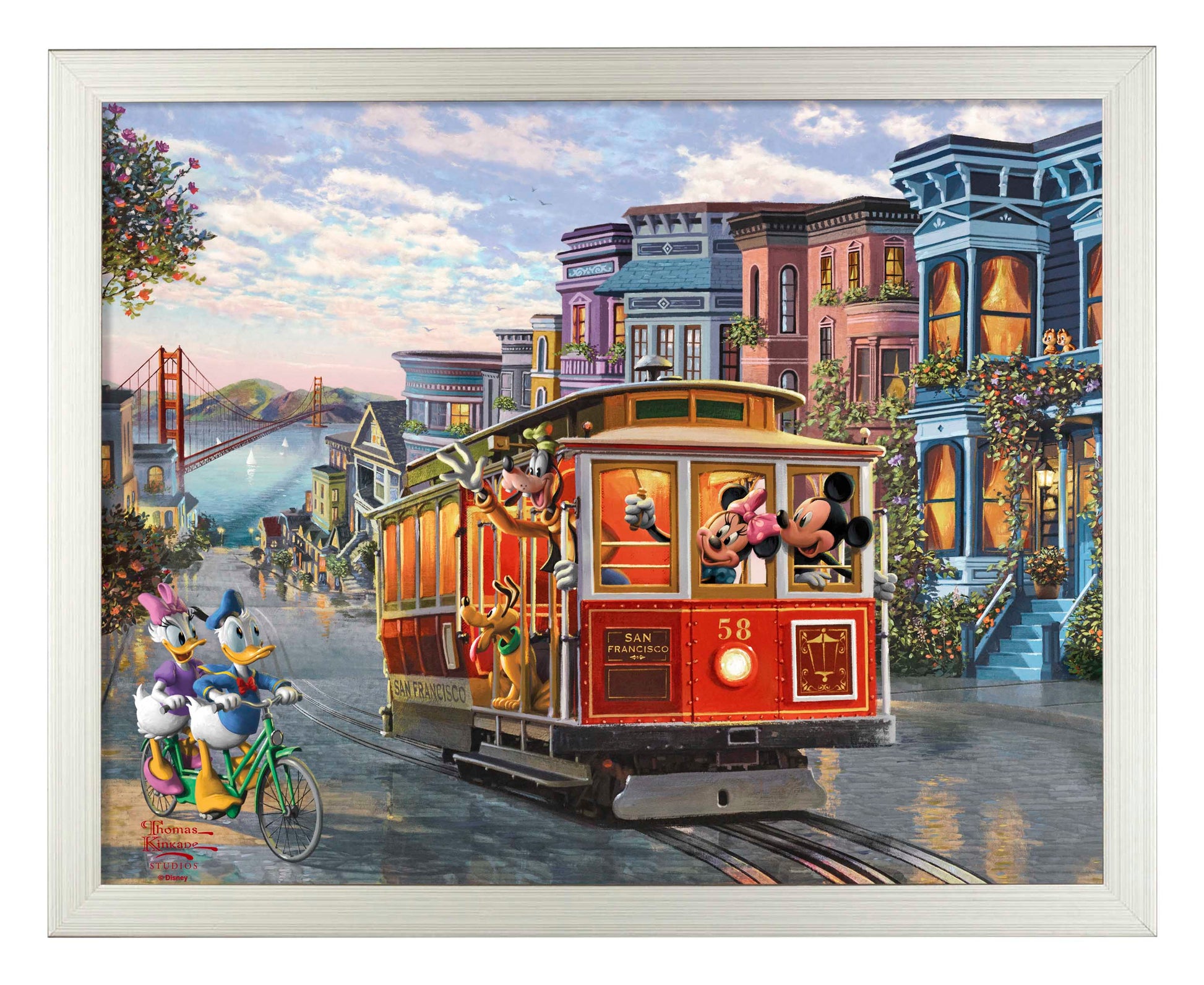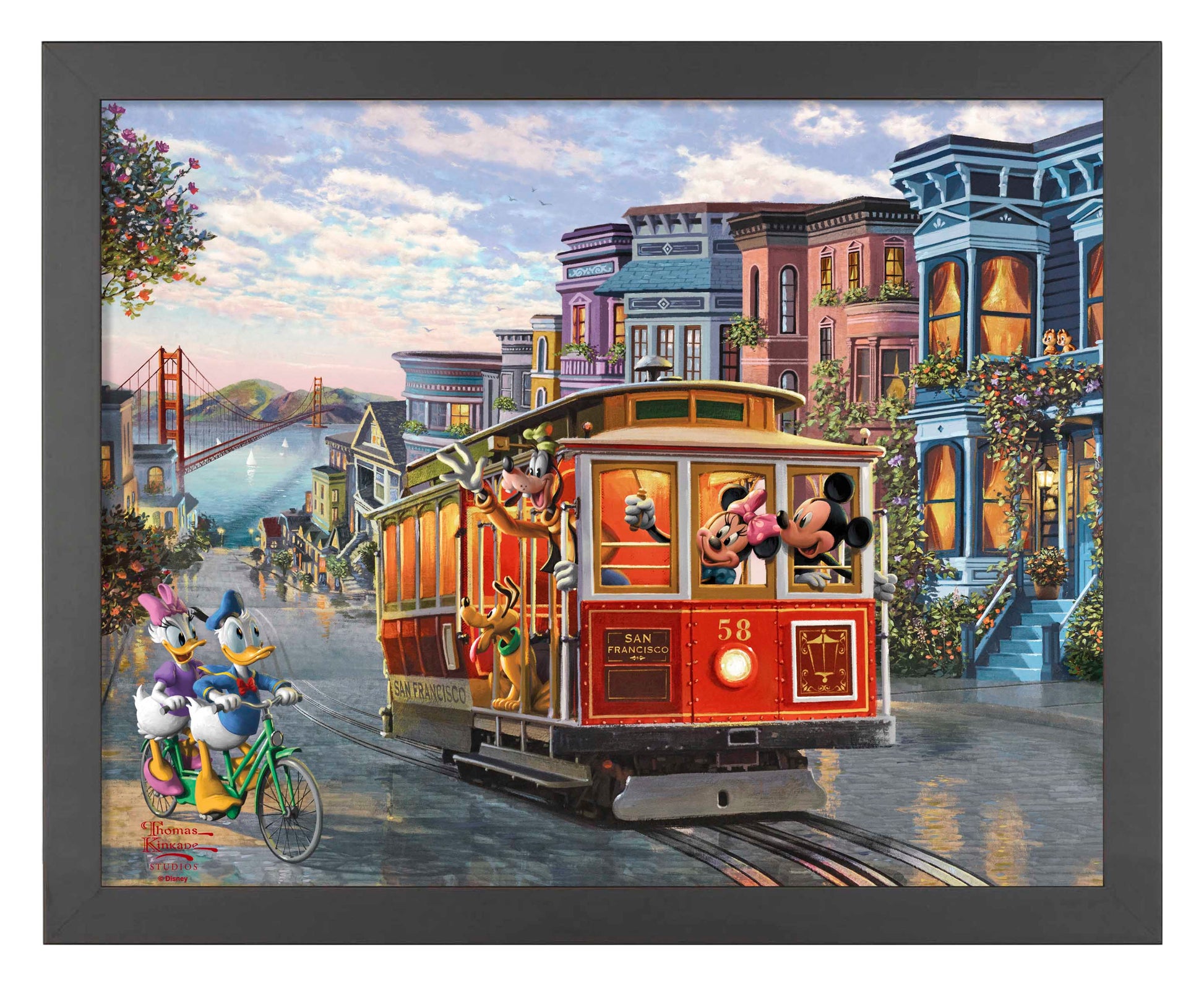 In Disney Mickey and Minnie in San Francisco by Thomas Kinkade Studios, the bright sunshine is casting a warm glow over the City by the Bay, and is shimmering a reflection of the iconic Golden Gate Bridge onto the water. Mickey Mouse and Minnie Mouse, along with Goofy and Pluto, are enjoying a ride on a classic San Francisco cable car. Chip and Dale watch with fascination as Minnie rings the cable car bell to get the attention of Donald Duck and Daisy Duck, who are merrily peddling by on a bicycle built for two.
