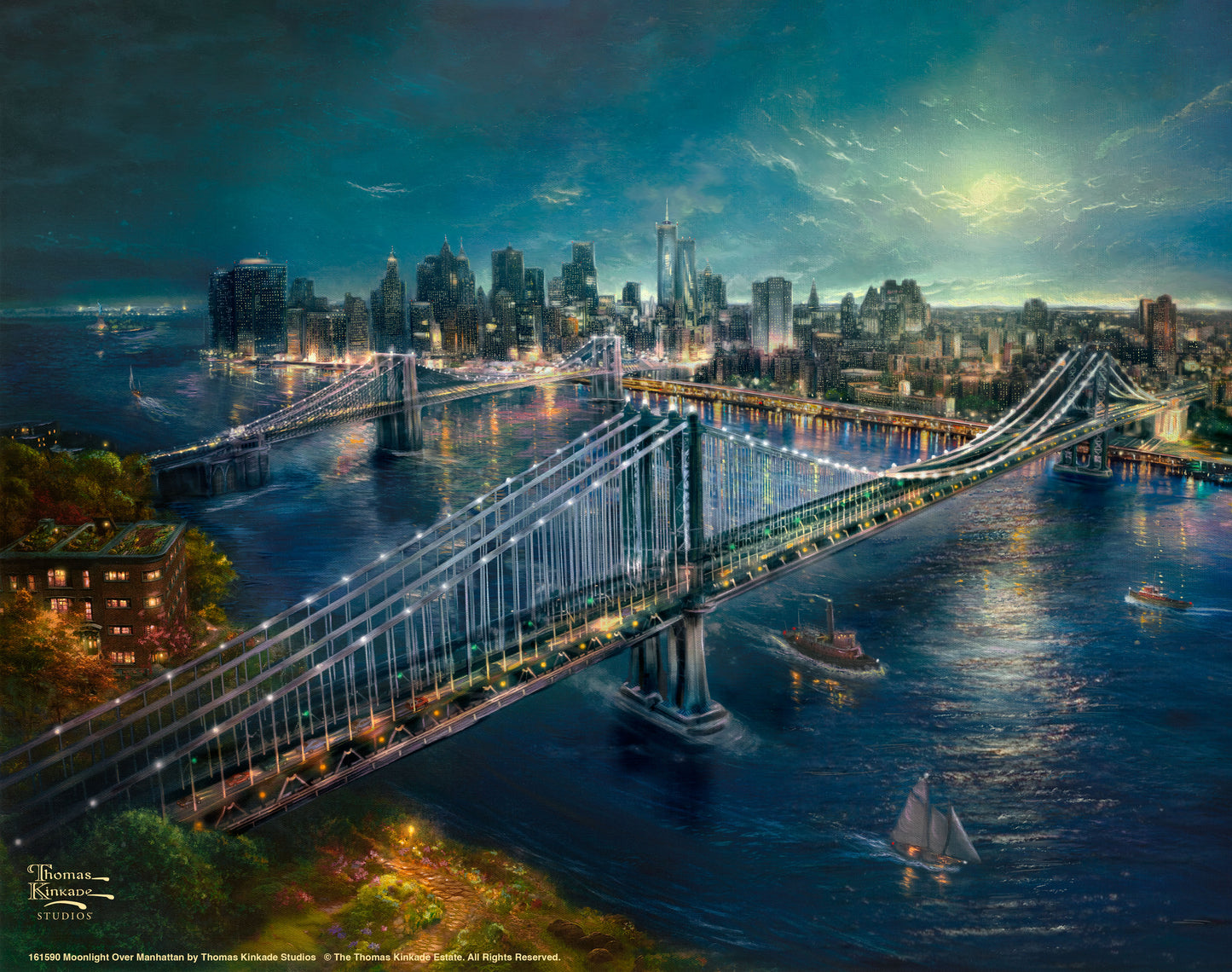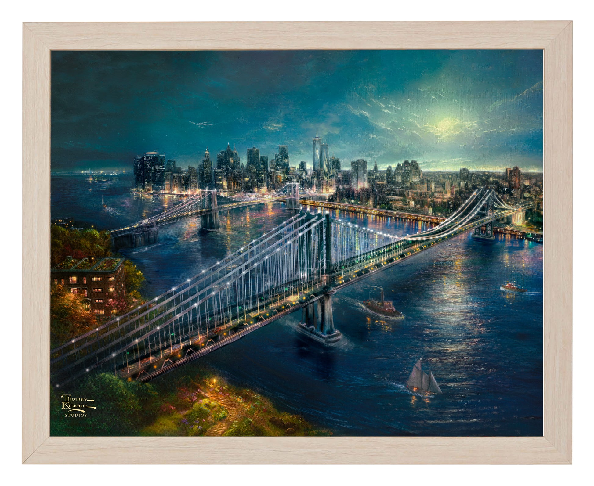 As the moonlight shines brightly over New York City, the skyline twinkles with thousands of little bright lights that mimic the pulsing rhythm of this dynamic city. The traffic on the water, bridges, and shoreline reflect that the heart of this city never stops beating. If one stands still long enough, you may just hear the honk of a car horn, someone yell "taxi" or the horn from the tugboat as it passes underneath the Manhattan Bridge. In the distance, the Statue of Liberty stands guard and holds the torch of freedom high in the night sky. Join Thomas Kinkade Studios and celebrate the magic of this wonderful city in Moonlight over Manhattan.