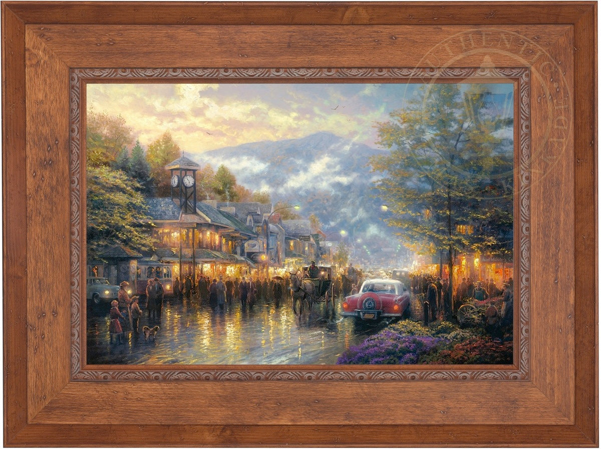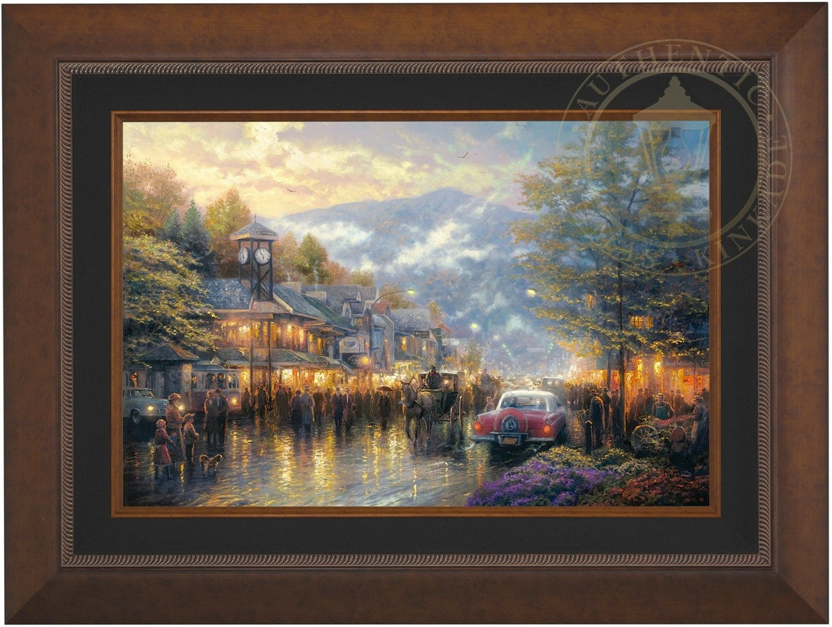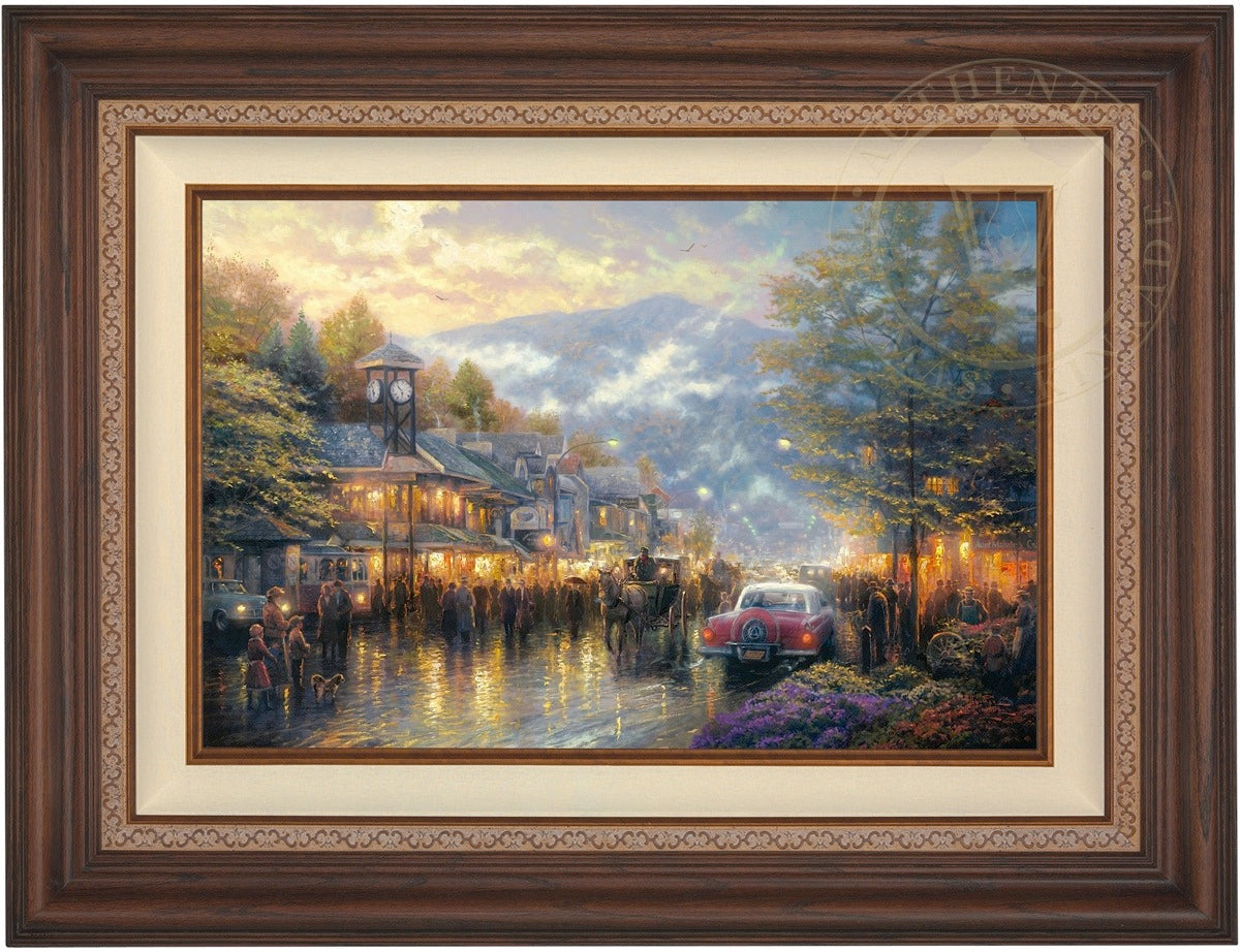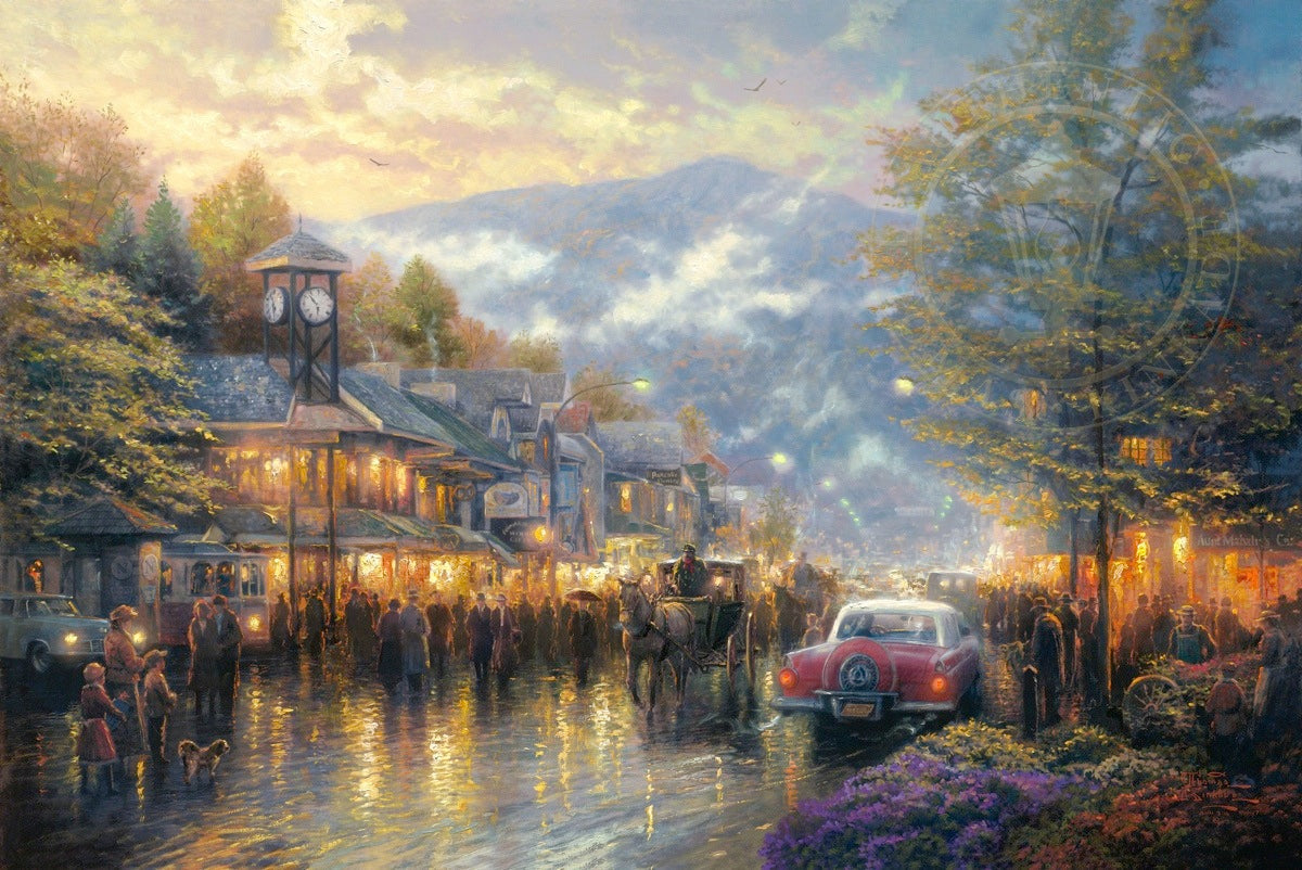 Nestled between dramatic Smoky Mountain peaks, Gatlinburg, Tennessee, touches my boyhood Mountain Memories. I'm celebrating the town's bicentennial by featuring a romanticized vision of its present, as well as honoring its rustic past in my limited edition portrait of the town - Mountain Memories.