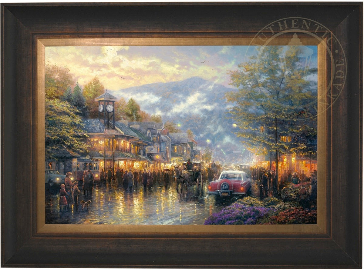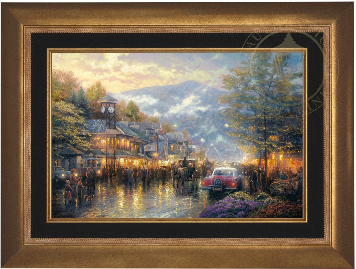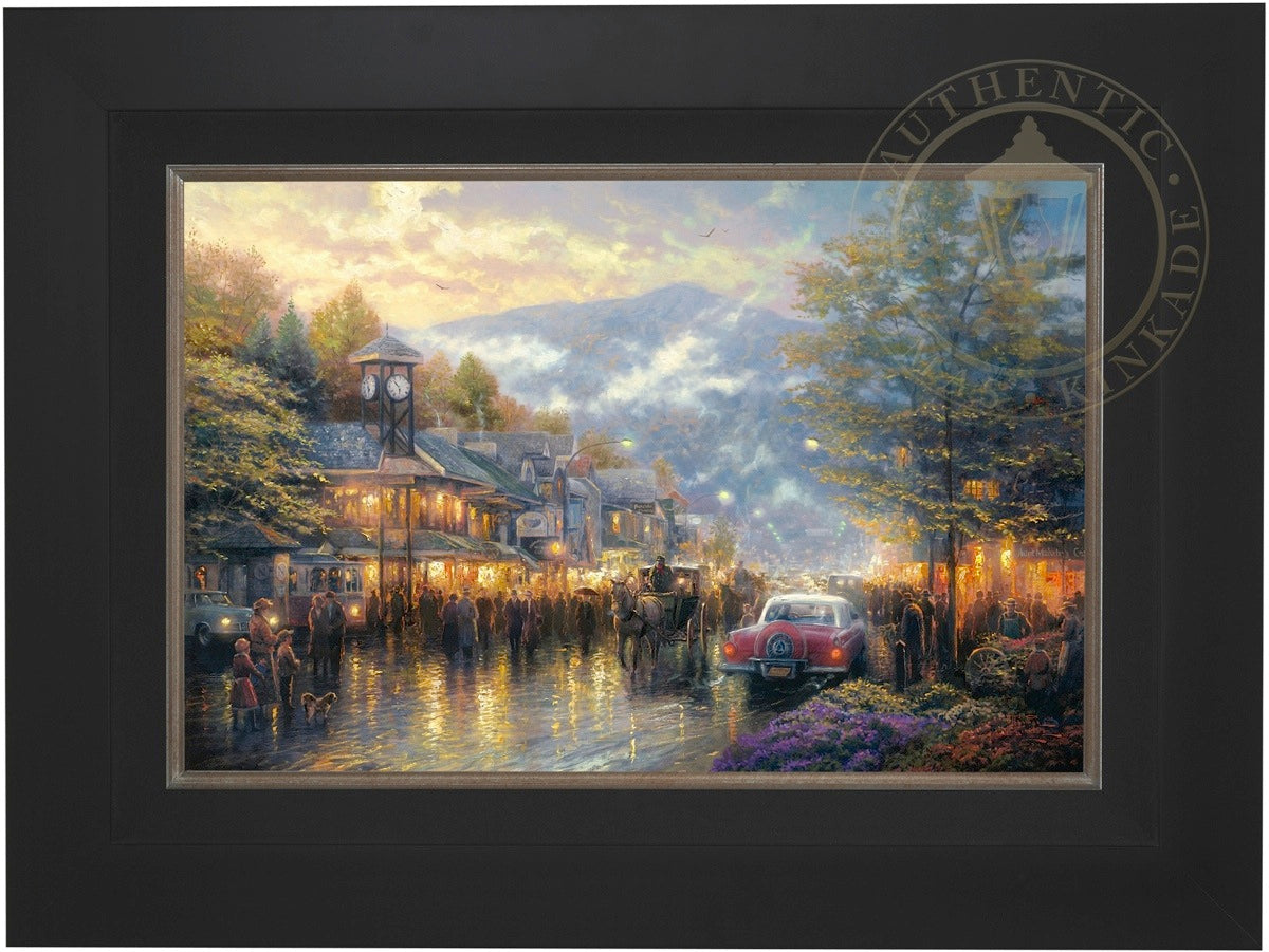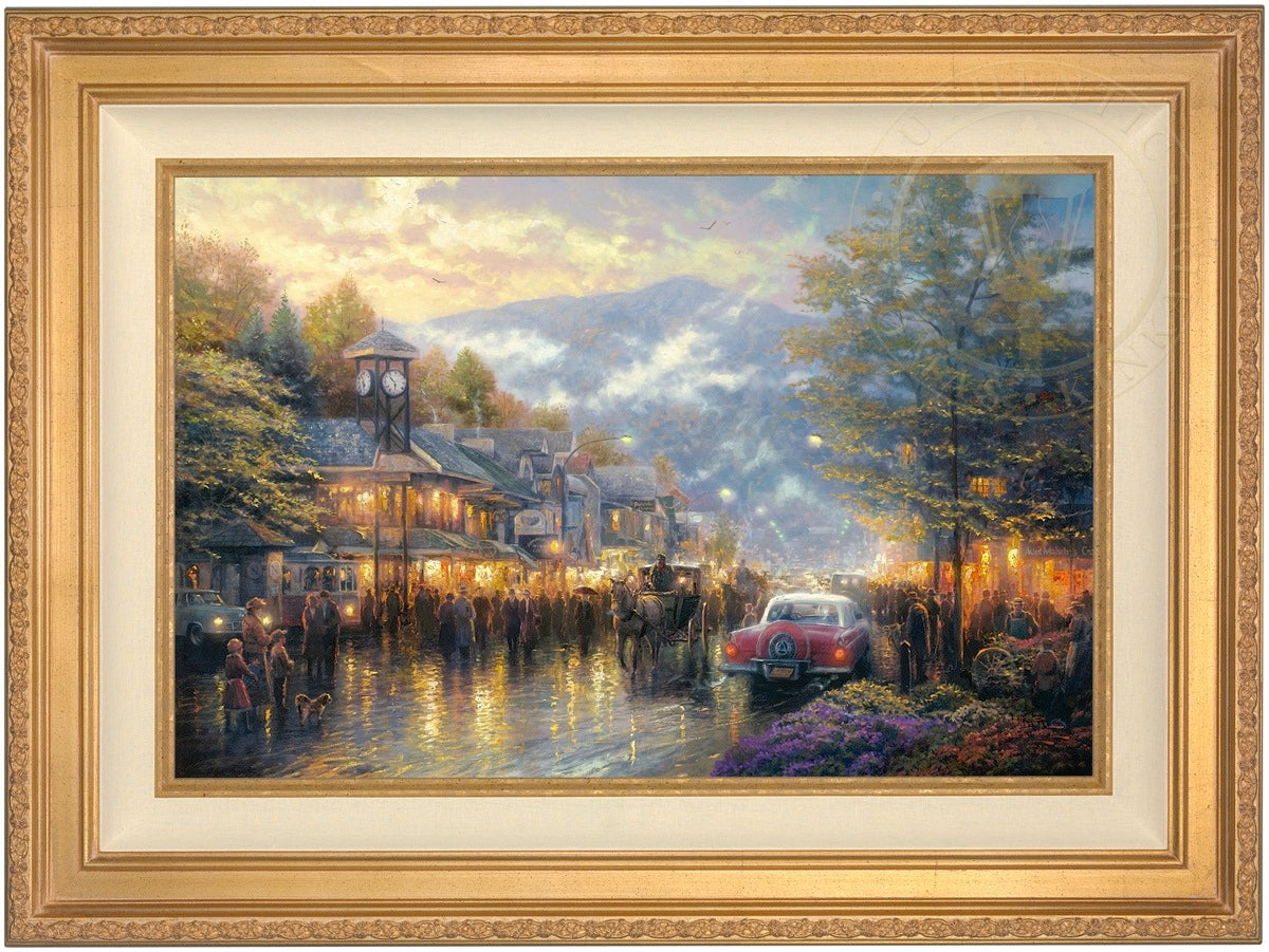 Nestled between dramatic Smoky Mountain peaks, Gatlinburg, Tennessee, touches my boyhood Mountain Memories. I'm celebrating the town's bicentennial by featuring a romanticized vision of its present, as well as honoring its rustic past in my limited edition portrait of the town - Mountain Memories.
