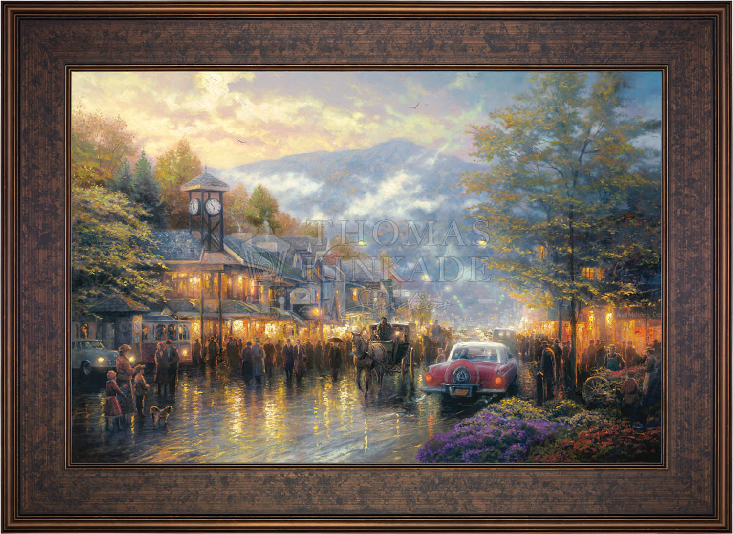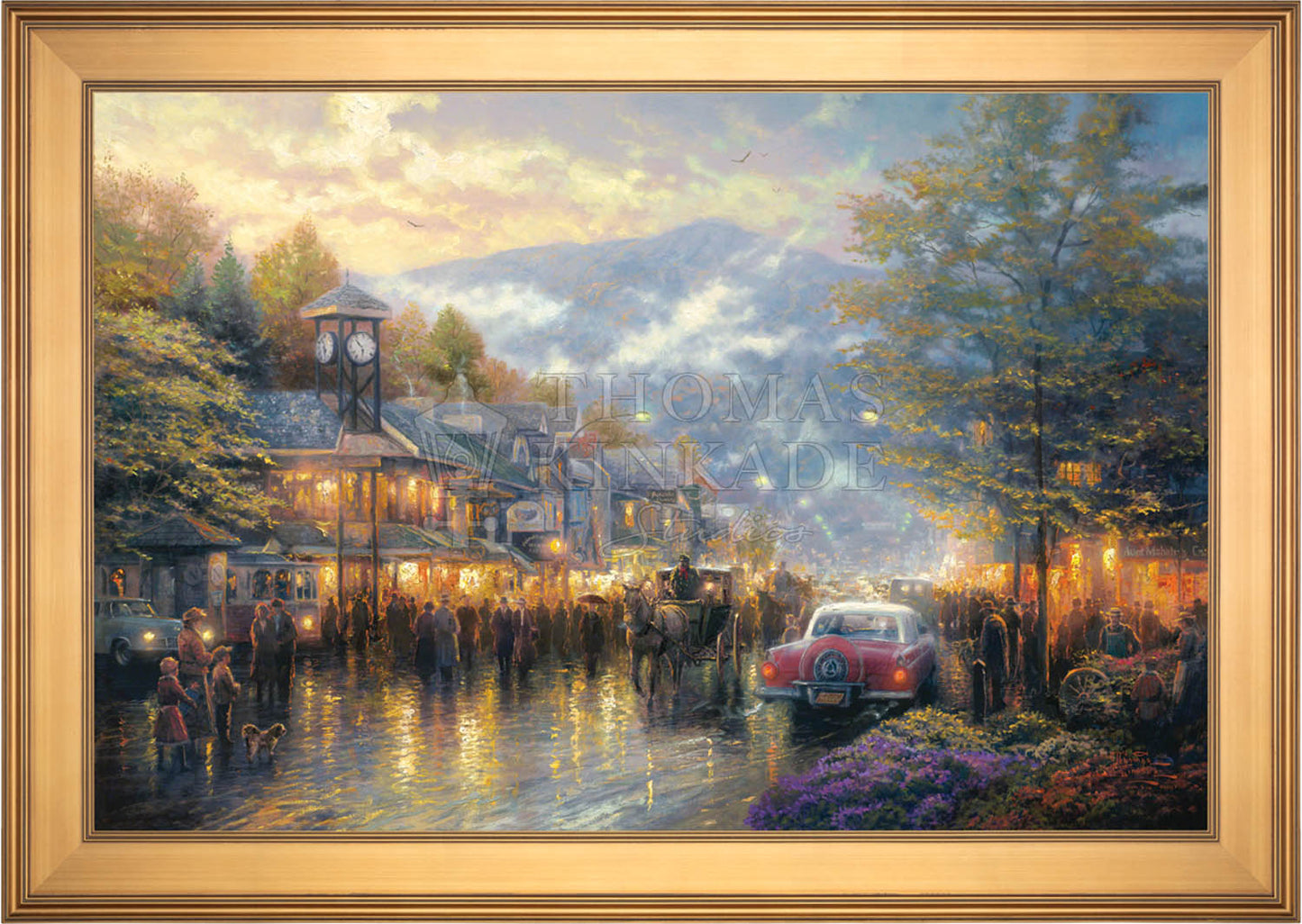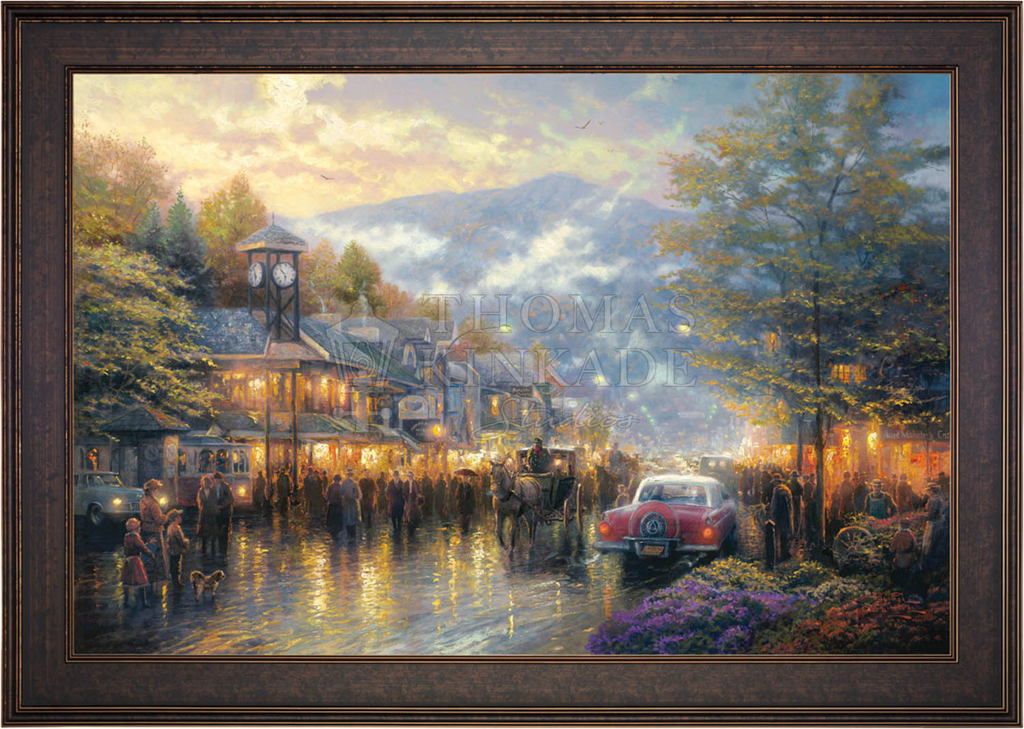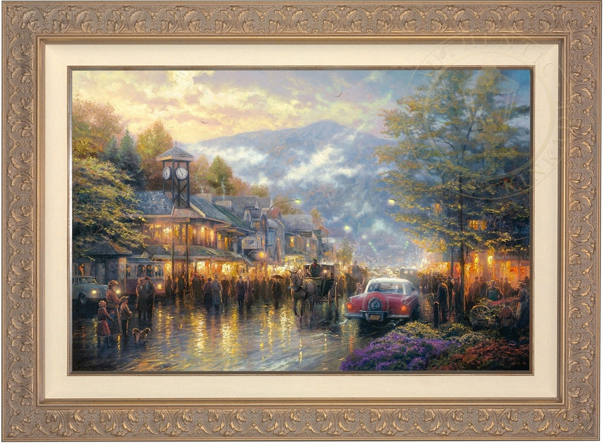 Nestled between dramatic Smoky Mountain peaks, Gatlinburg, Tennessee, touches my boyhood Mountain Memories. I'm celebrating the town's bicentennial by featuring a romanticized vision of its present, as well as honoring its rustic past in my limited edition portrait of the town - Mountain Memories.