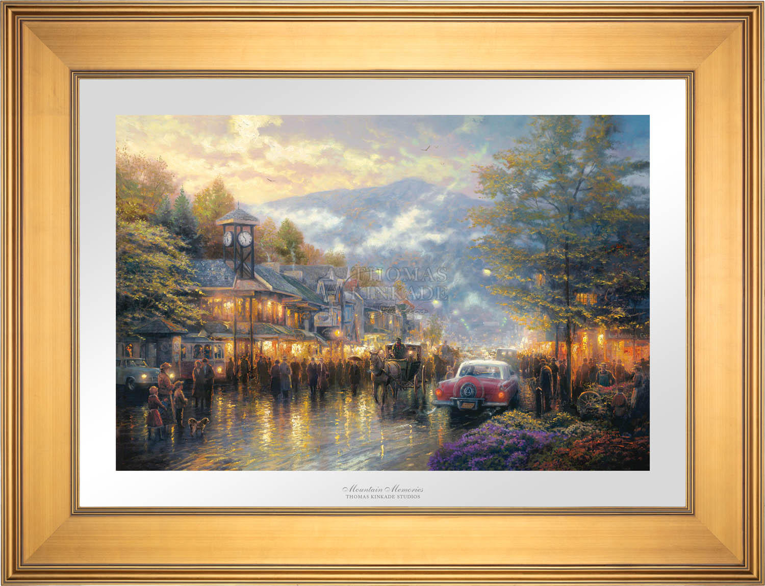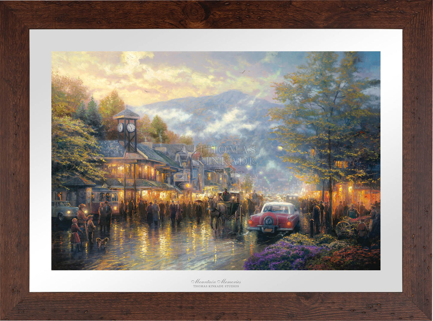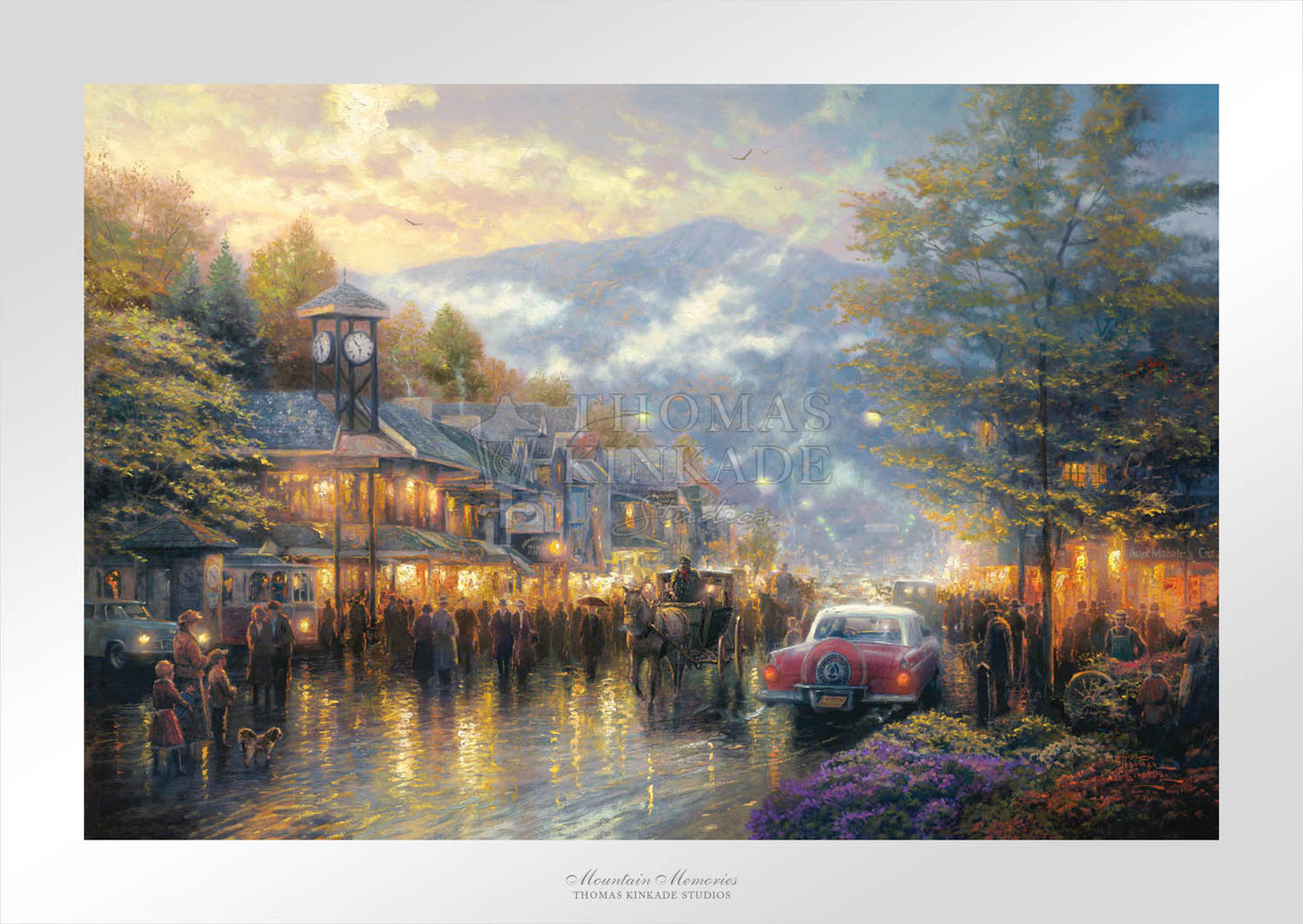 Nestled between dramatic Smoky Mountain peaks, Gatlinburg, Tennessee, touches my boyhood Mountain Memories. I'm celebrating the town's bicentennial by featuring a romanticized vision of its present, as well as honoring its rustic past in my limited edition portrait of the town - Mountain Memories.