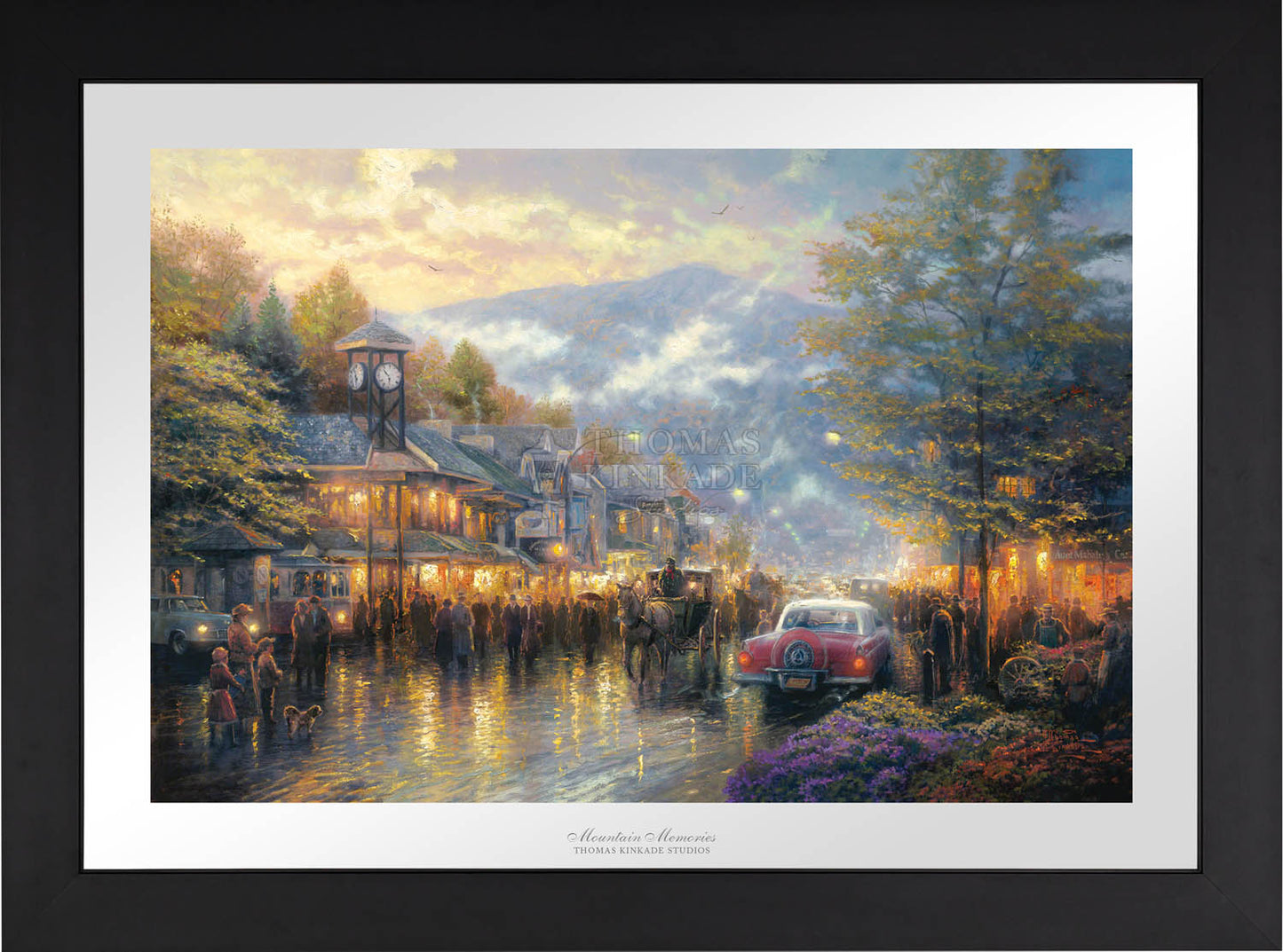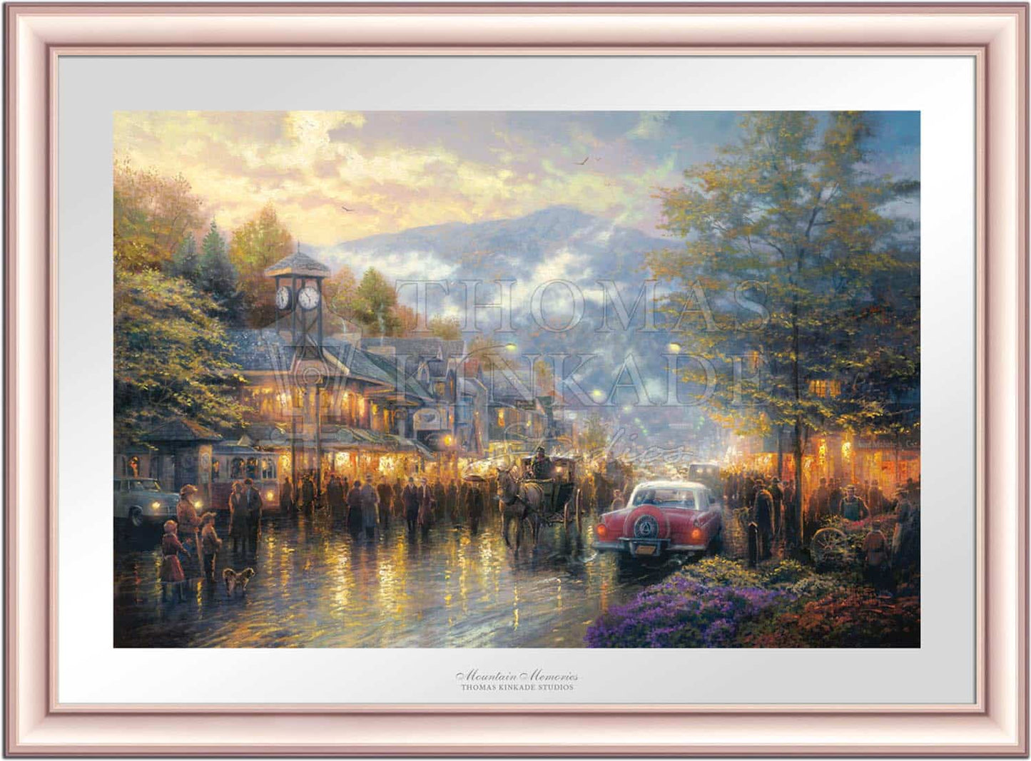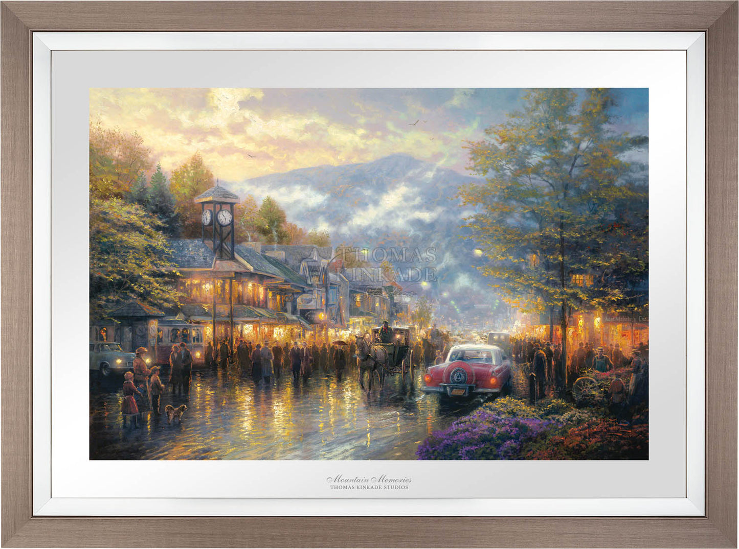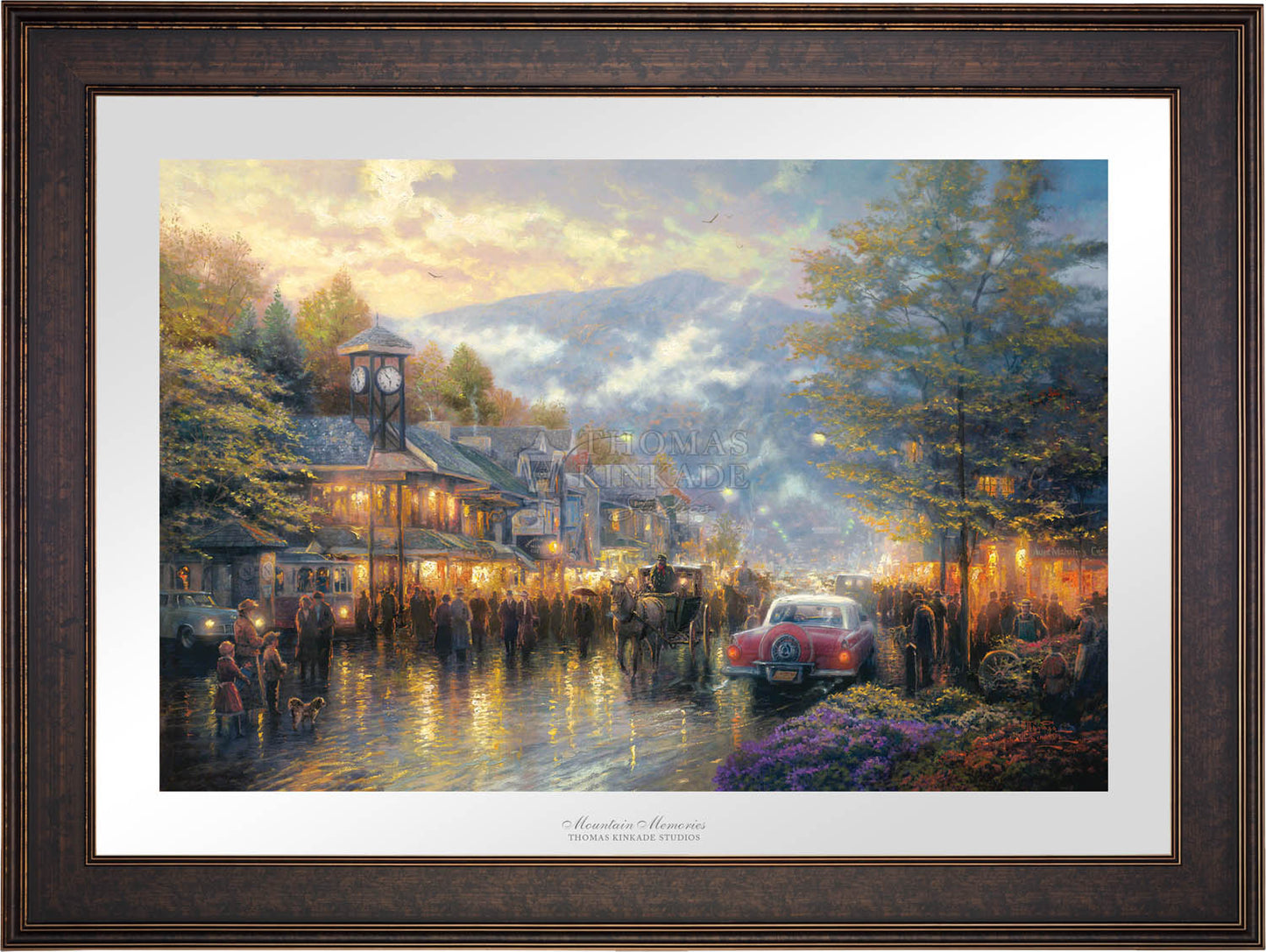 Nestled between dramatic Smoky Mountain peaks, Gatlinburg, Tennessee, touches my boyhood Mountain Memories. I'm celebrating the town's bicentennial by featuring a romanticized vision of its present, as well as honoring its rustic past in my limited edition portrait of the town - Mountain Memories.