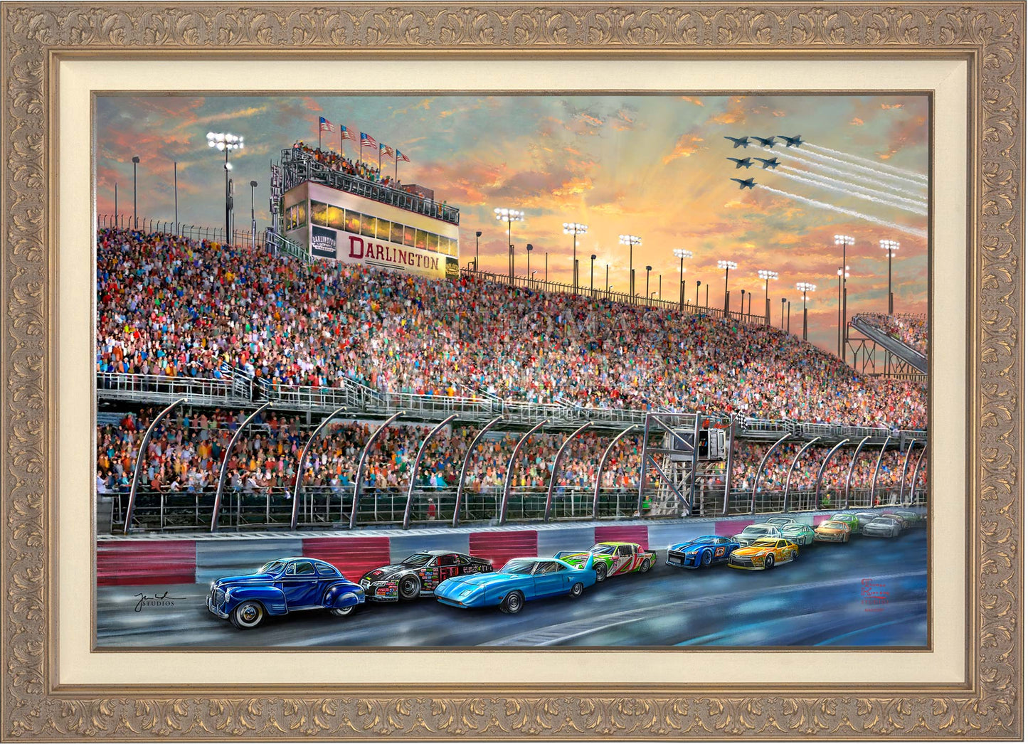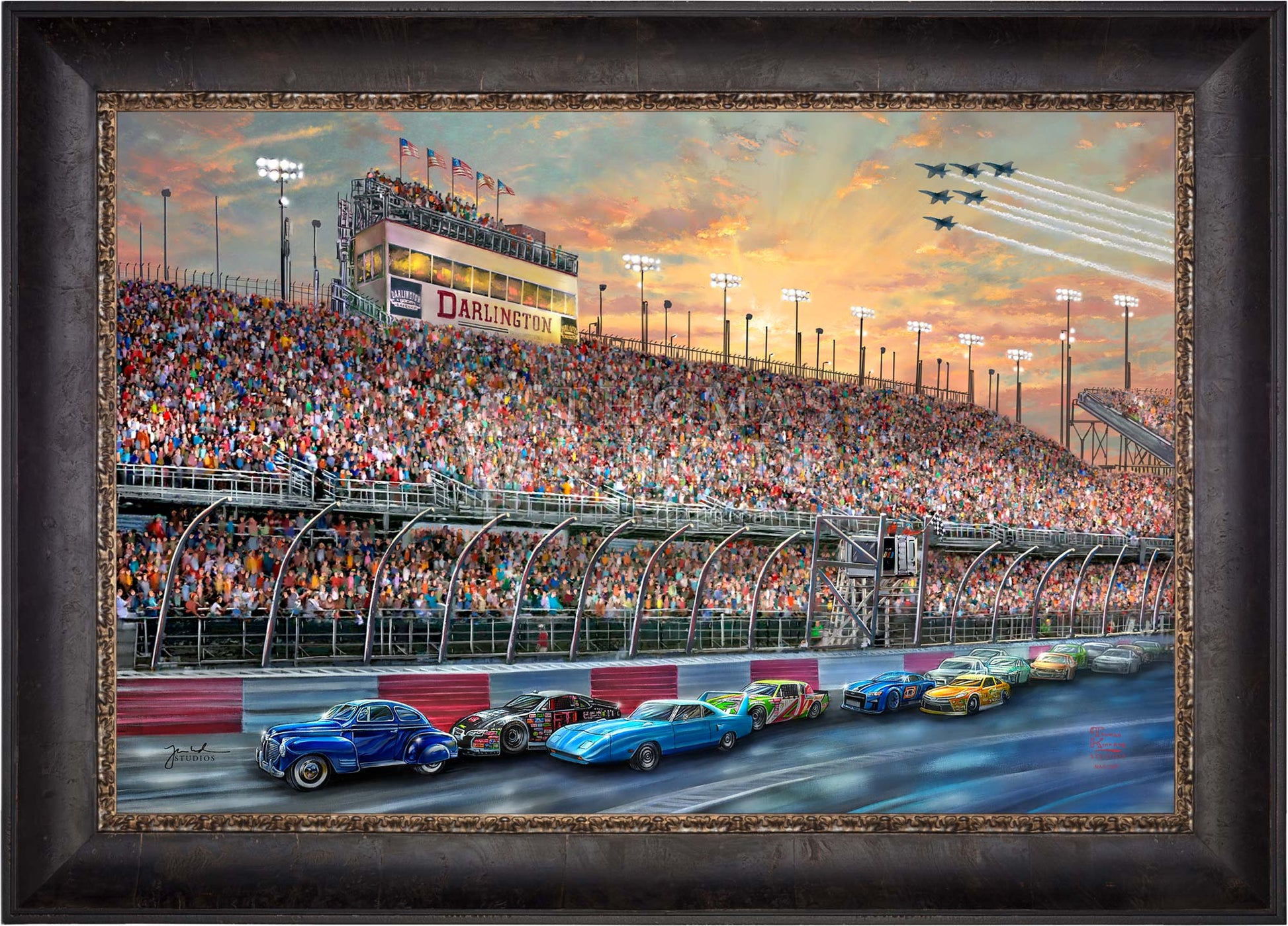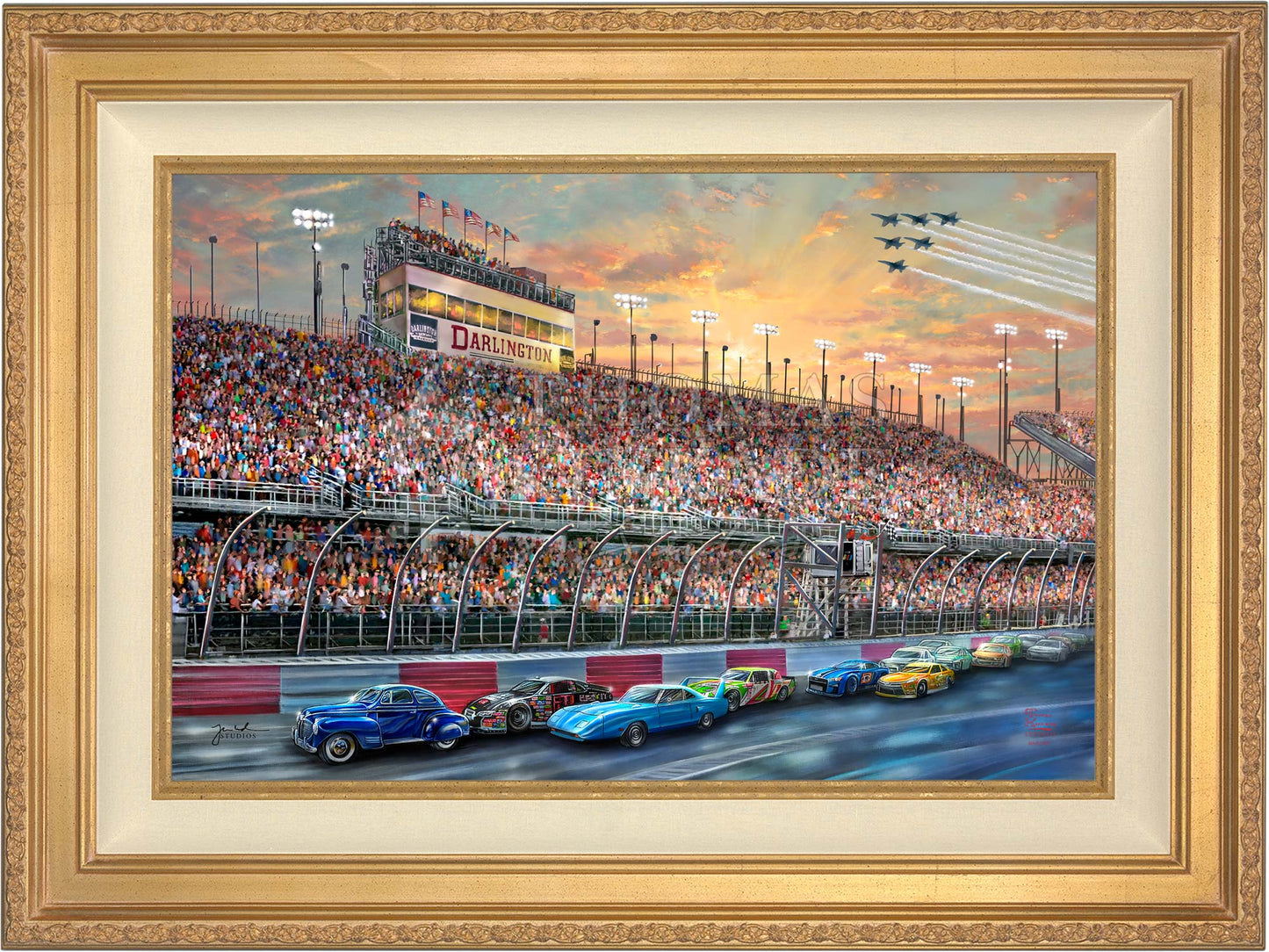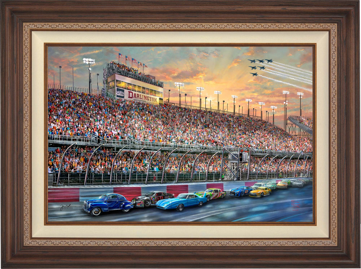 Time drives everyone forward never backwards, and the marking of time is a long-standing tradition. The unique-egg-shaped track and challenging surface at Darlington Raceway has drawn race fans from all over the world since it opened in 1950. The jets have finished their flyover, the sun has started to set and the lights have come on to brighten the jet-black racetrack. In partnership with NASCAR, Thomas Kinkade Studios has captured the checkered flag on all the vintage racecars that have crossed the finish line at legendary Darlington Raceway. Thomas Kinkade Studios is celebrating this very grand anniversary in 75 Years of NASCAR®.