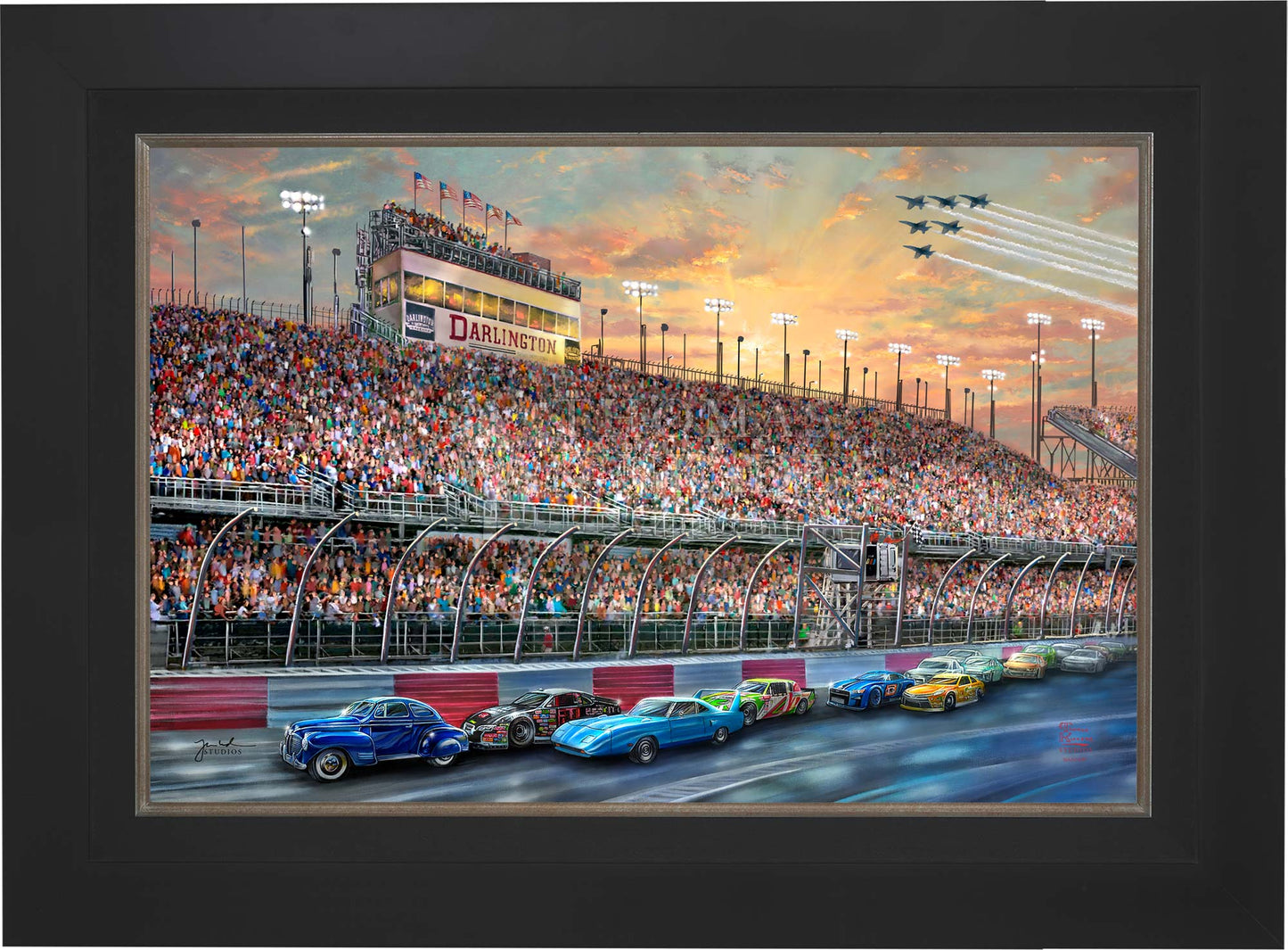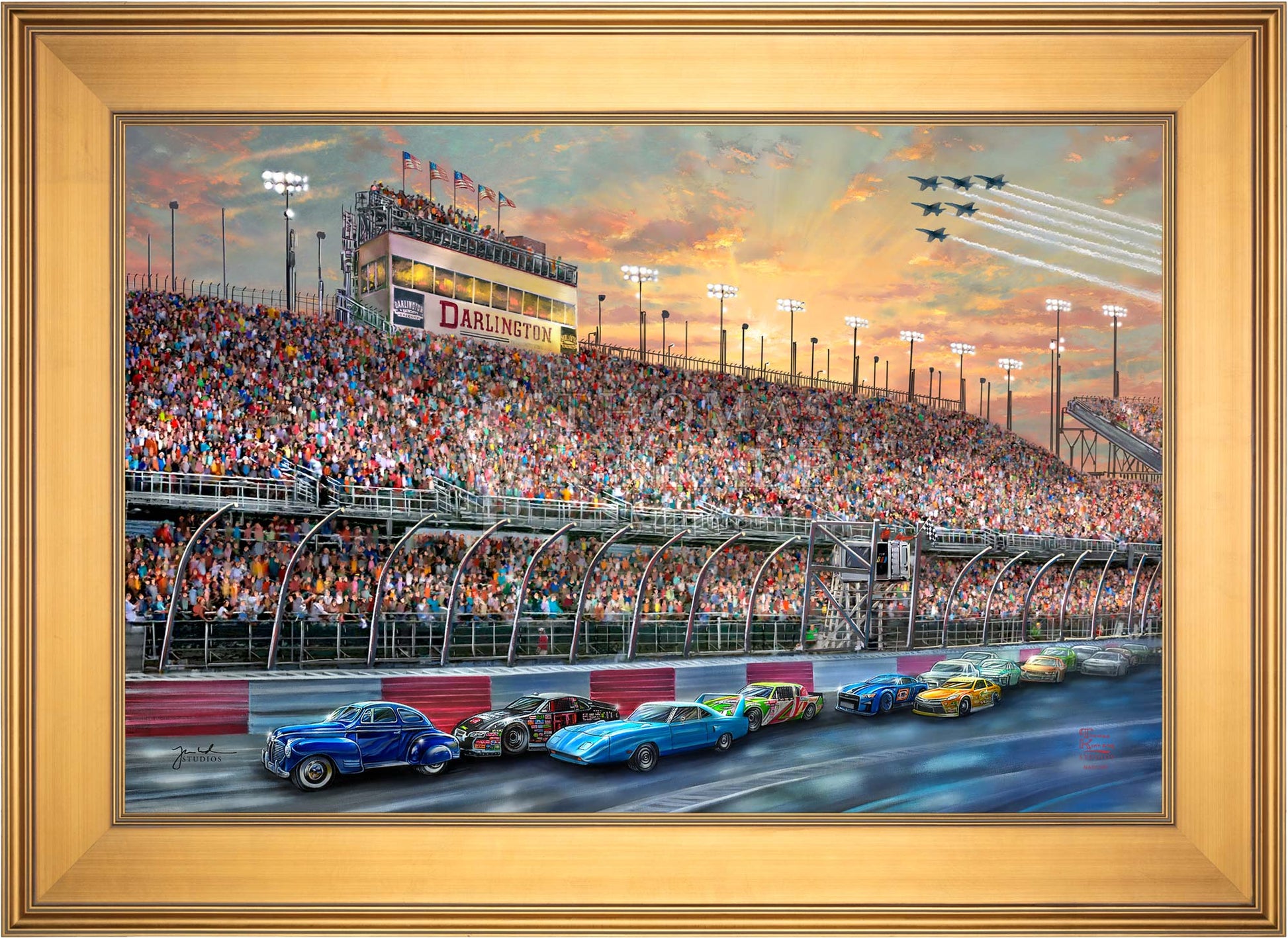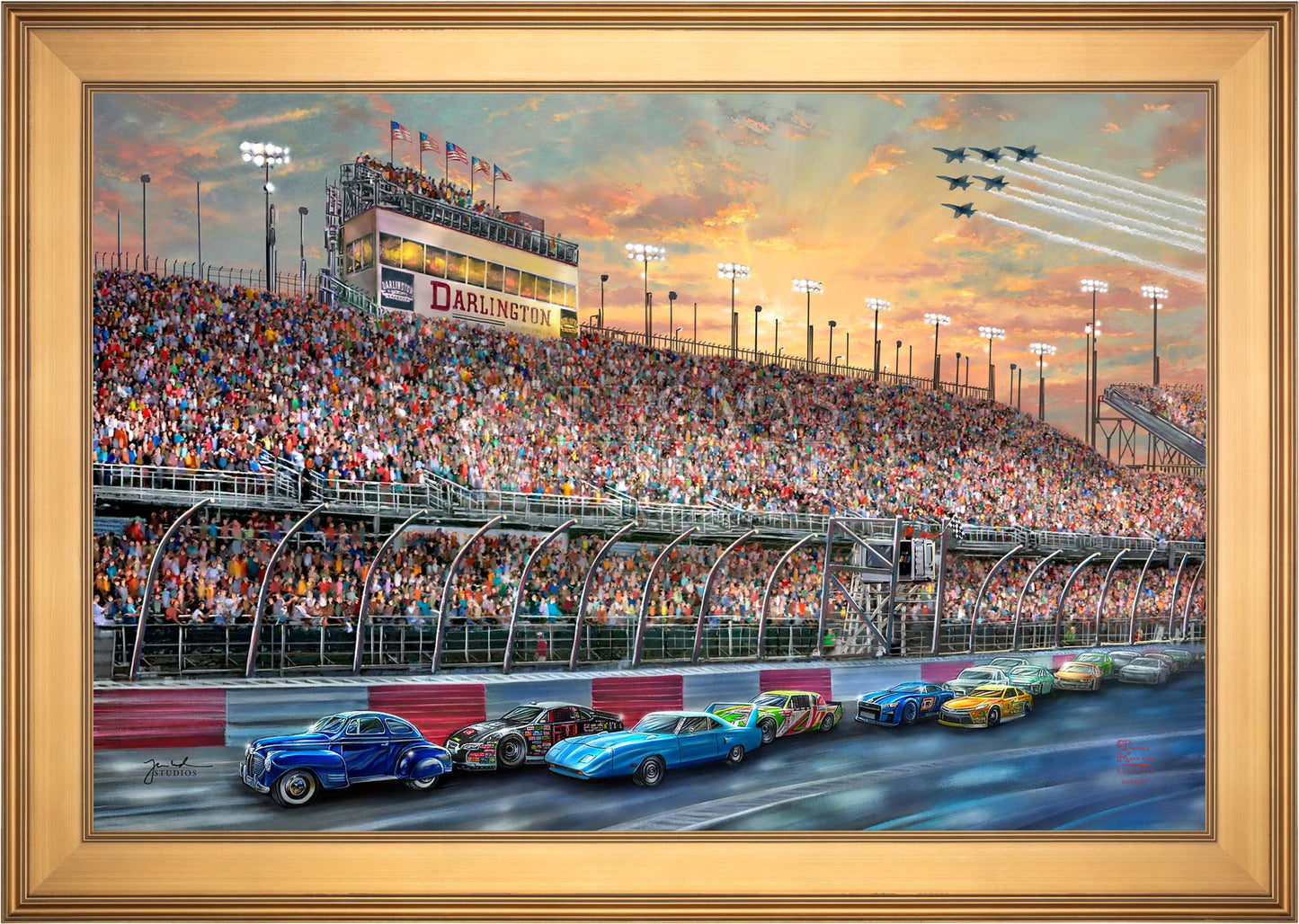 Time drives everyone forward never backwards, and the marking of time is a long-standing tradition. The unique-egg-shaped track and challenging surface at Darlington Raceway has drawn race fans from all over the world since it opened in 1950. The jets have finished their flyover, the sun has started to set and the lights have come on to brighten the jet-black racetrack. In partnership with NASCAR, Thomas Kinkade Studios has captured the checkered flag on all the vintage racecars that have crossed the finish line at legendary Darlington Raceway. Thomas Kinkade Studios is celebrating this very grand anniversary in 75 Years of NASCAR®.