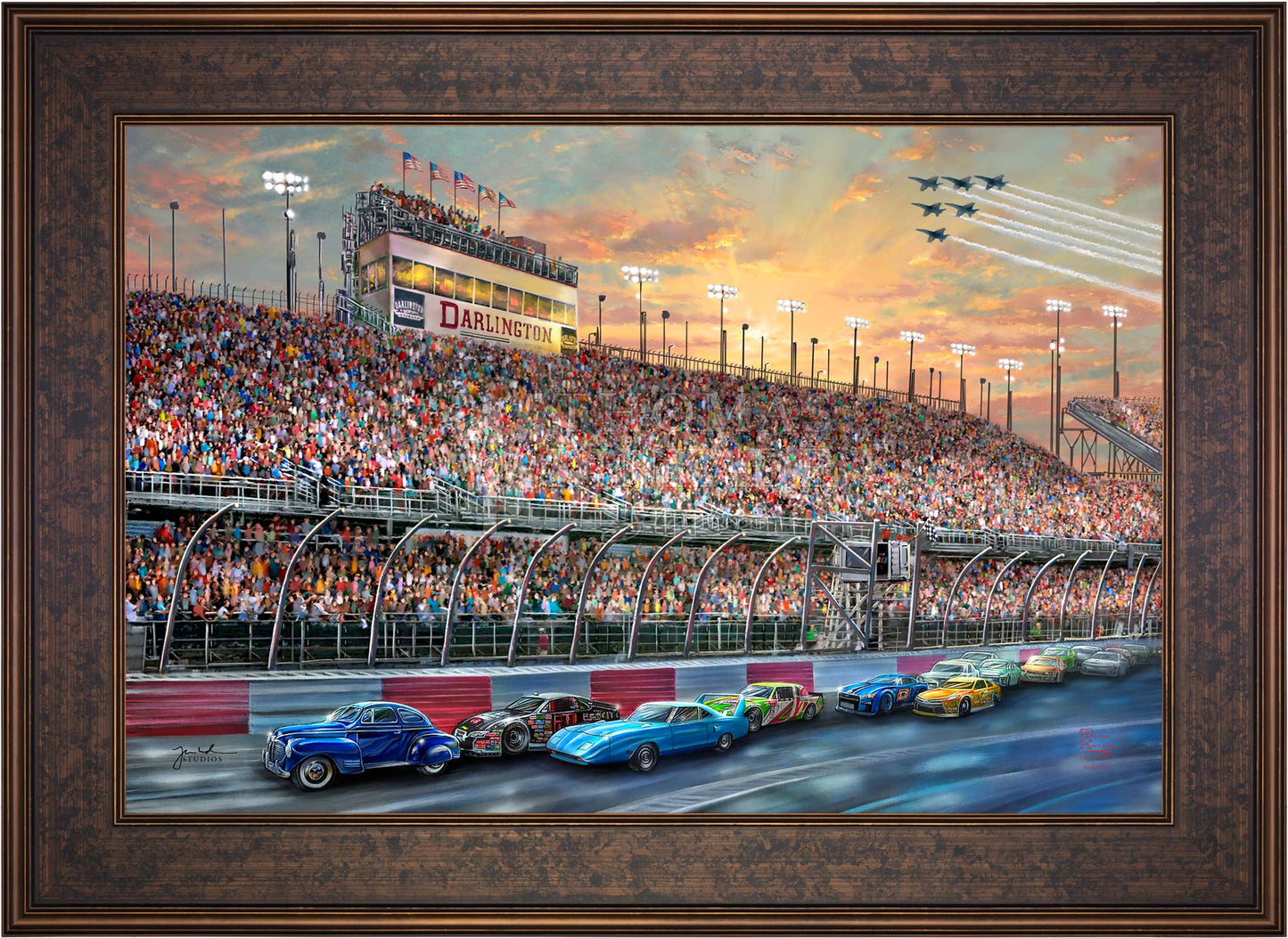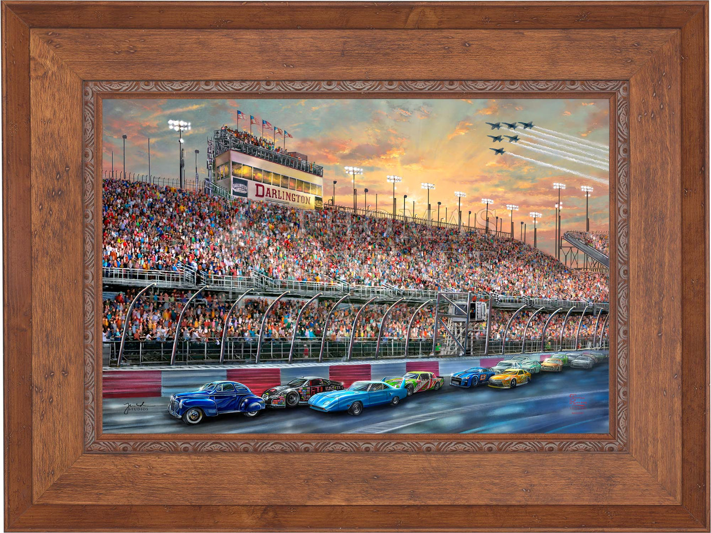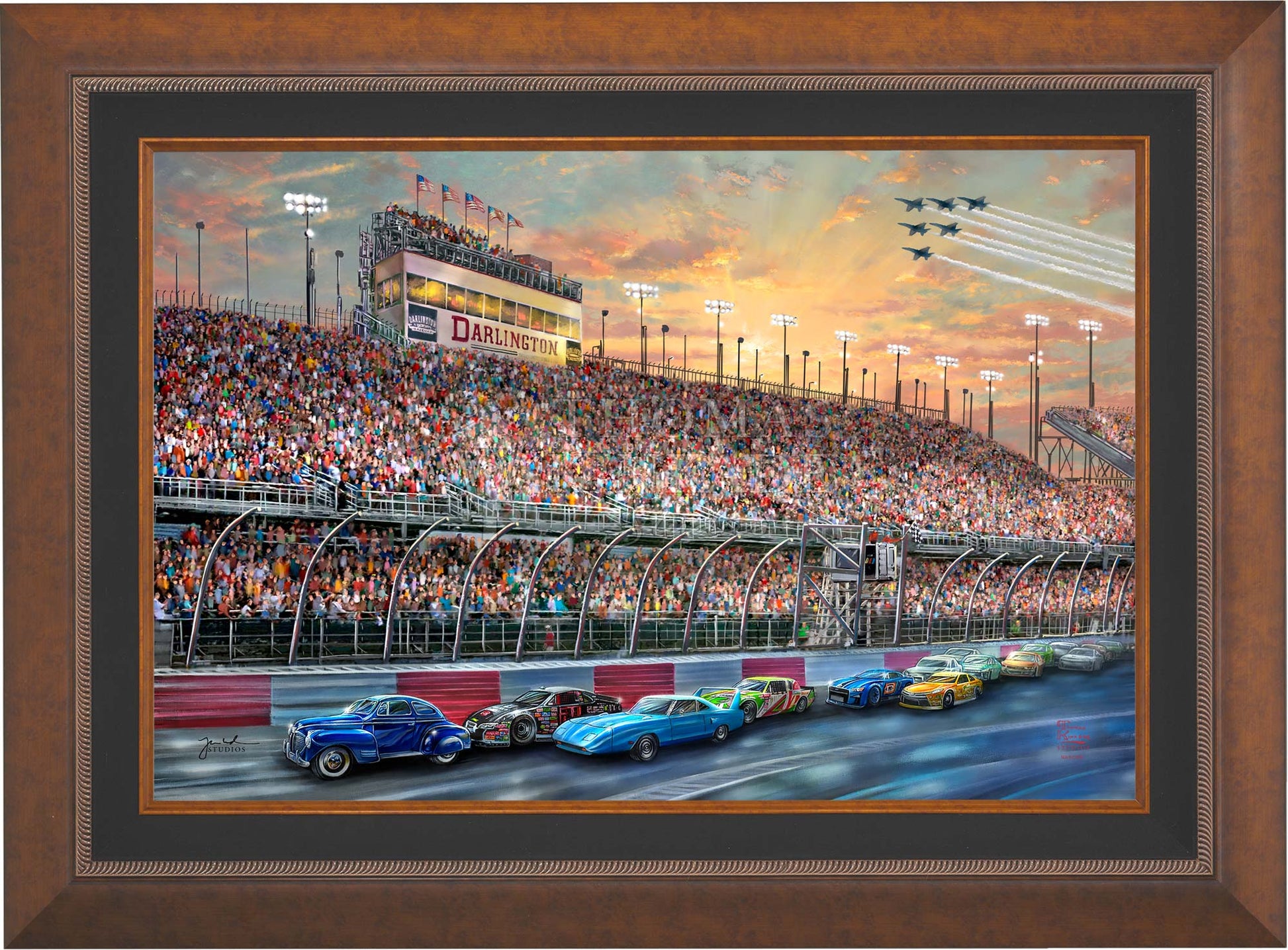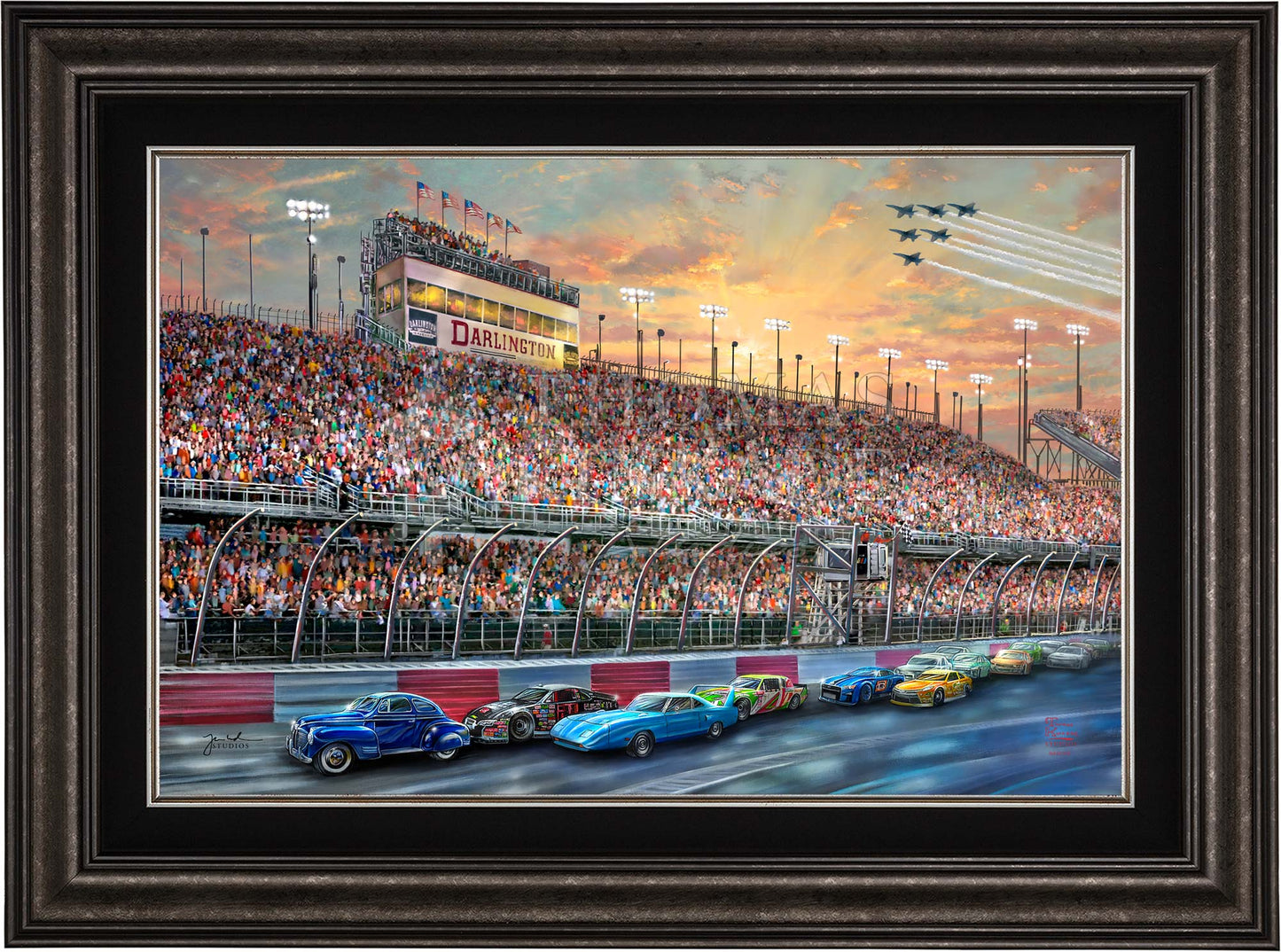 Time drives everyone forward never backwards, and the marking of time is a long-standing tradition. The unique-egg-shaped track and challenging surface at Darlington Raceway has drawn race fans from all over the world since it opened in 1950. The jets have finished their flyover, the sun has started to set and the lights have come on to brighten the jet-black racetrack. In partnership with NASCAR, Thomas Kinkade Studios has captured the checkered flag on all the vintage racecars that have crossed the finish line at legendary Darlington Raceway. Thomas Kinkade Studios is celebrating this very grand anniversary in 75 Years of NASCAR®.