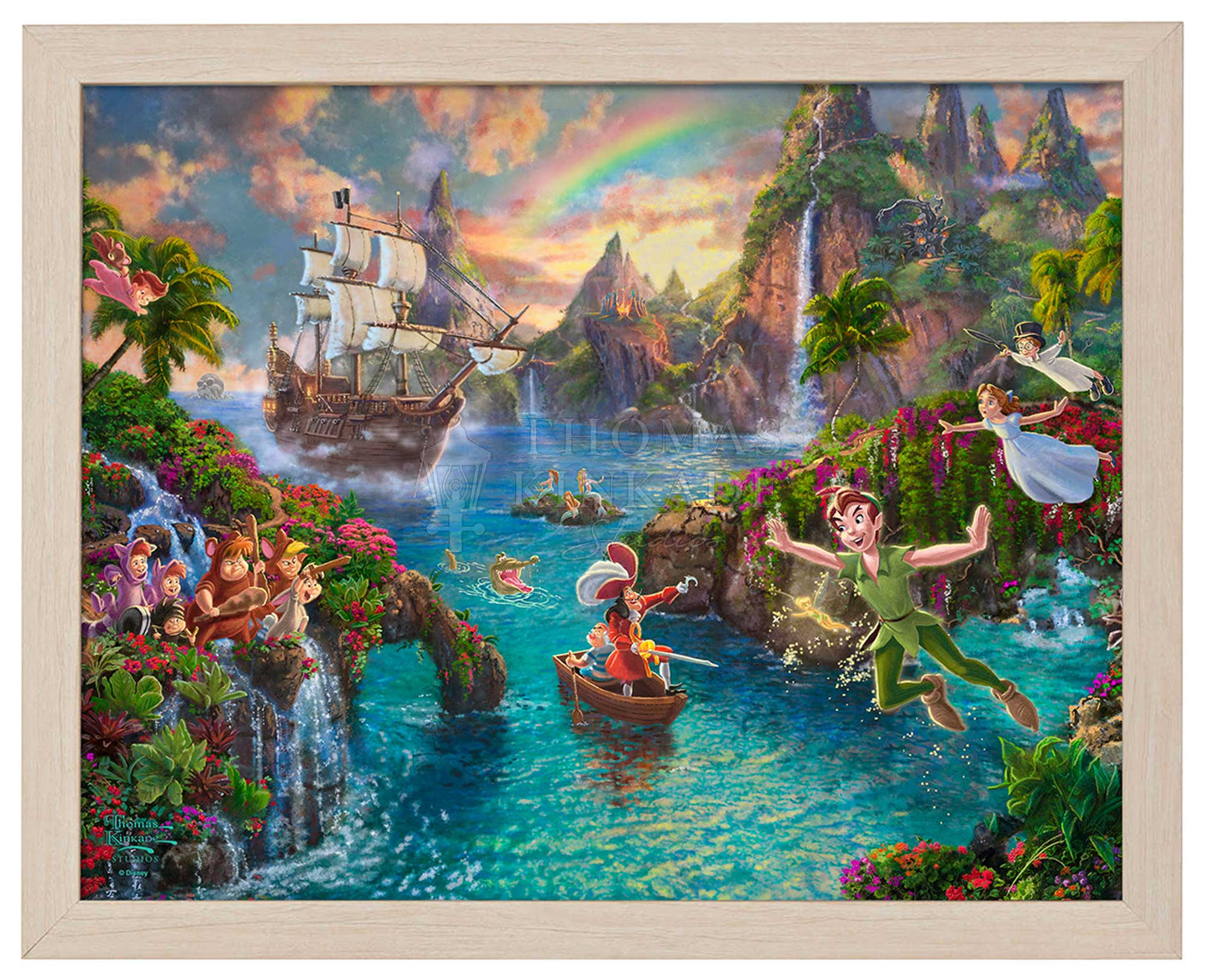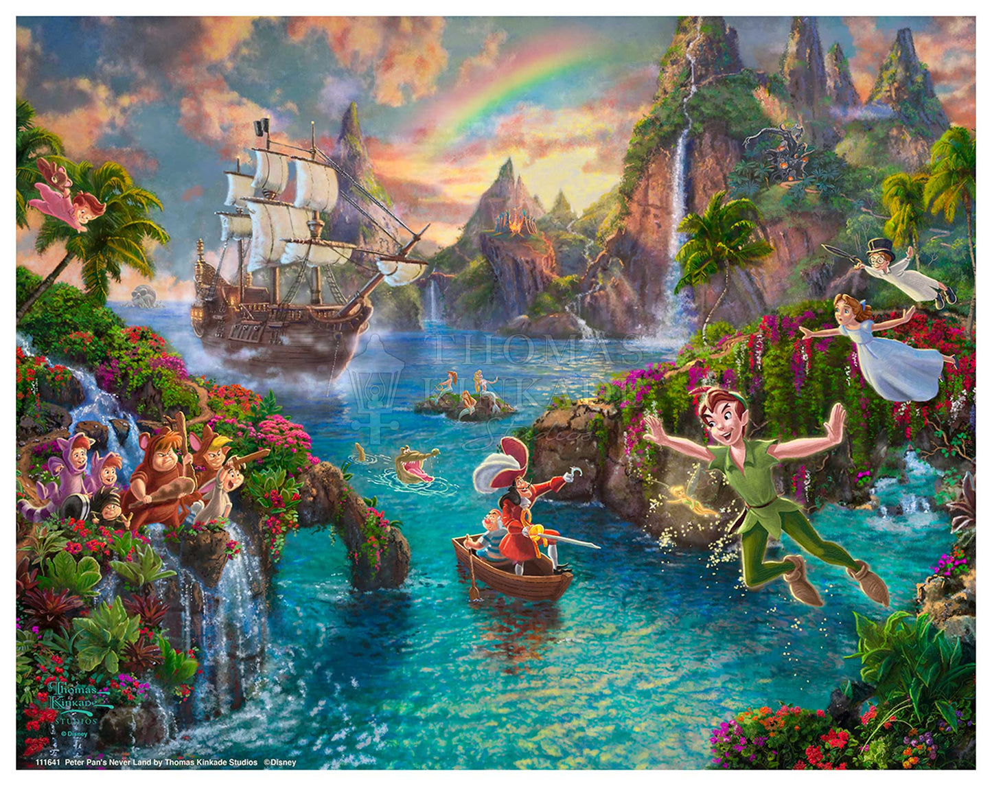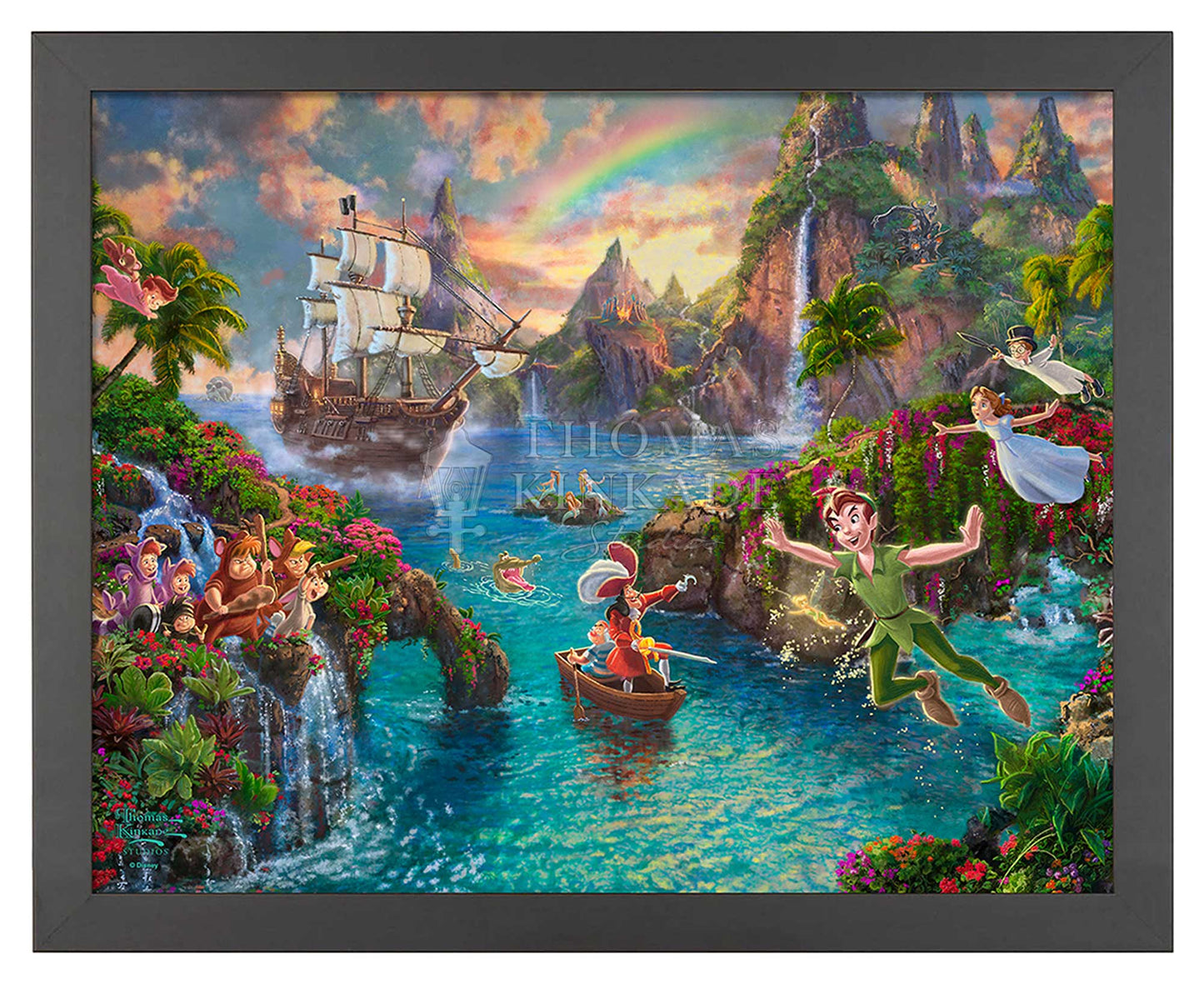 Disney Peter Pan's Never Land by Thomas Kinkade Studios captures the adventure of the magical place that Peter Pan and his friends call home. In this scene, we see Peter battling his nemesis Captain Hook, with the help of Wendy, Michael, John, The Lost Boys, and his beloved pal Tinker Bell. The friends fly together with faith and a dash of pixie dust, while the Mermaids look on and a beautiful rainbow sits brightly in the sky. This painting reminds us that although we may grow up, we should view the world with the wonderment of a child, no matter our age. It also reinforces the fact that the bonds of a true friendship can lift us up throughout our lives.