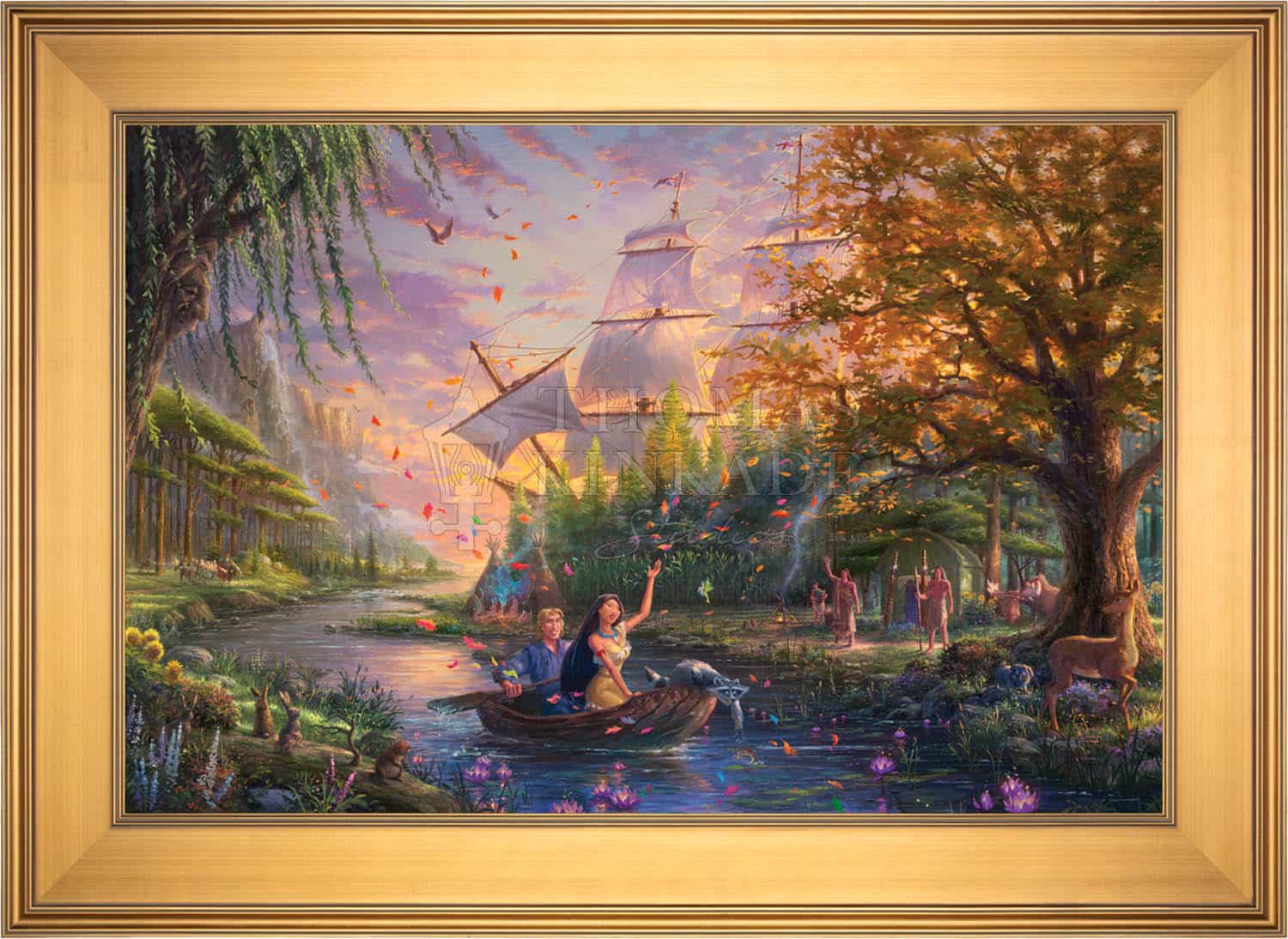 As the evening sun retreats beyond the ship, Susan Constant , and the horizon, a new love is forming between two distant worlds. The artists at Thomas Kinkade Studios have brilliantly captured one of Disney’s most successful box office hits in one scene entitled, “Pocahontas - Colors of Love.” Immersed in traditional Kinkadian light, seen reflecting off the water and illuminating the entire scene, many of the animated characters from the movie, both heroes, and villains, are scattered throughout this narrative panorama. Pocahontas is a story about a free-spirited woman who fights for true love although she has everything working against her, and is a reminder that the color of love conquers all.