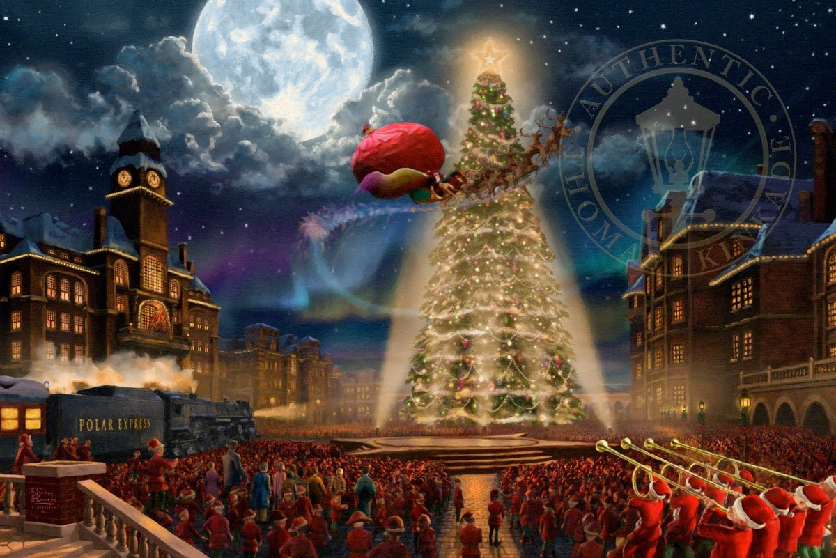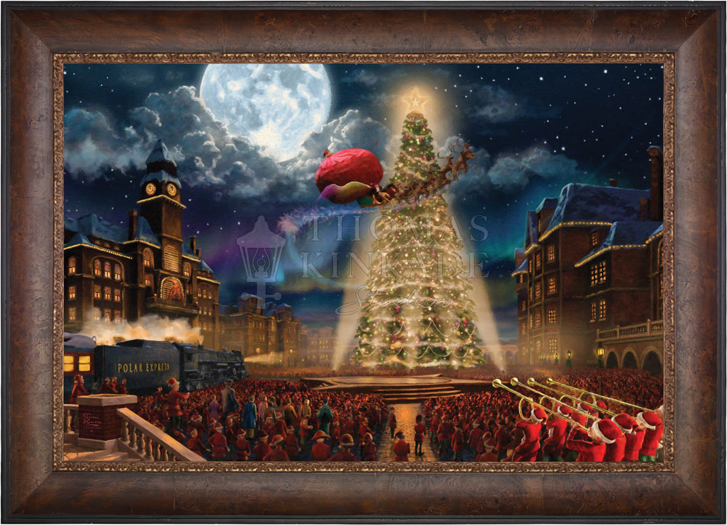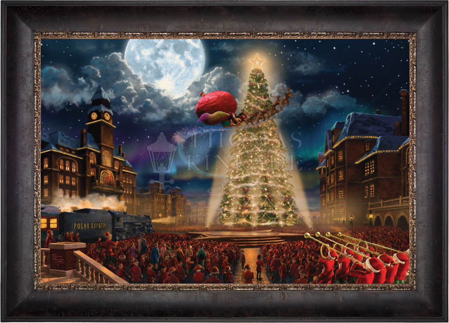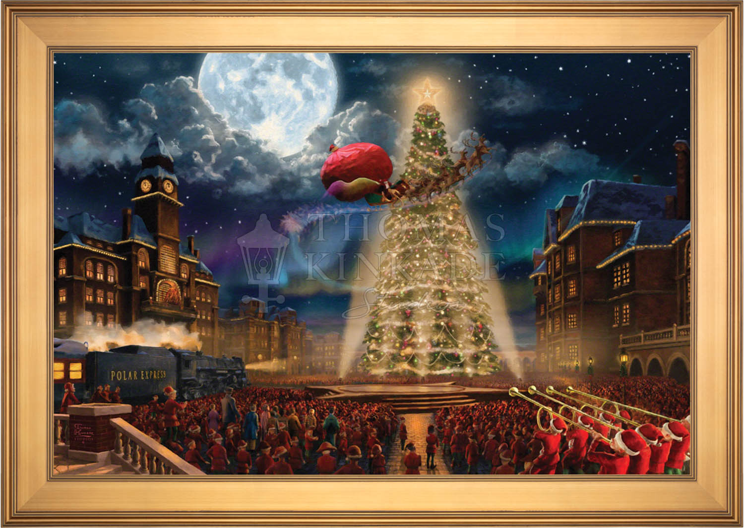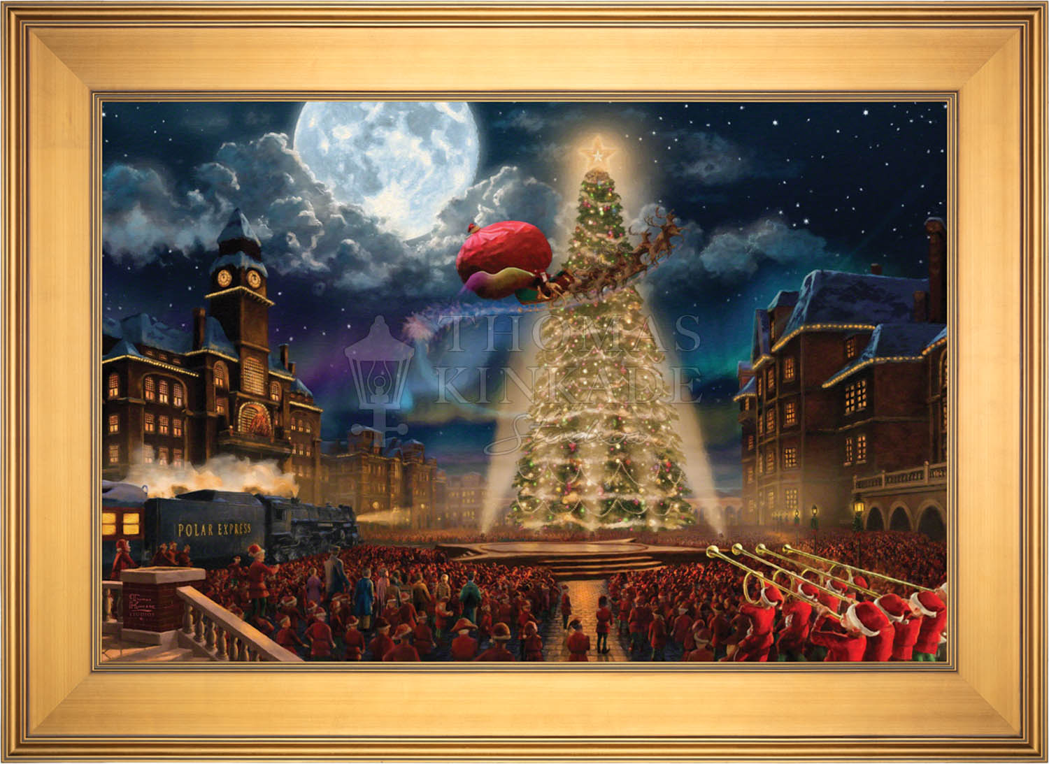We at the Thomas Kinkade Studios are proud to bring Chris Van Allsburg's delightful tale of Christmas magic, The Polar Express to light. It is a story of a wondrous train ride to the North Pole and of Santa's first gift of the season to a boy who believes. The Polar Express captures the climatic scene as Santa rises through the gathered elves to start his night's work while the train waits to deliver the children back home before Christmas morning. As long as one believes, the magic of the holiday will never be lost. Join us in believing again. Remember the laughter of the elves, the wink of Santa, the happiness of the North Pole and the tinkle of a sleigh bell making the most beautiful sound you will ever hear. Seeing is believing, but sometimes the most real things in the world are the things we can't see. The Thomas Kinkade Studios hope that you remember the true spirit of Christmas lies in your heart.
