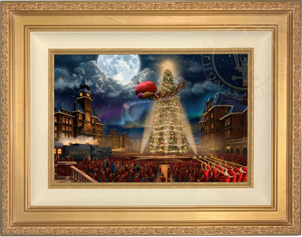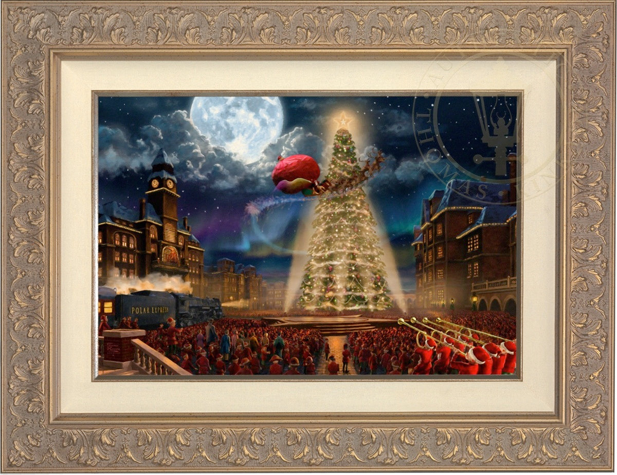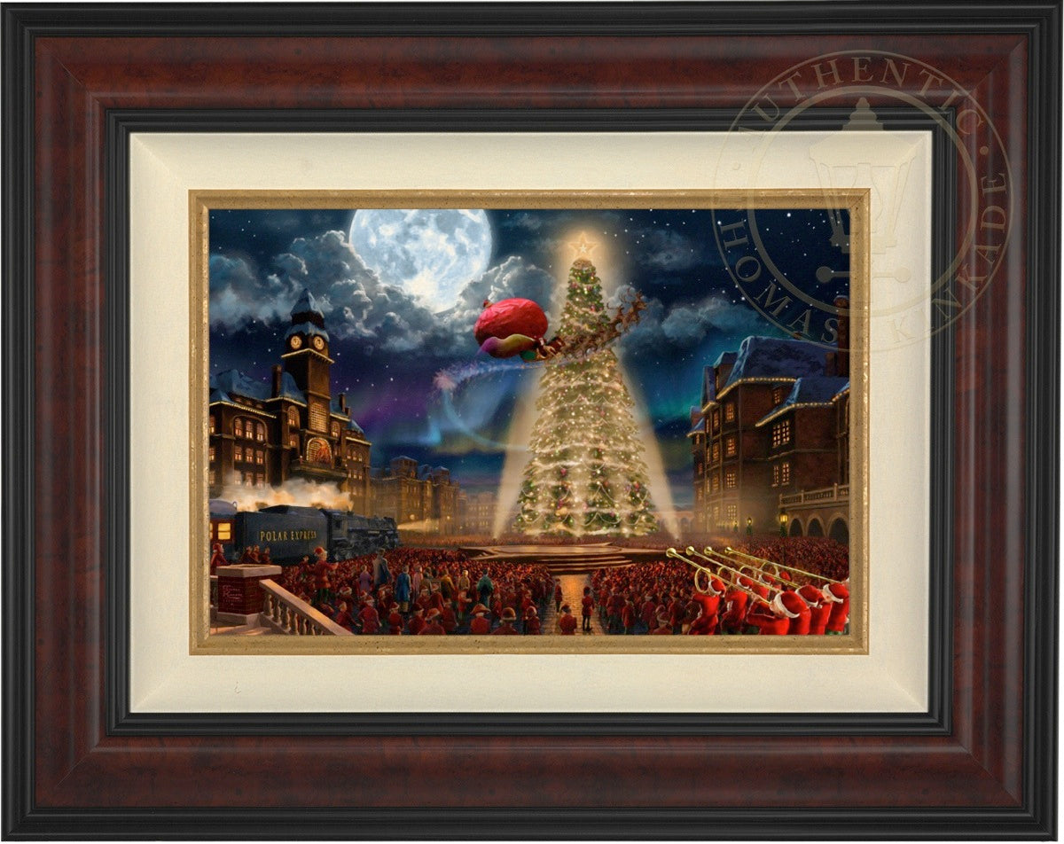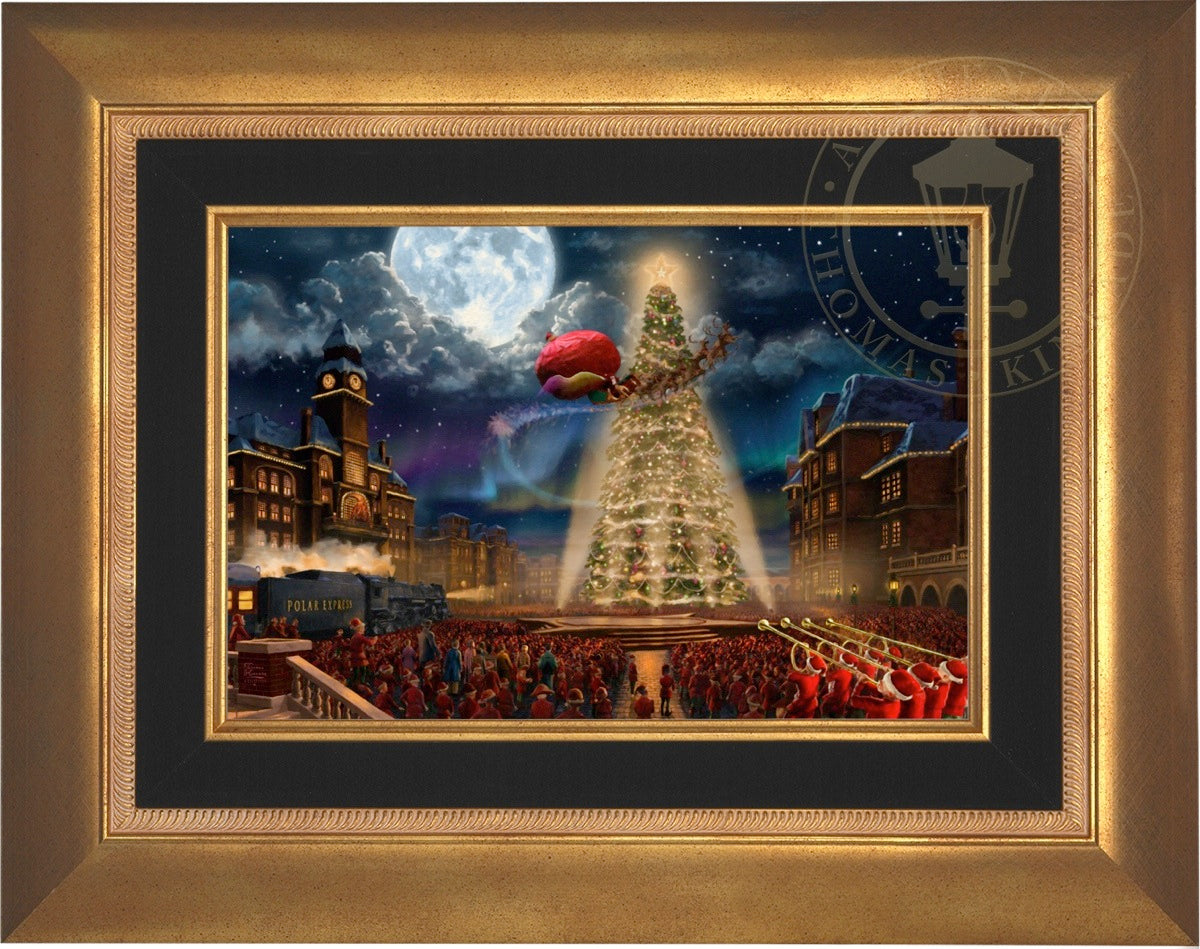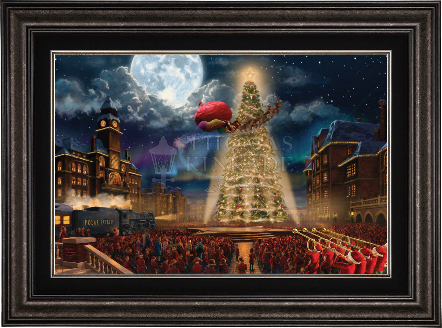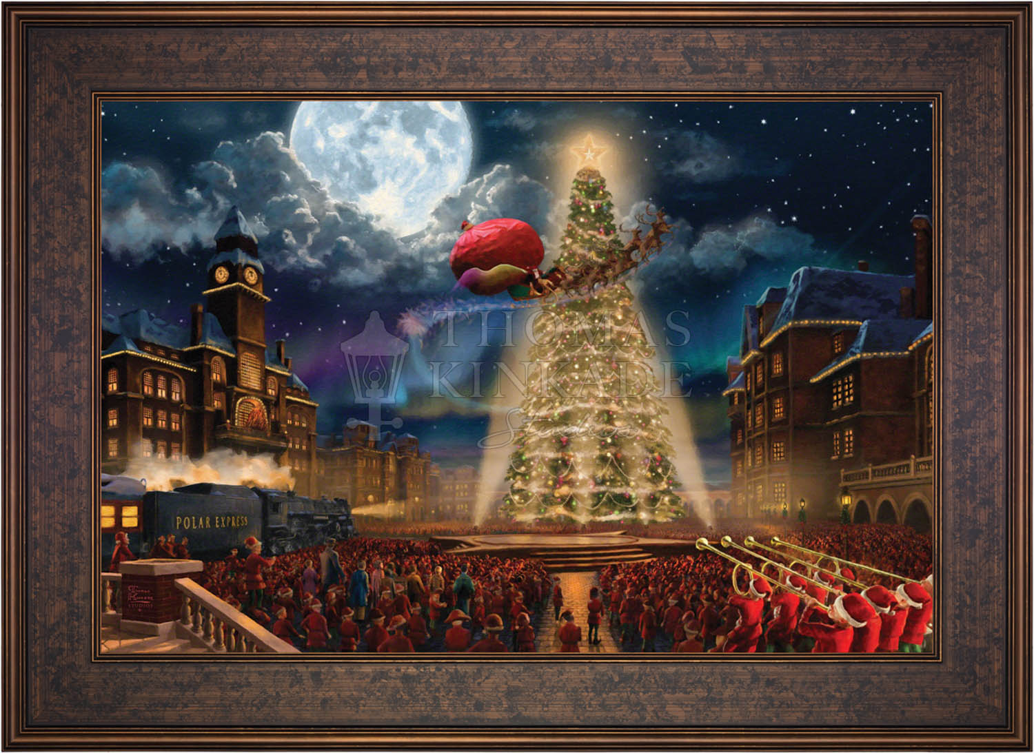 We at the Thomas Kinkade Studios are proud to bring Chris Van Allsburg's delightful tale of Christmas magic, The Polar Express to light. It is a story of a wondrous train ride to the North Pole and of Santa's first gift of the season to a boy who believes. The Polar Express captures the climatic scene as Santa rises through the gathered elves to start his night's work while the train waits to deliver the children back home before Christmas morning. As long as one believes, the magic of the holiday will never be lost. Join us in believing again. Remember the laughter of the elves, the wink of Santa, the happiness of the North Pole and the tinkle of a sleigh bell making the most beautiful sound you will ever hear. Seeing is believing, but sometimes the most real things in the world are the things we can't see. The Thomas Kinkade Studios hope that you remember the true spirit of Christmas lies in your heart.