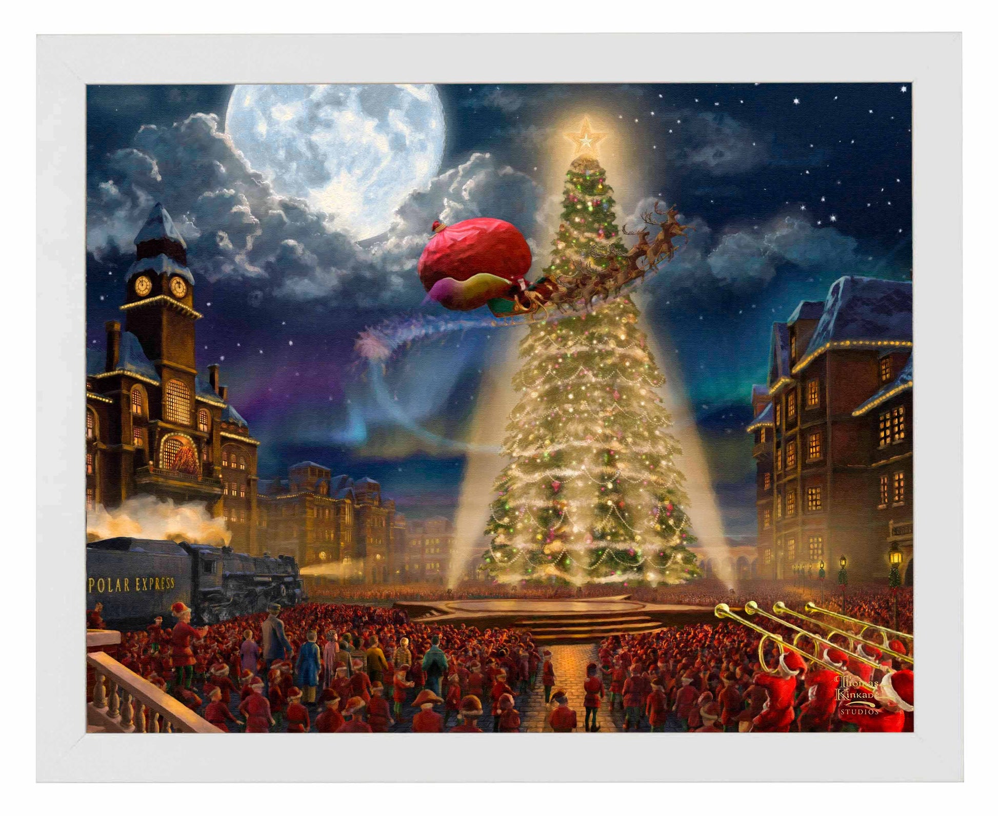 We at the Thomas Kinkade Studios are proud to bring Chris Van Allsburg's delightful tale of Christmas magic, The Polar Express to light. It is a story of a wondrous train ride to the North Pole and of Santa's first gift of the season to a boy who believes. The Polar Express captures the climatic scene as Santa rises through the gathered elves to start his night's work while the train waits to deliver the children back home before Christmas morning. As long as one believes, the magic of the holiday will never be lost. Join us in believing again. Remember the laughter of the elves, the wink of Santa, the happiness of the North Pole and the tinkle of a sleigh bell making the most beautiful sound you will ever hear. Seeing is believing, but sometimes the most real things in the world are the things we can't see. The Thomas Kinkade Studios hope that you remember the true spirit of Christmas lies in your heart.