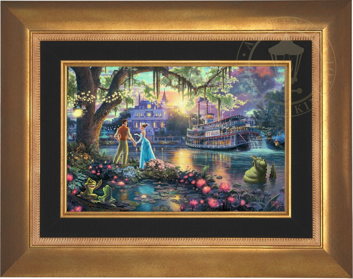 Walt Disney said it all began with a mouse, and in the newest Disney movie classic you might say it all begins with a frog. Disney The Princess and the Frog has been brought to life with hand-drawn animation techniques, making it the first Disney traditional animation classic in years as well as the first ever to be set in the enchanted city of New Orleans. In my painting I wanted to suggest the look of traditional animation yet maintain the sense of painterly mood that my work is known for. I lavished detail into the bayou flowers glowing with hidden fireflies, as well as the curving live oak draped with lacey Spanish moss. The characters of the movie swirl about the composition, inviting us to ponder the part each plays in the story. As the first piece in my Disney Discoveries Collection , Disney The Princess and the Frog will no doubt experience an enthusiastic welcome by Disney and Kinkade fans worldwide. At its core, Disney The Princess and the Frog painting, like the movie itself, portrays a romantic love story. And who can resist a love story?