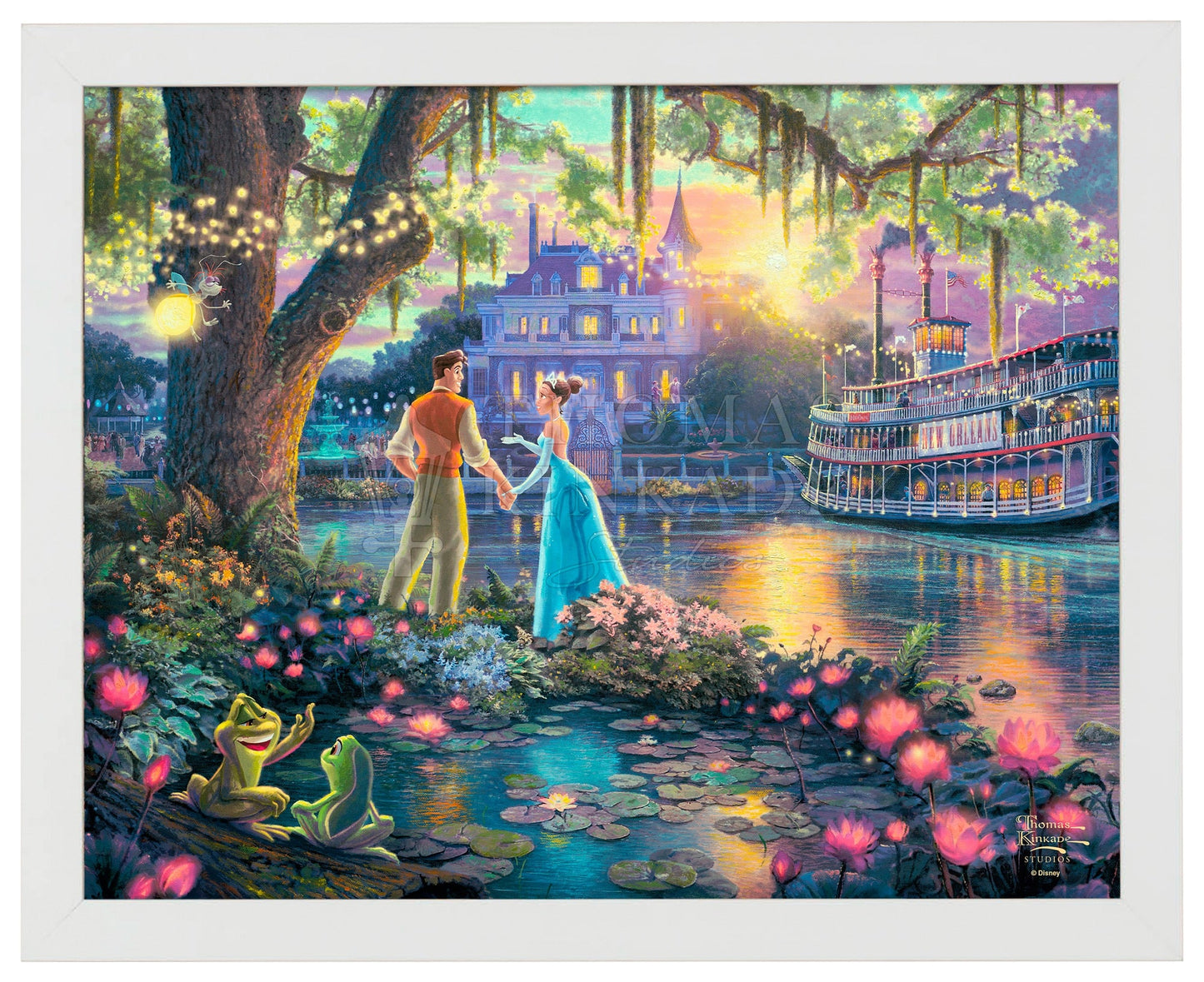 As the first piece in my Disney Discoveries Collection, Disney The Princess and the Frog will no doubt experience an enthusiastic welcome by Disney and Kinkade fans worldwide. At its core, Disney The Princess and the Frog painting, like the movie itself, portrays a romantic love story. And who can resist a love story?
