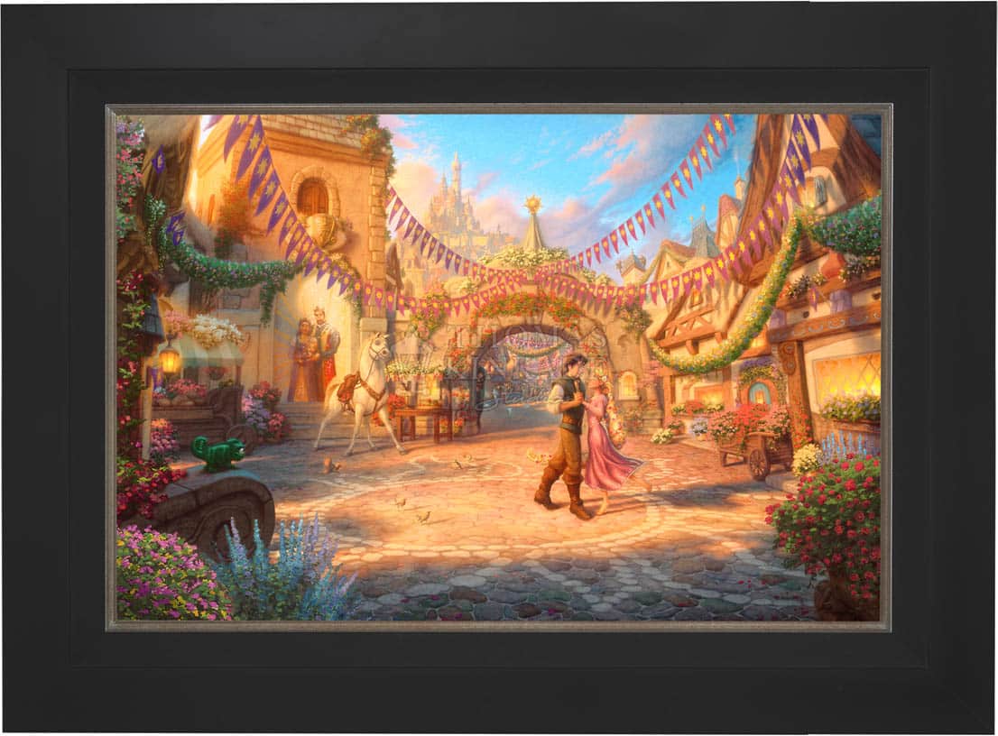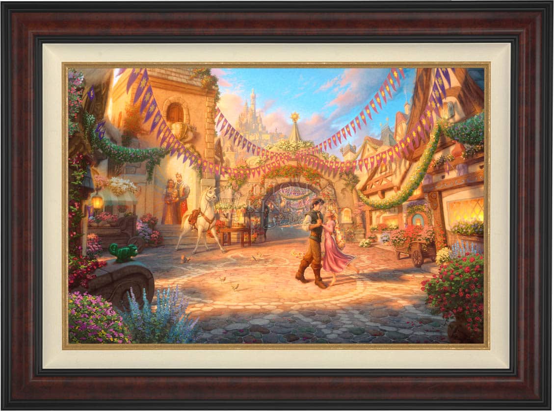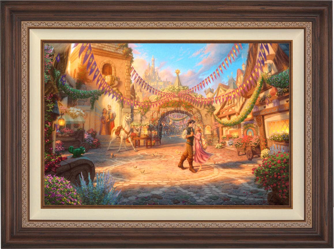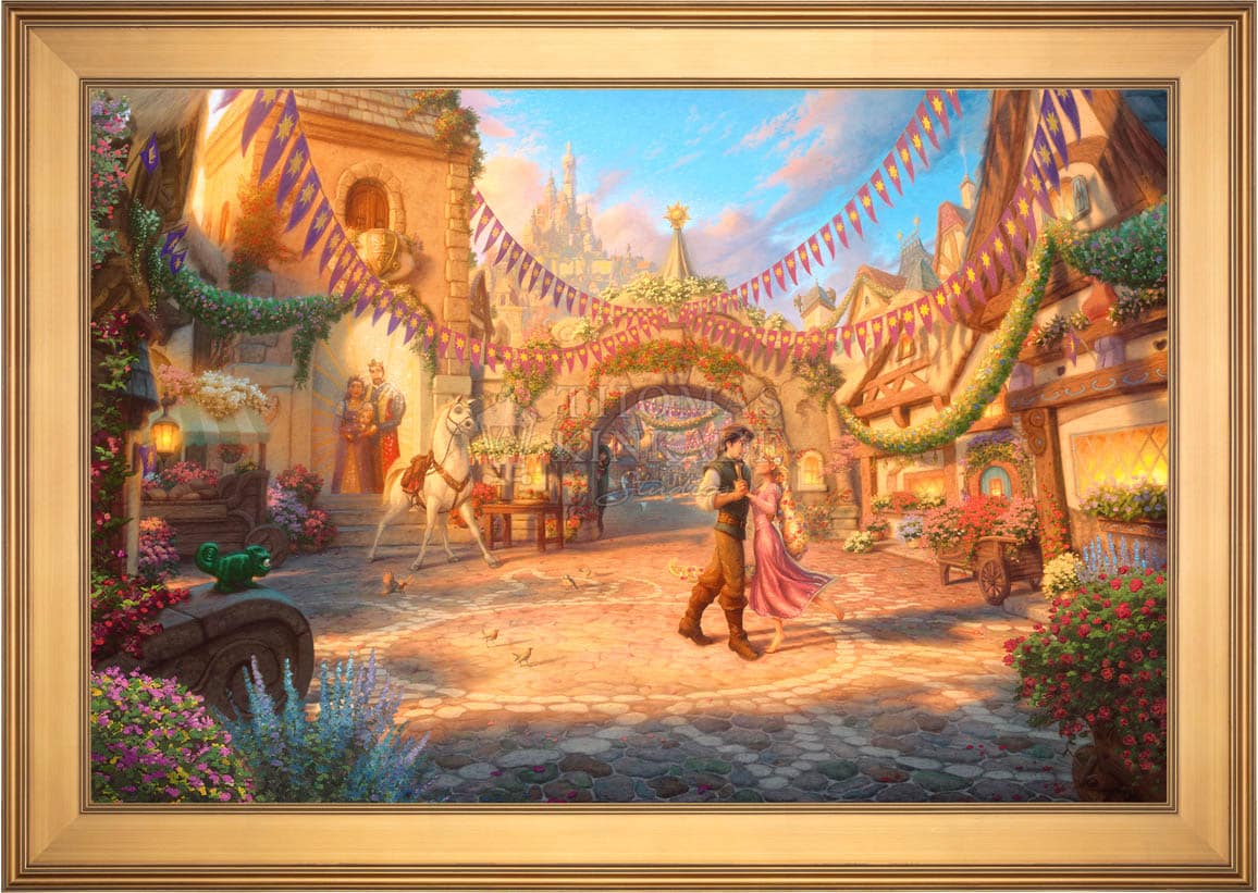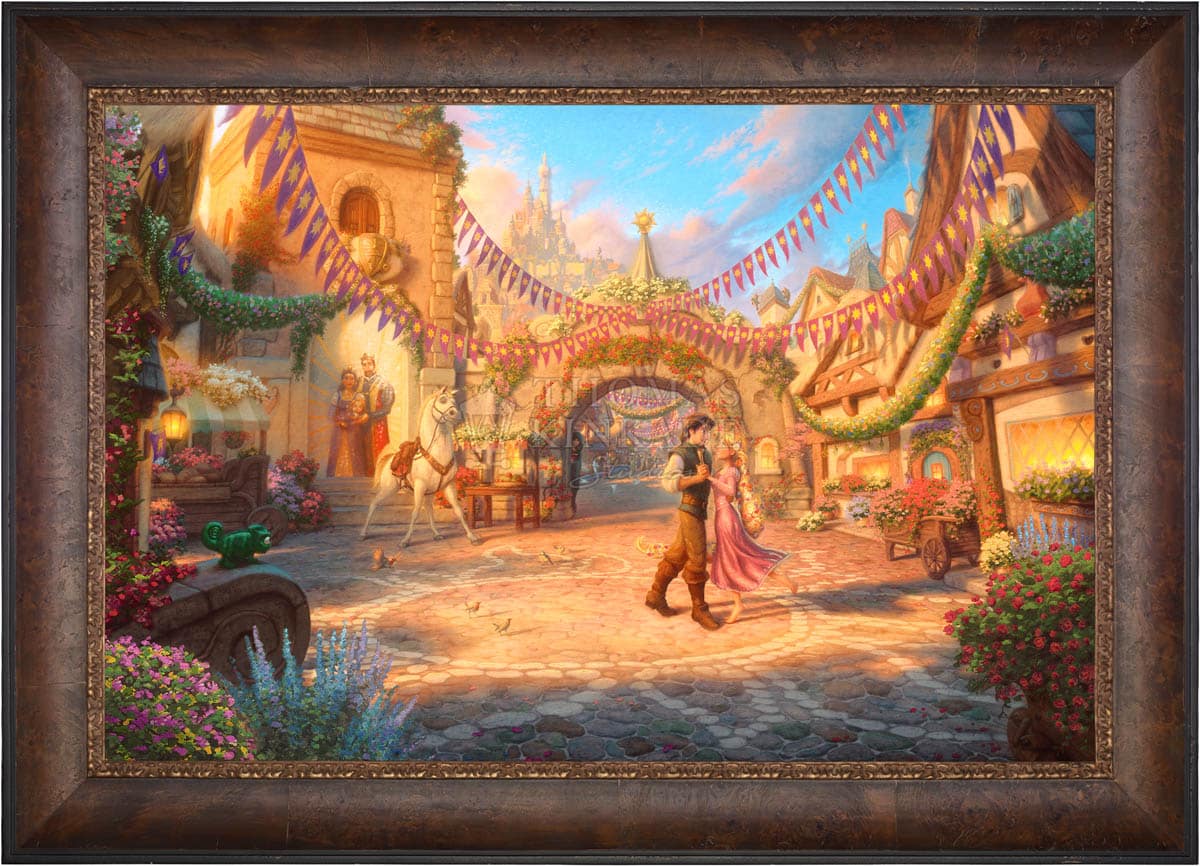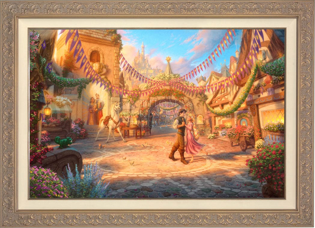 Tangled is a re-telling of the traditional fairy tale “Rapunzel” and joins other great titles as the 50th addition in the Walt Disney animated classic film series. It is with great pride that the Thomas Kinkade Studios presents Rapunzel Dancing in the Sunlit Courtyard.