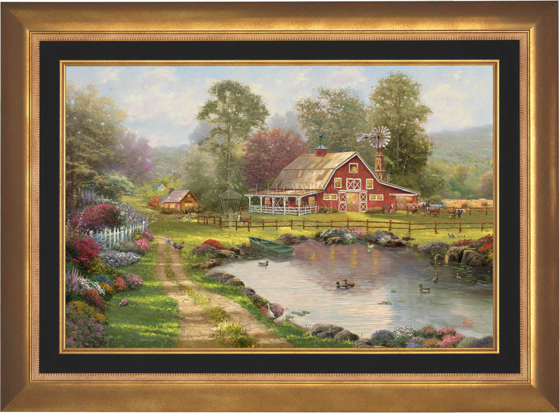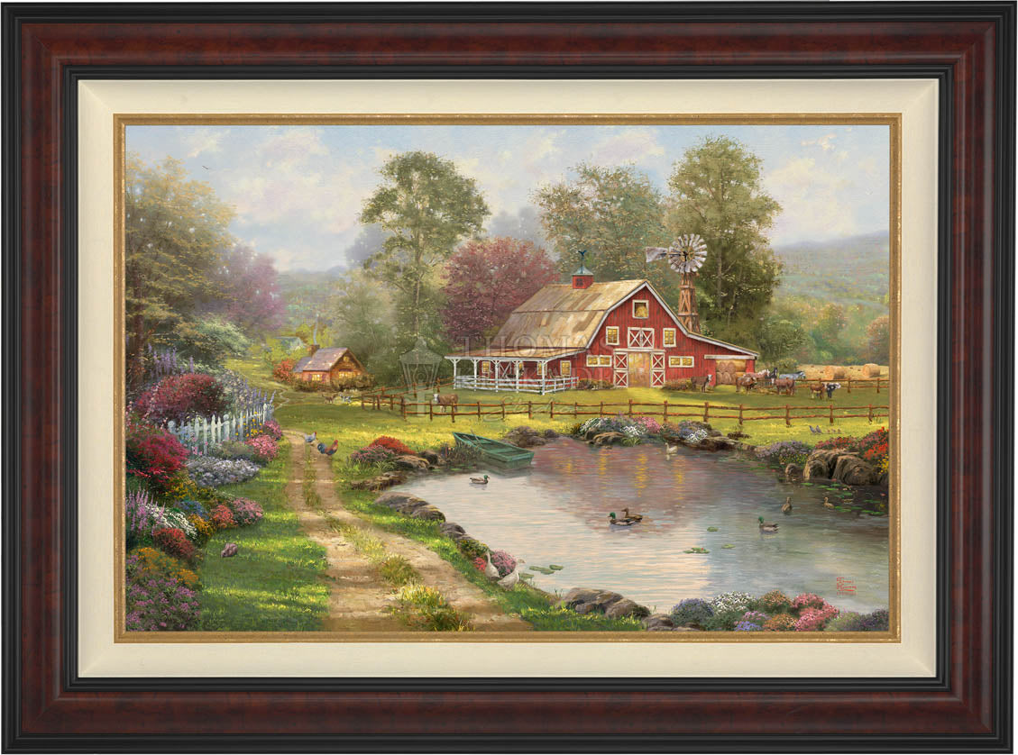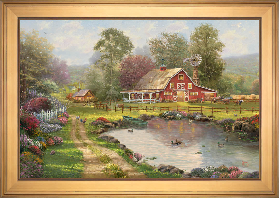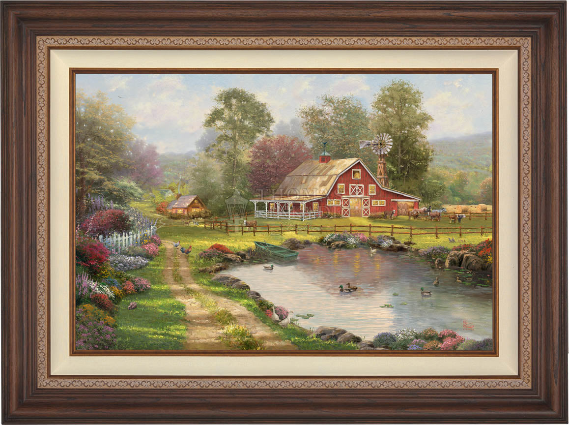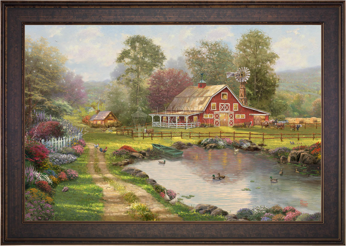 A walk on a farm brings a symphony of sights, smells and sounds to the senses. The aroma of fresh mowed hay, the whinnying of horses, and the abundance of baby animals is sure to bring a smile to everyone’s faces. Thomas Kinkade grew up in farm country and the smell of new hay was a treasured memory of his. He always dreamed of owning his own slice of heaven one day. Thomas Kinkade Studios sought to capture Thom’s vision of the pastoral life. In this painting, morning light filters through the trees casting a warm glow onto the farm. The horses and cows are milling about waiting to be turned out to the pastures after being fed. The ducks, chickens, bunnies and dogs are happily starting their day. Thomas Kinkade Studios is pleased to present Red Barn Retreat, where we all discover the sweet smell of hay and something more – a sense of perfect tranquility.