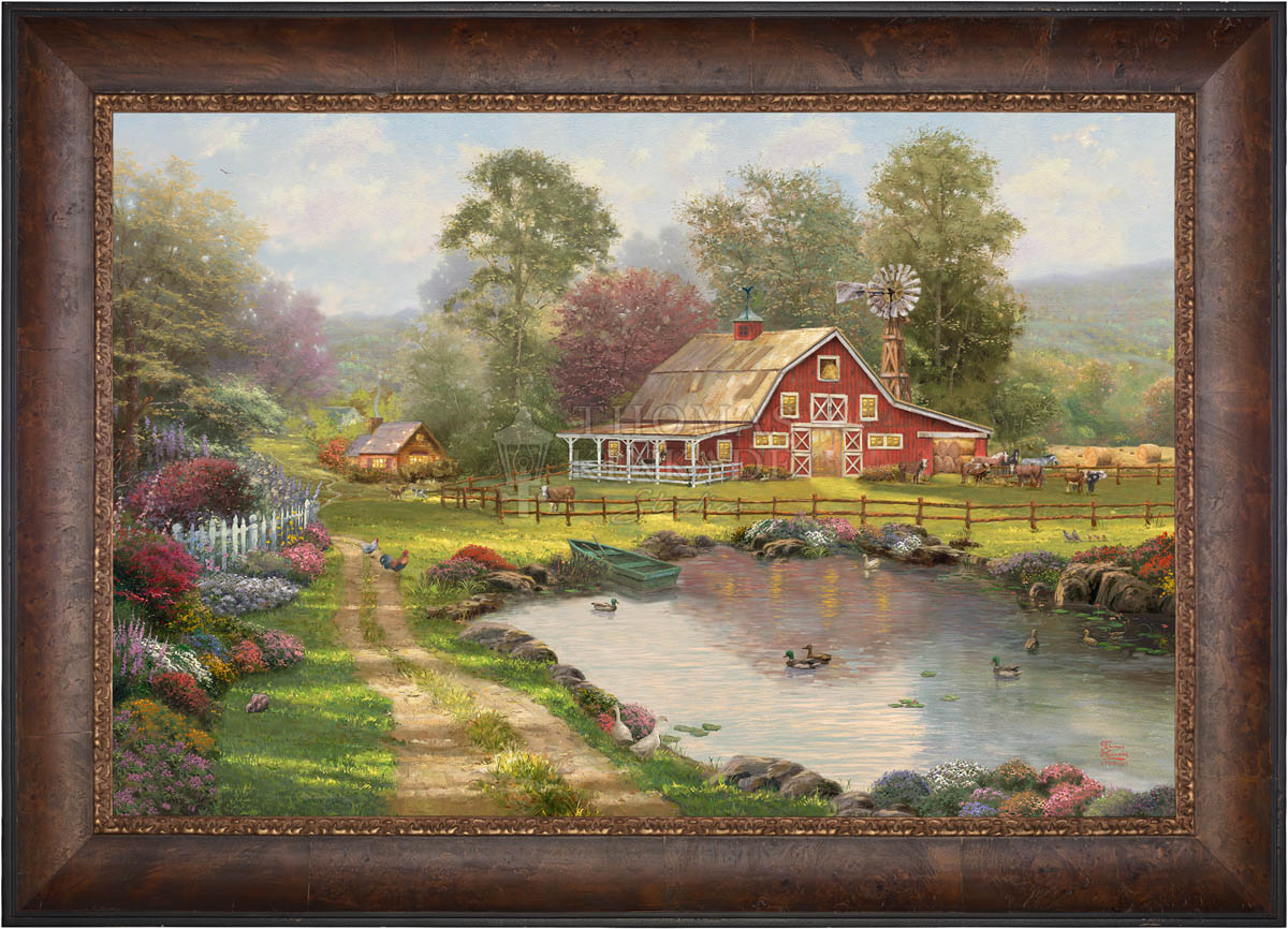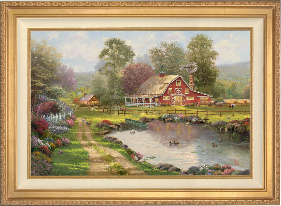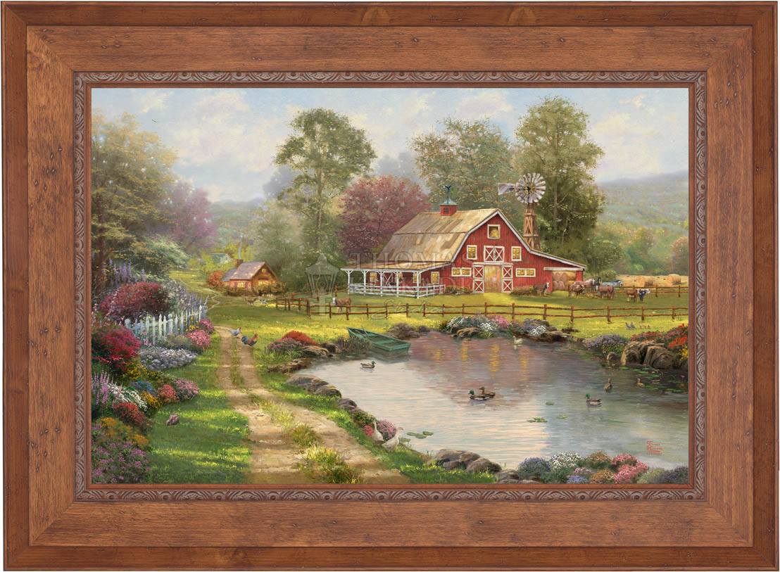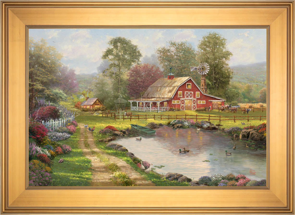 A walk on a farm brings a symphony of sights, smells and sounds to the senses. The aroma of fresh mowed hay, the whinnying of horses, and the abundance of baby animals is sure to bring a smile to everyone’s faces. Thomas Kinkade grew up in farm country and the smell of new hay was a treasured memory of his. He always dreamed of owning his own slice of heaven one day. Thomas Kinkade Studios sought to capture Thom’s vision of the pastoral life. In this painting, morning light filters through the trees casting a warm glow onto the farm. The horses and cows are milling about waiting to be turned out to the pastures after being fed. The ducks, chickens, bunnies and dogs are happily starting their day. Thomas Kinkade Studios is pleased to present Red Barn Retreat, where we all discover the sweet smell of hay and something more – a sense of perfect tranquility.