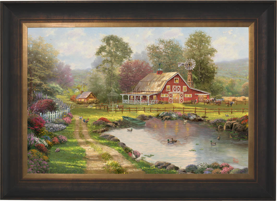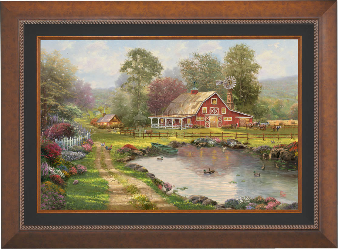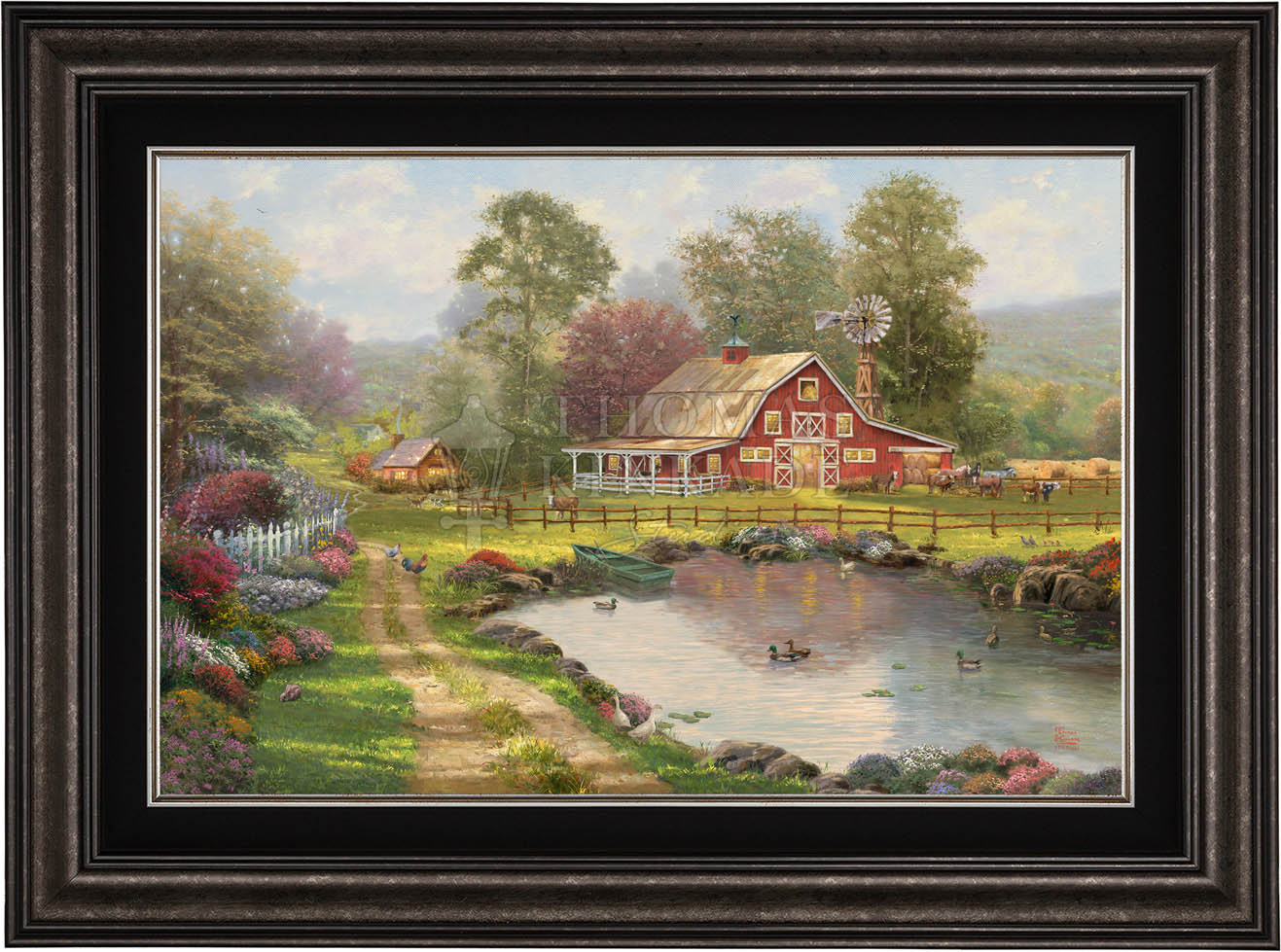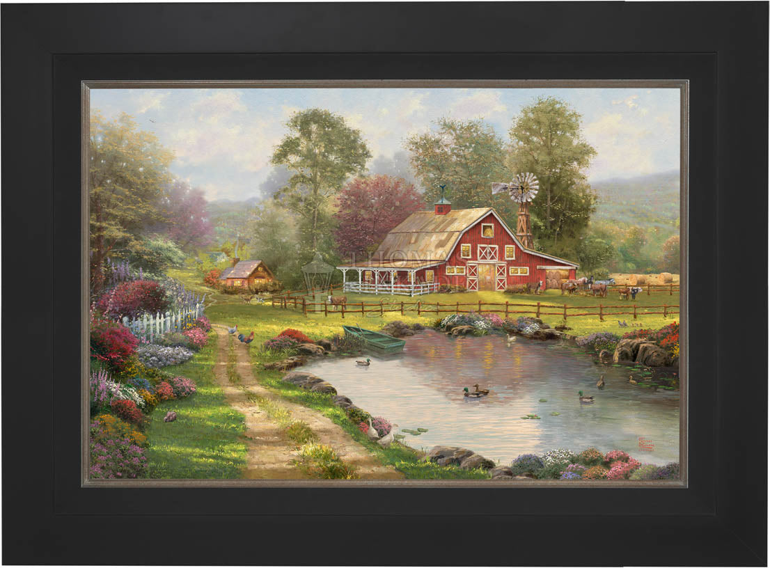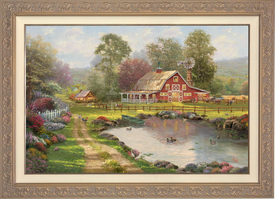 A walk on a farm brings a symphony of sights, smells and sounds to the senses. The aroma of fresh mowed hay, the whinnying of horses, and the abundance of baby animals is sure to bring a smile to everyone’s faces. Thomas Kinkade grew up in farm country and the smell of new hay was a treasured memory of his. He always dreamed of owning his own slice of heaven one day. Thomas Kinkade Studios sought to capture Thom’s vision of the pastoral life. In this painting, morning light filters through the trees casting a warm glow onto the farm. The horses and cows are milling about waiting to be turned out to the pastures after being fed. The ducks, chickens, bunnies and dogs are happily starting their day. Thomas Kinkade Studios is pleased to present Red Barn Retreat, where we all discover the sweet smell of hay and something more – a sense of perfect tranquility.