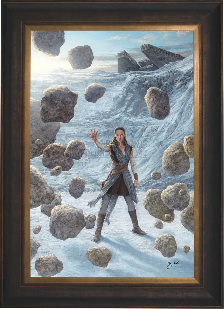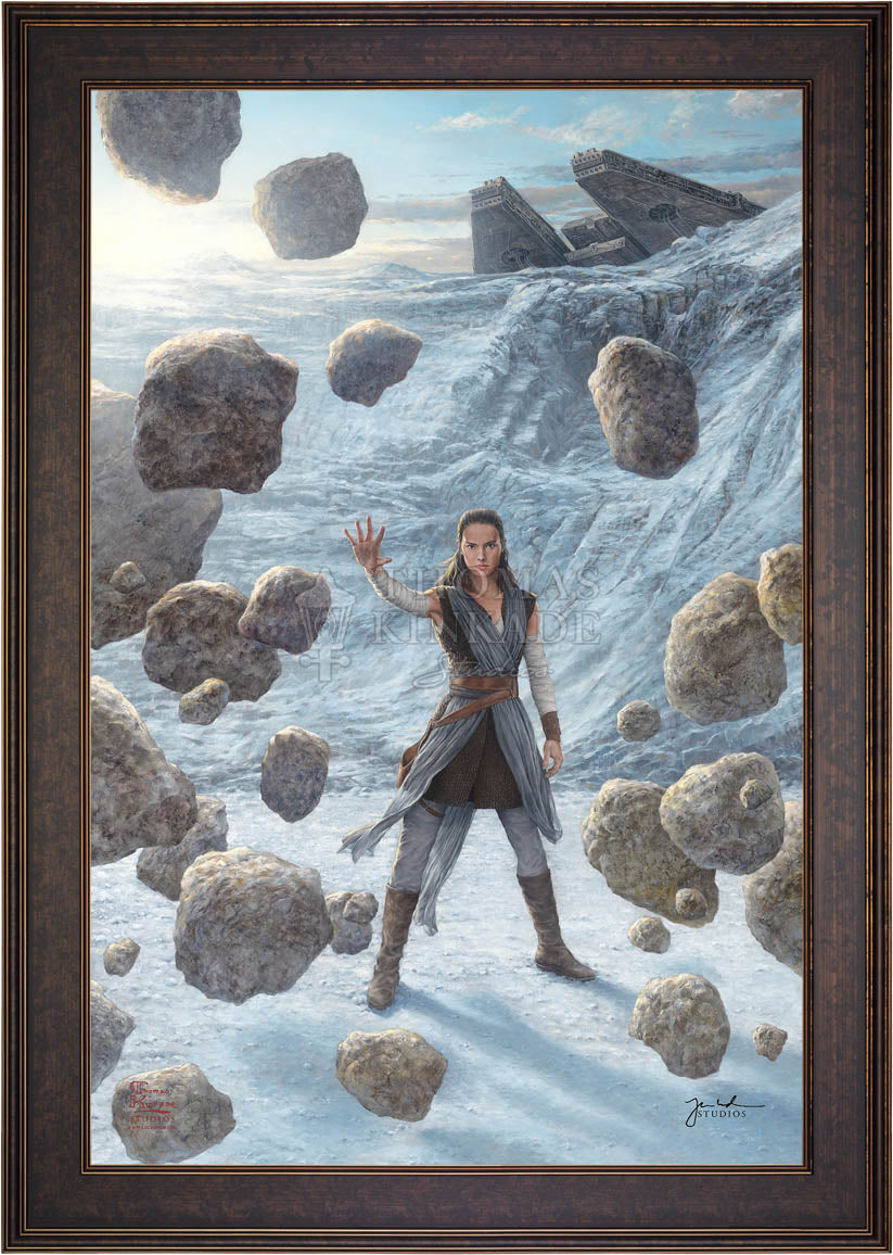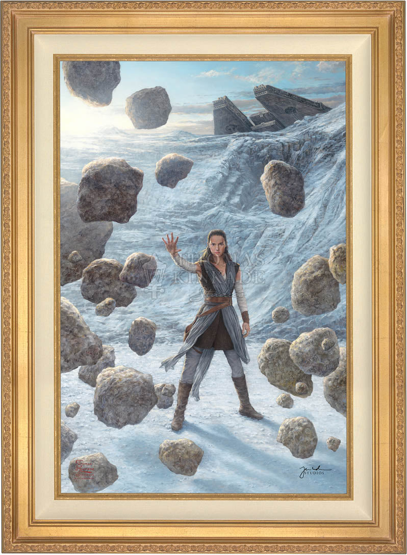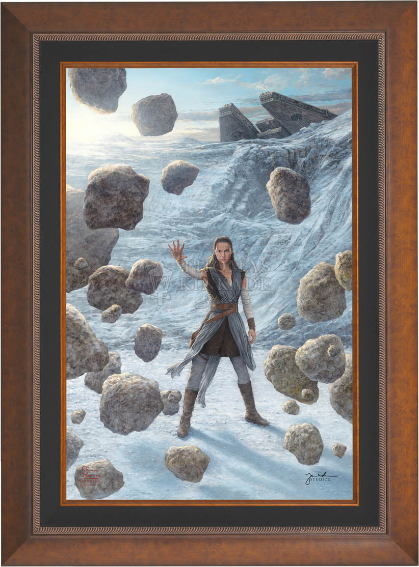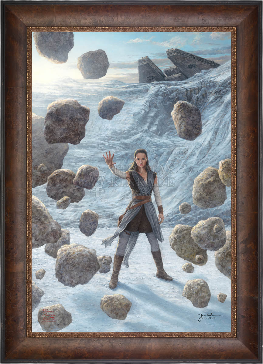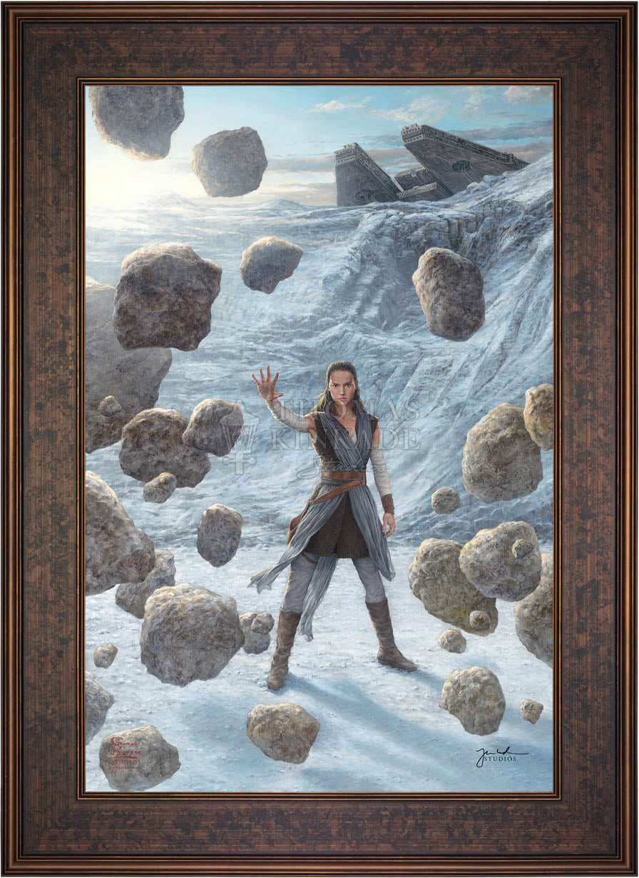 The Millennium Falcon has landed on Crait right above the back of the outpost cavern. Rey climbs down and sees the vulptex emerge through a small crevice, and senses that her friends are just inside behind all the fallen boulders. She raises her hand to move the boulders away from the cavern, saving her friends. The Resistance fighters emerge and join Rey aboard the Millennium Falcon, once more a step ahead of Kylo Ren and the First Order, restoring hope and inspiring rebellion across the galaxy.
