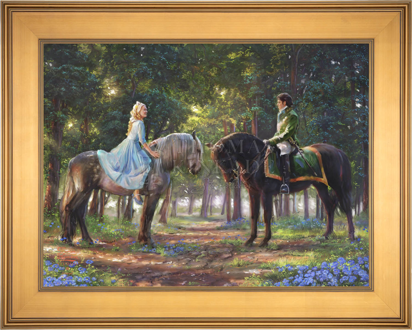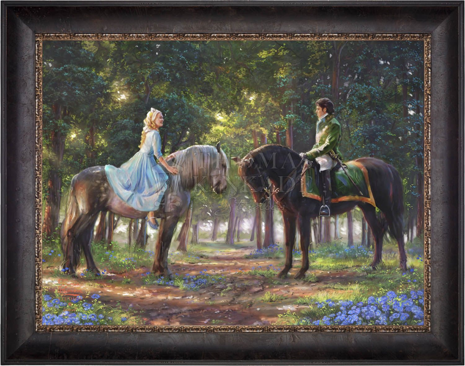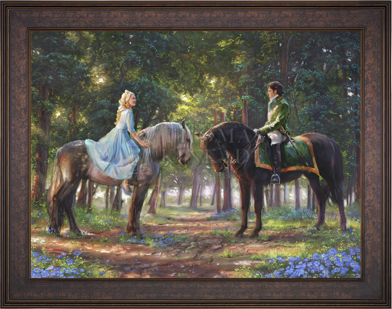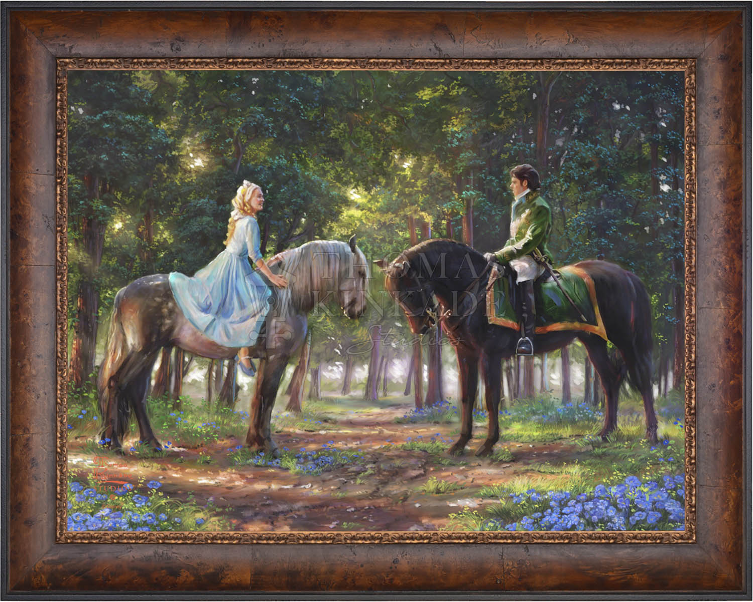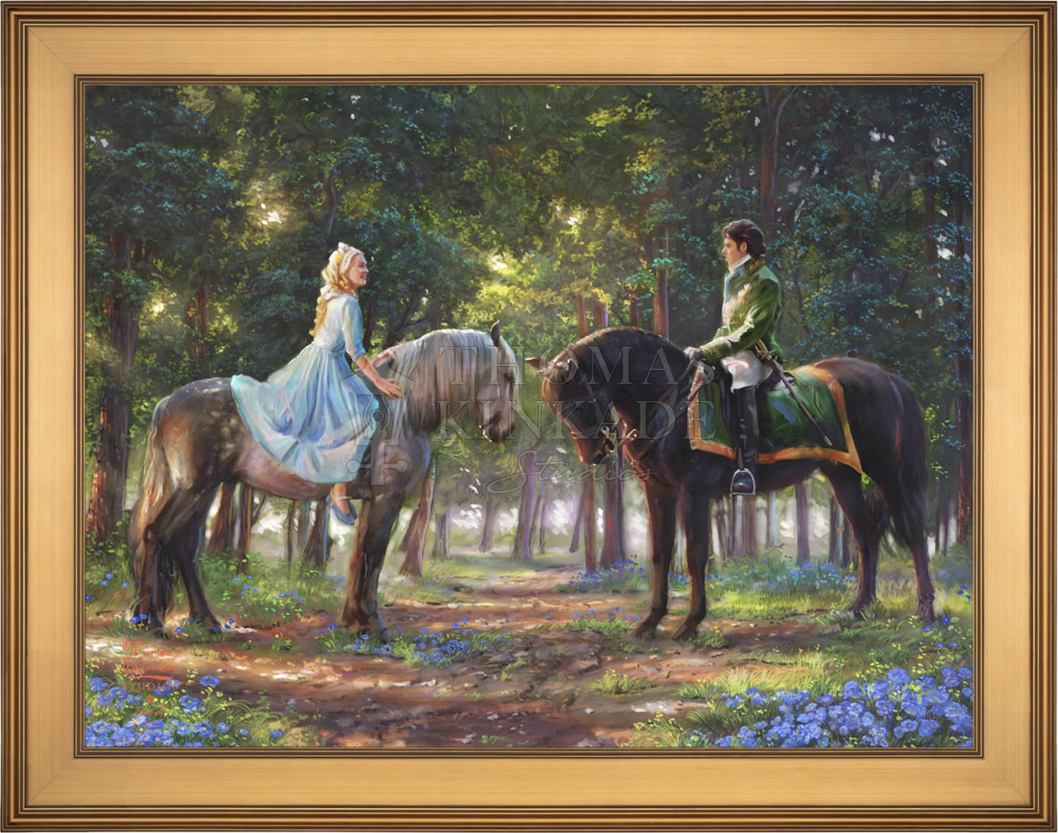 Call UsThe story of "Cinderella" is a timeless and universal tale of romance and self-discovery. It explores the importance of inner beauty in the assessment of personal worth and proclaims the power of true love to overcome all obstacles no matter how large and daunting they may seem. The folklore of the hidden princess magically discovered by her true prince has been told for hundreds of years in countries throughout the world as geographically and culturally diverse as Malaysia and Germany. The beauty of the fable and the importance of its message have also made it a constant in the list of favorite stories told and enjoyed by those spinning yarns in our own country. To be sure, Thom loved the original "Cinderella" as much as any and would speak of it fondly when reminiscing of story-times spent with his own beautiful daughters. Their laughter and delight at his telling would shine in his own eyes as he reveled in their obvious enchantment.We at the Thomas Kinkade Studios are excited to continue in this storytelling tradition, bringing to life the latest Disney retelling of this classic story in the form of four paintings; each capturing in oil the joy of first love, the wonderment of fairy magic and the excitement of romantic adventure. Whether you are enjoying the encounter with the dashing stranger in the woods, the depiction of Cinderella's enchanted transformation, her flight from discovery at the King's ball or her time in love with the prince of her dreams, all of these masterworks in color and light will dazzle your eye and speak to your heart. It is our hope that this latest interpretation of "Cinderella" be a gift not only to all "princesses" but also to all those who love them.