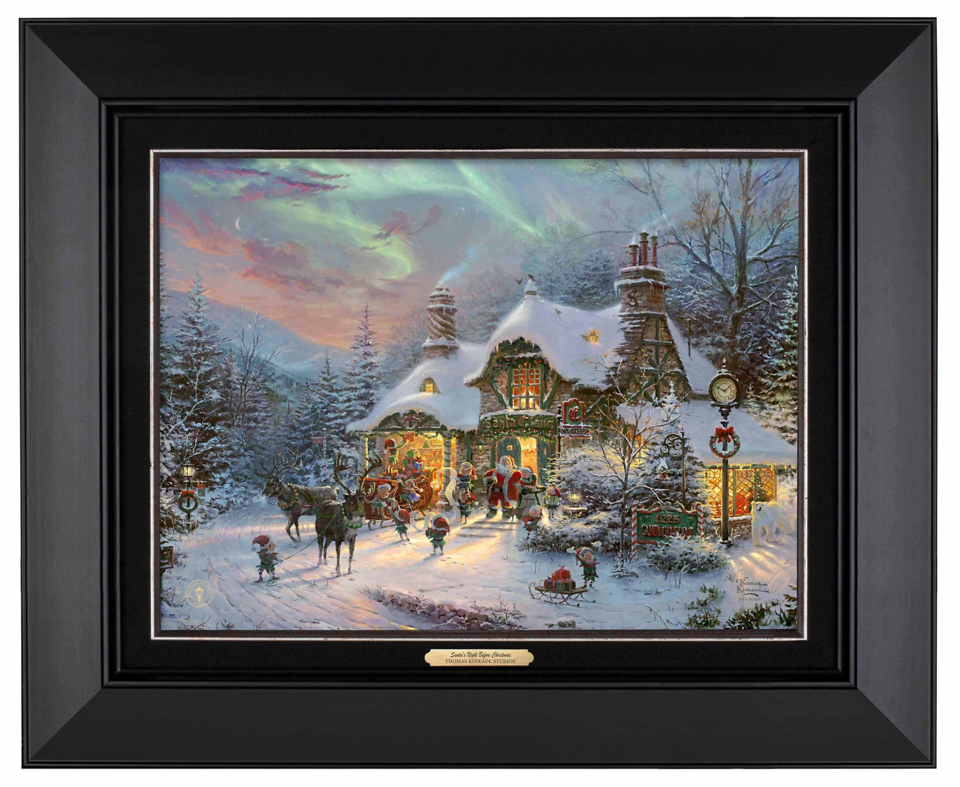 In Santa's Night Before Christmas by Thomas Kinkade Studios, excitement is in the air as Santa's elves pack his sleigh with presents to deliver to all the good children of the world. For the entire year, the residents of the North Pole have been joyfully working around the clock to get ready for Christmas Eve. As the time for departure approaches, the brilliant northern lights have lit up the sky with a dazzling display of auroral light; creating the perfect scene to start Santa's magical journey.