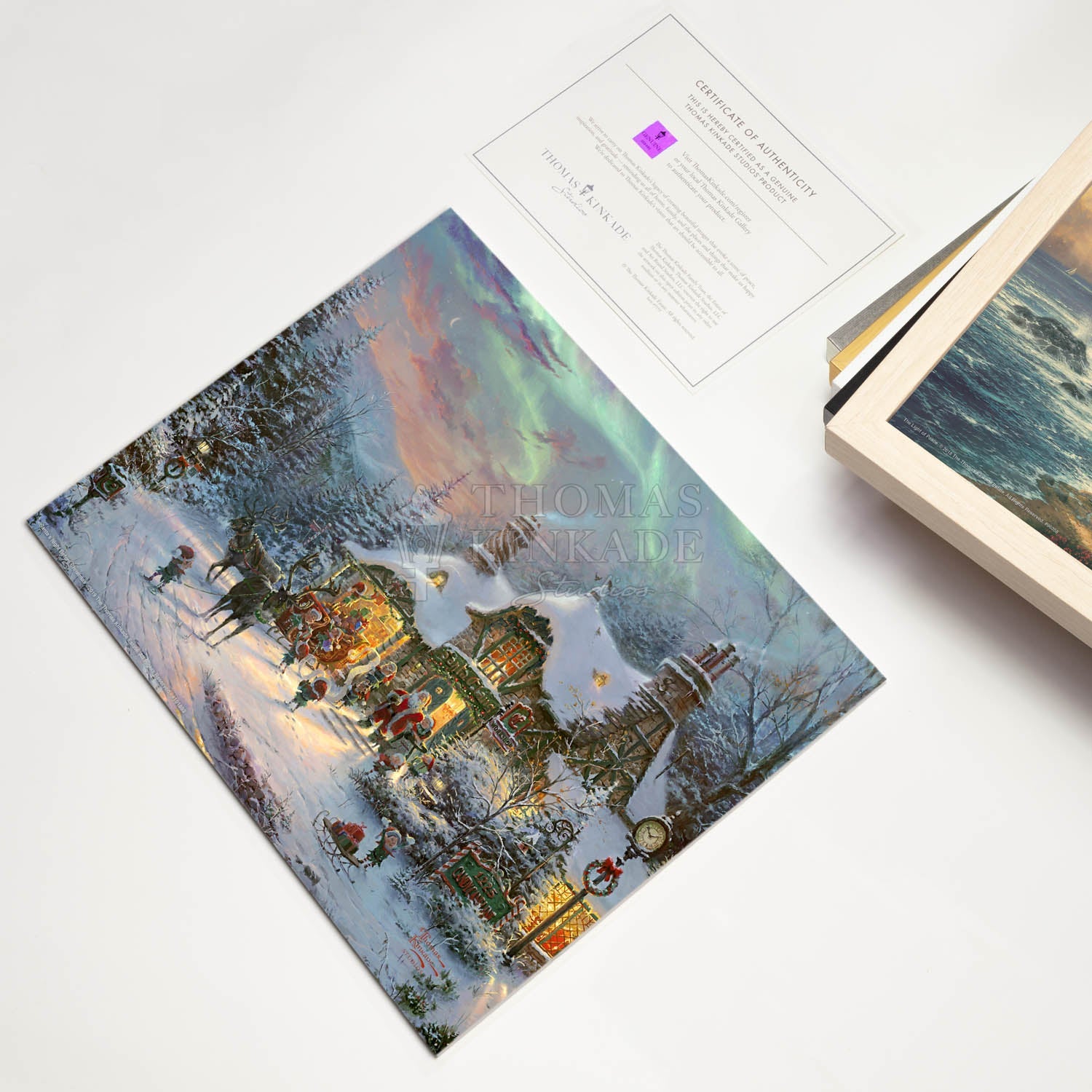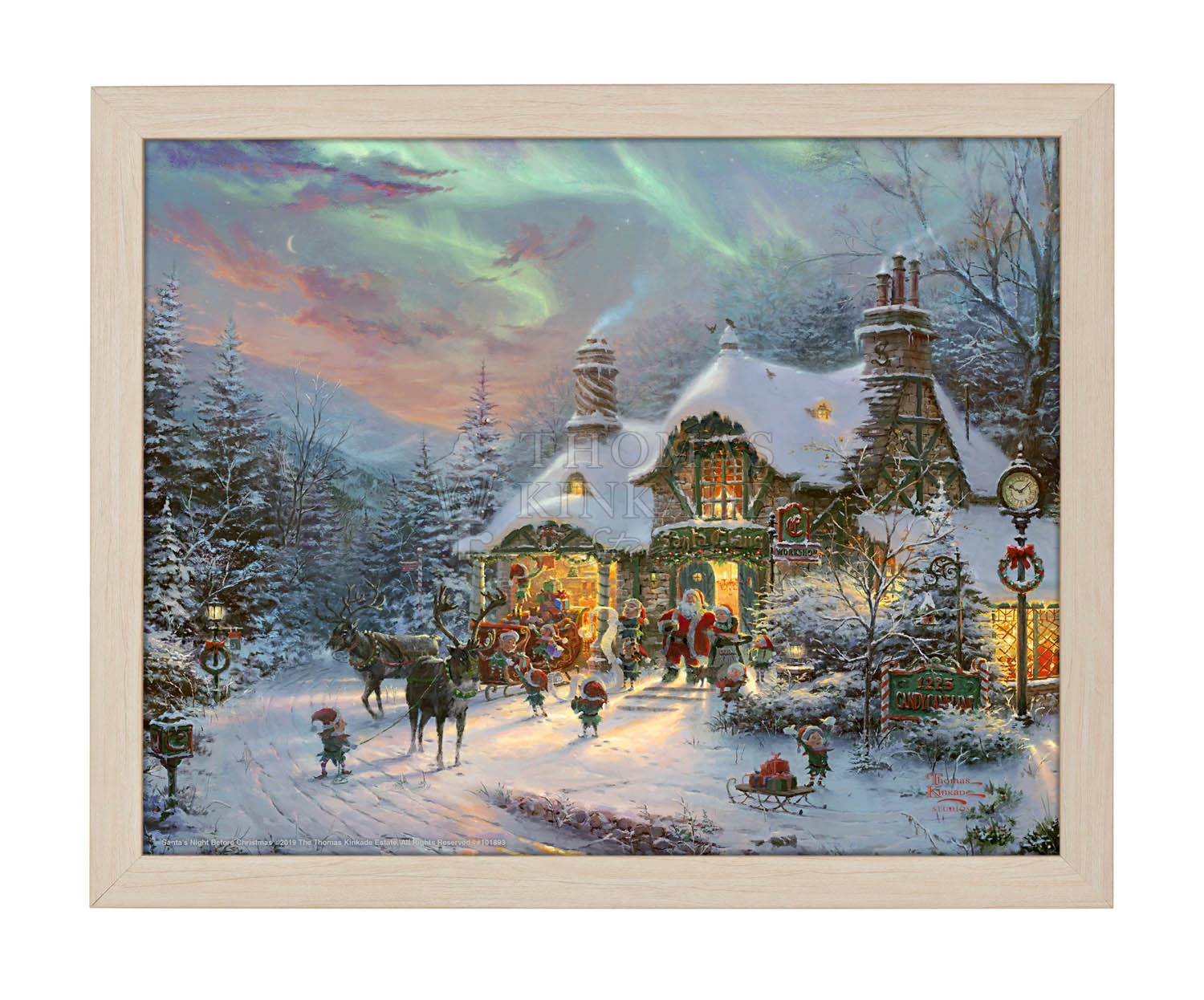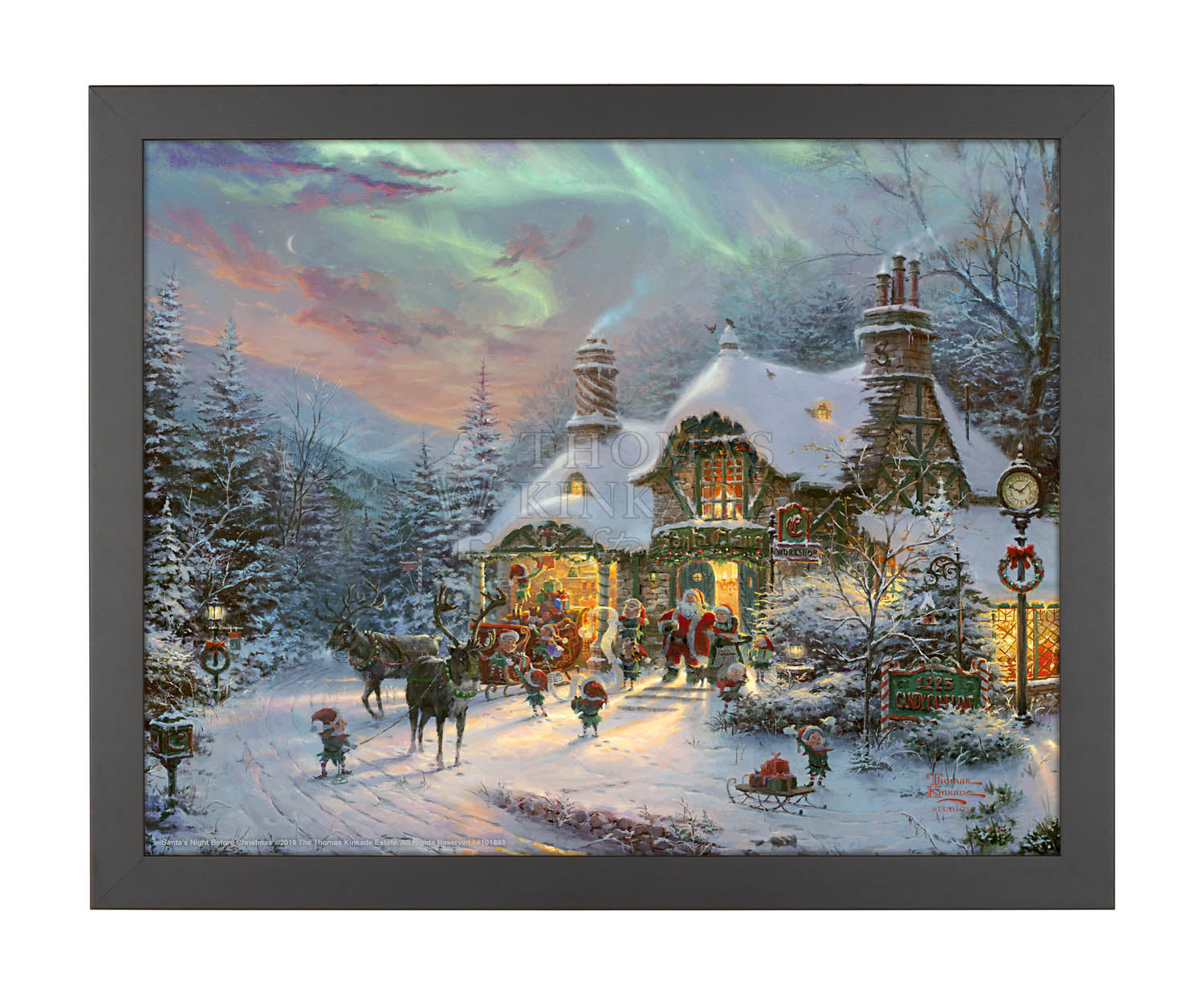In Santa's Night Before Christmas by Thomas Kinkade Studios, excitement is in the air as Santa's elves pack his sleigh with presents to deliver to all the good children of the world. For the entire year, the residents of the North Pole have been joyfully working around the clock to get ready for Christmas Eve. As the time for departure approaches, the brilliant northern lights have lit up the sky with a dazzling display of auroral light; creating the perfect scene to start Santa's magical journey.