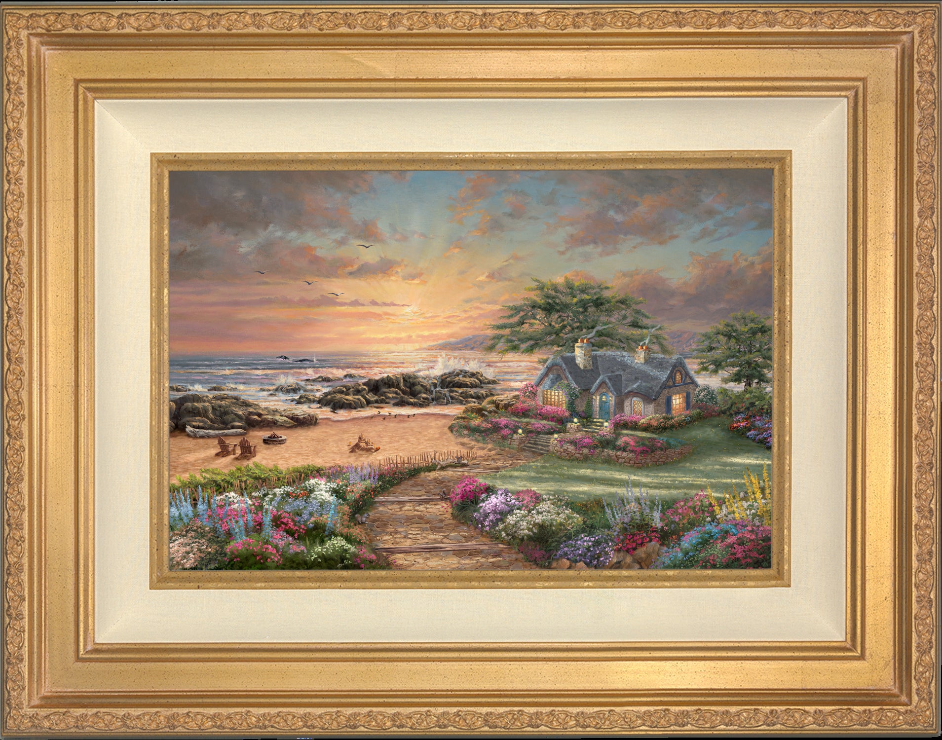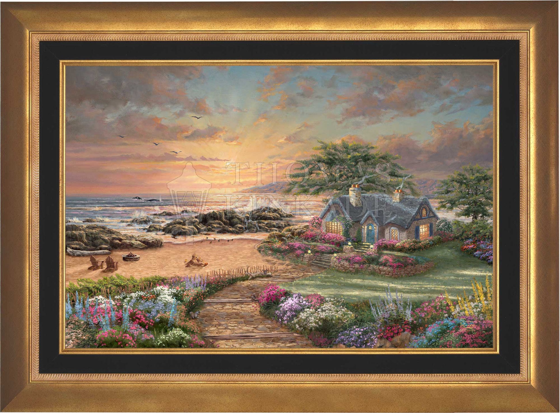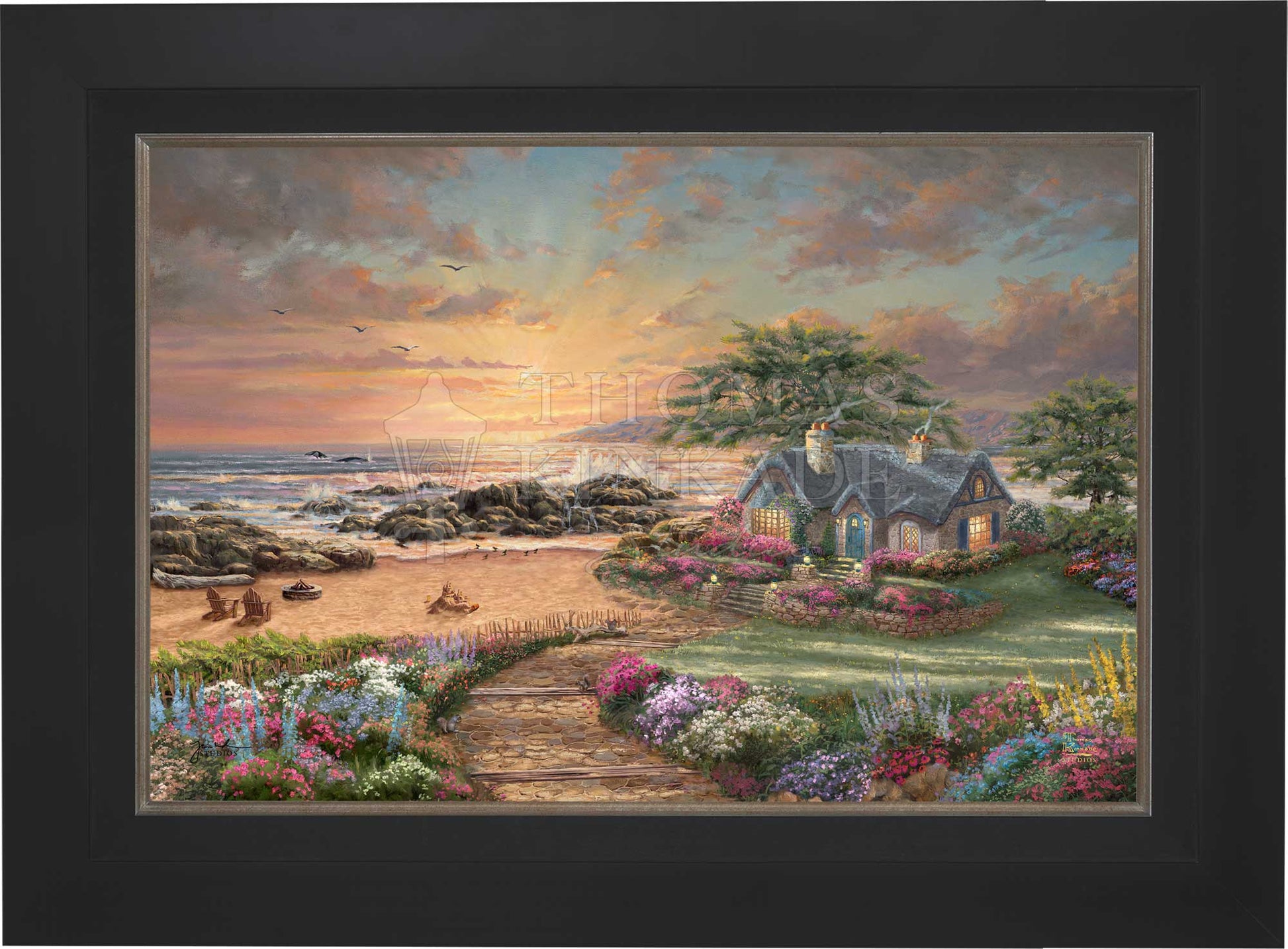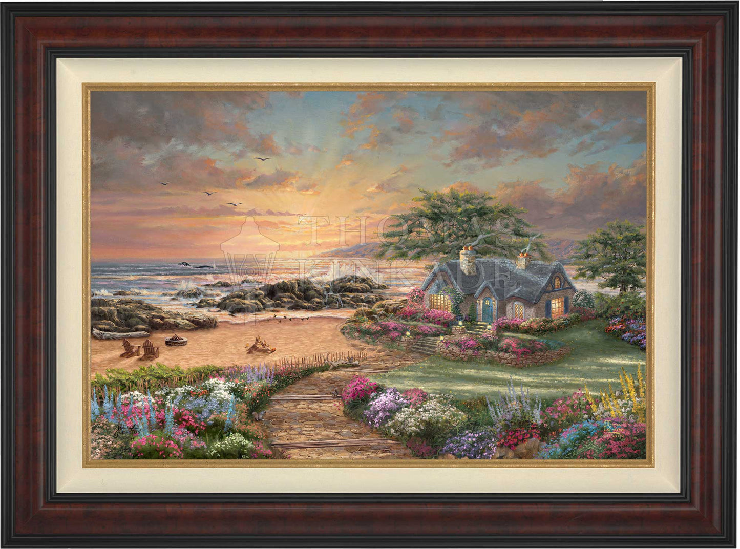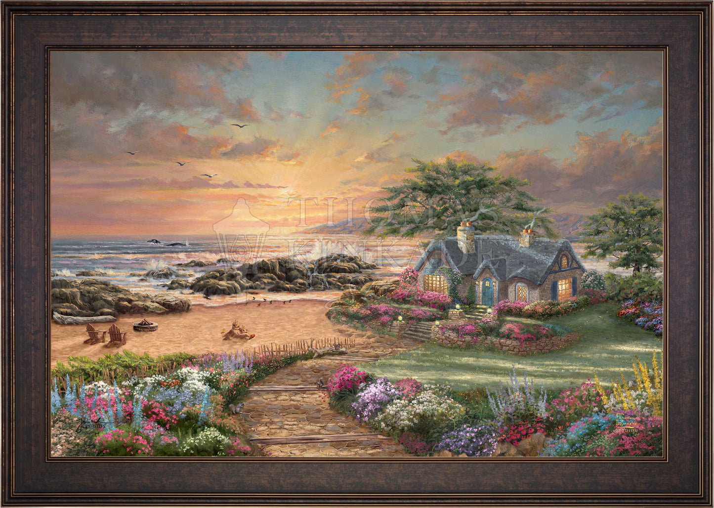 “The voice of the ocean speaks to the soul.” – Anonymous The enchanting setting sun radiates a warm glow as the ocean waves crash against the rocks on the seashore. The serenity of early evening fills the air, accented by the flowers’ beauty, the vibrant sunset, and the tranquil beach. The splash of the water from the breaching whales will bring a smile to those who are lucky to have witnessed their passing travels. The inviting cottage with its welcoming lights is the perfect place to enjoy Nature. Thomas Kinkade Studios presents Seaside Cottage , an idyllic sanctuary for all to refresh their faith, spirit, and soul.
