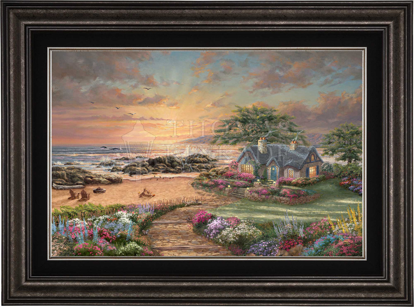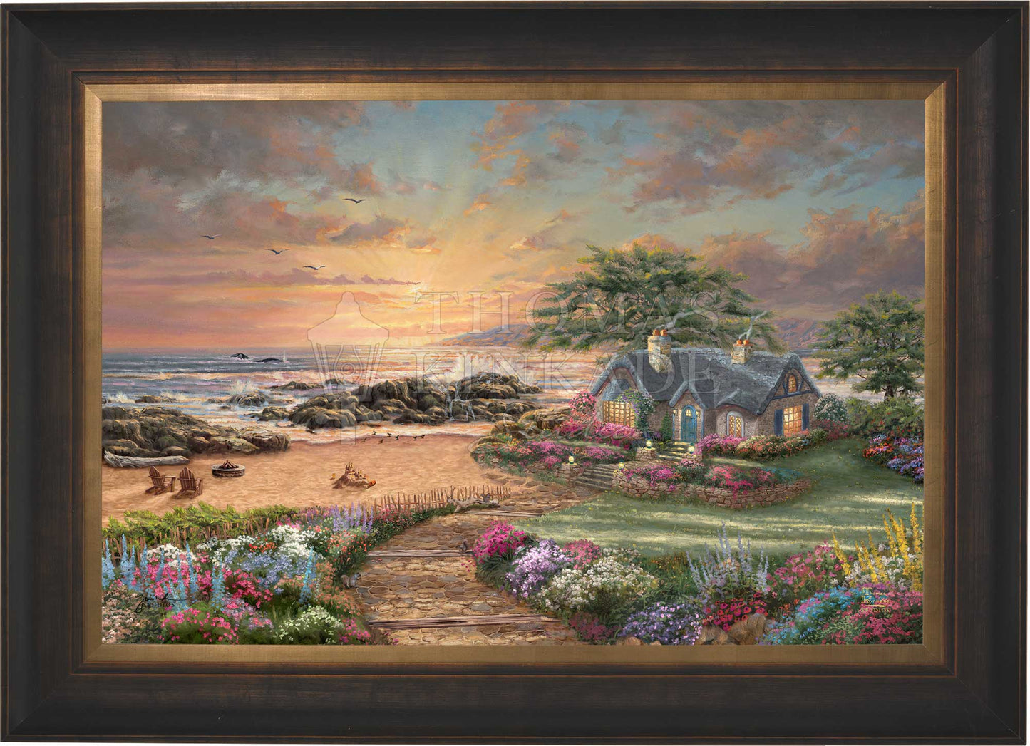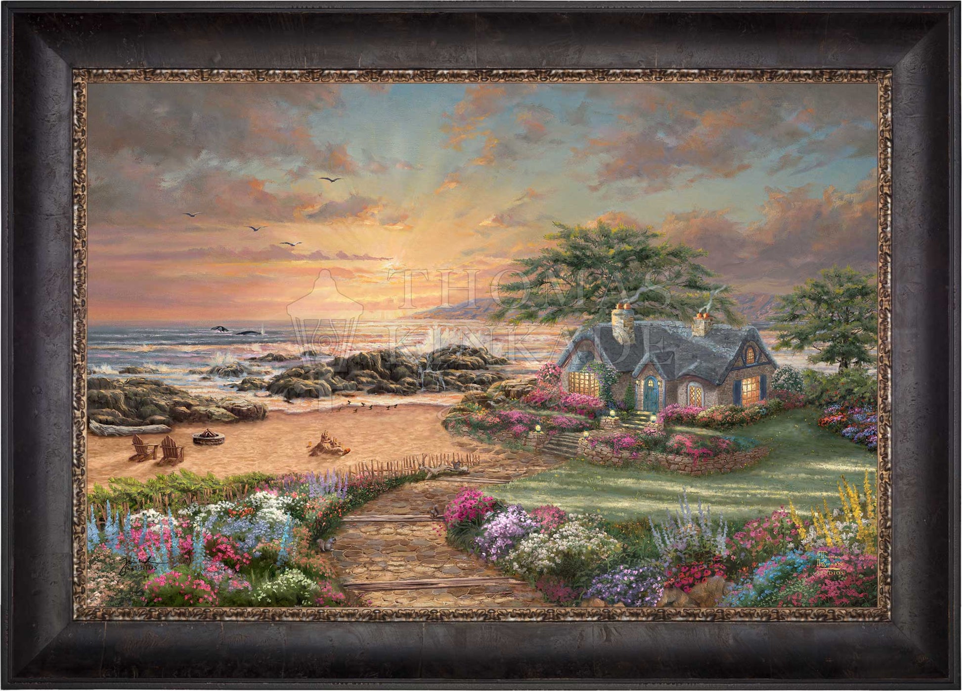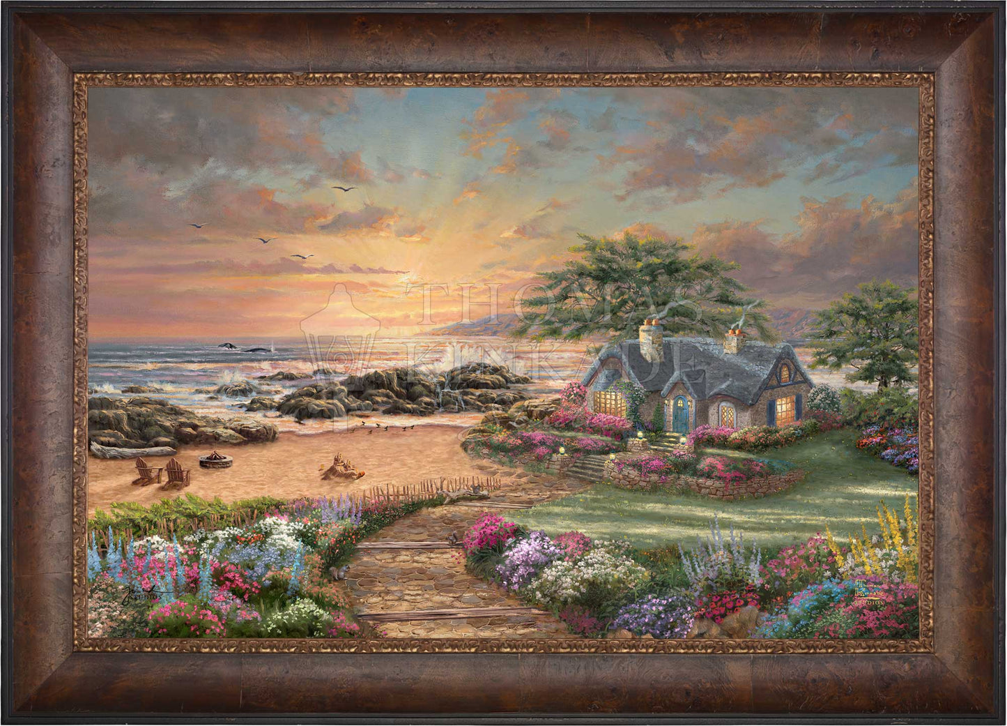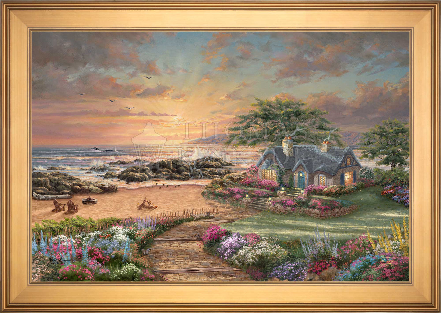 “The voice of the ocean speaks to the soul.” – Anonymous The enchanting setting sun radiates a warm glow as the ocean waves crash against the rocks on the seashore. The serenity of early evening fills the air, accented by the flowers’ beauty, the vibrant sunset, and the tranquil beach. The splash of the water from the breaching whales will bring a smile to those who are lucky to have witnessed their passing travels. The inviting cottage with its welcoming lights is the perfect place to enjoy Nature. Thomas Kinkade Studios presents Seaside Cottage , an idyllic sanctuary for all to refresh their faith, spirit, and soul.