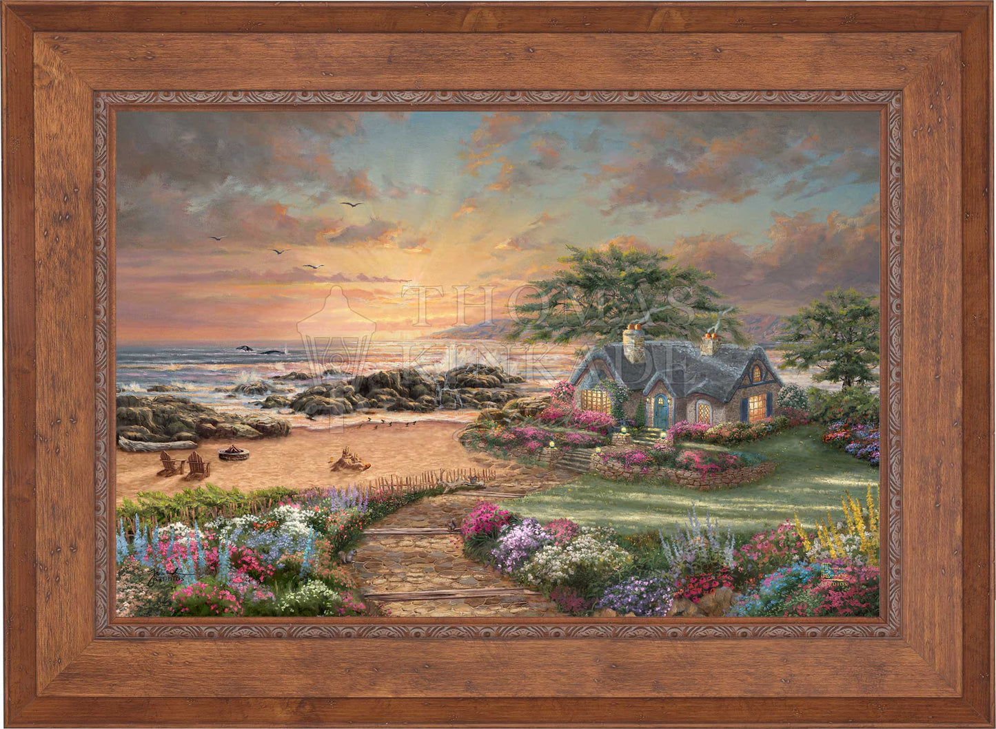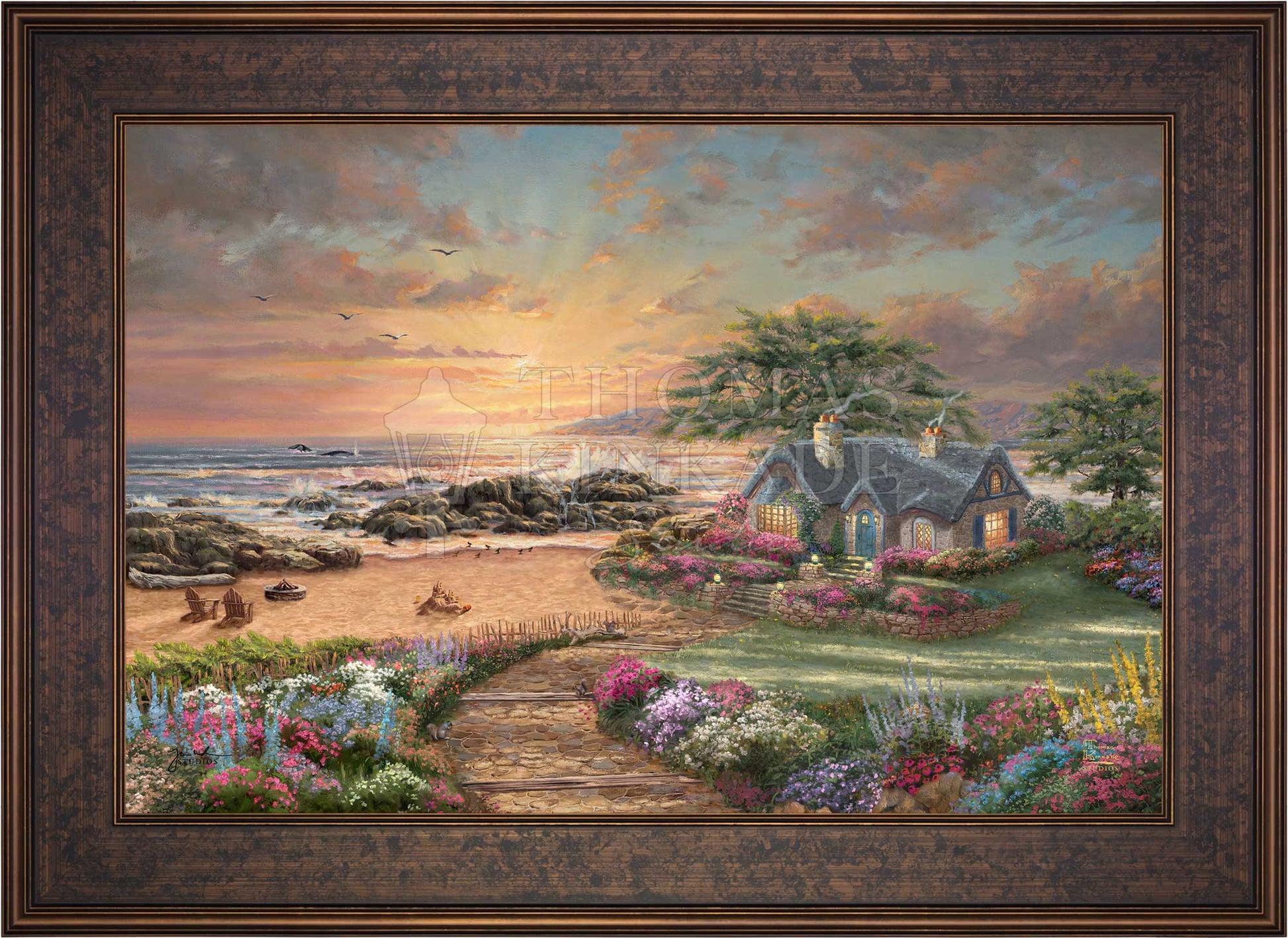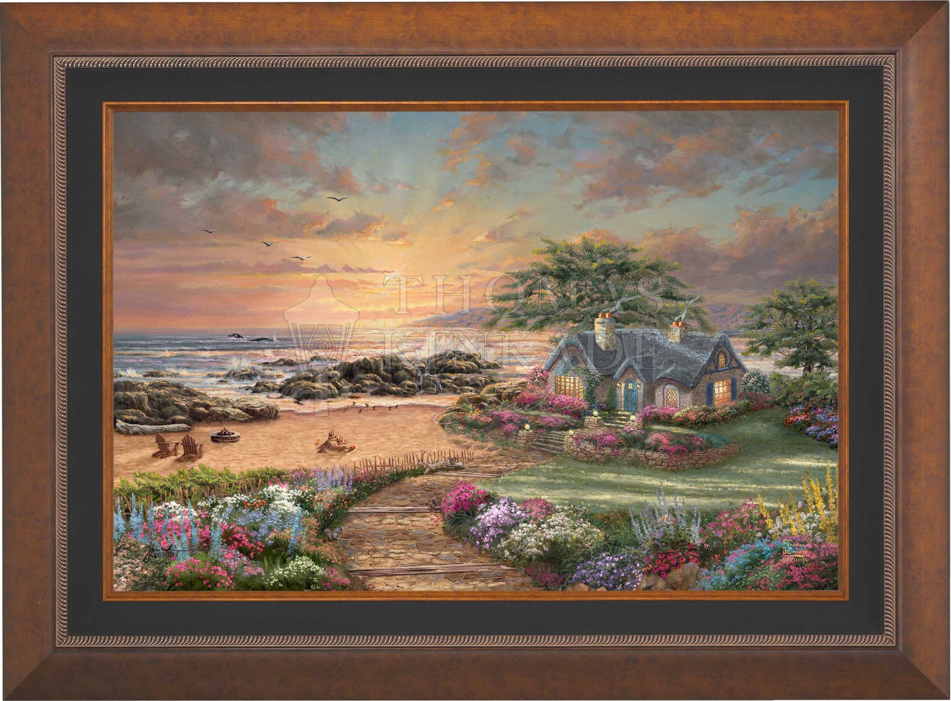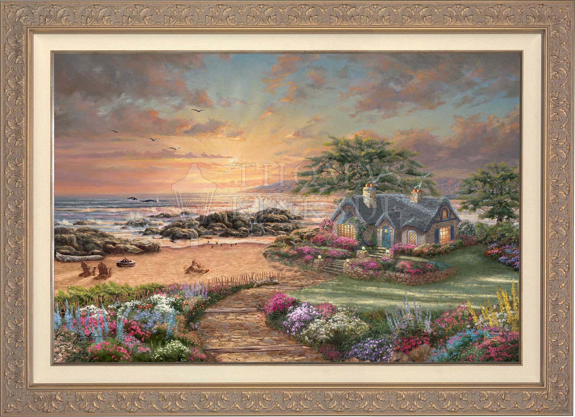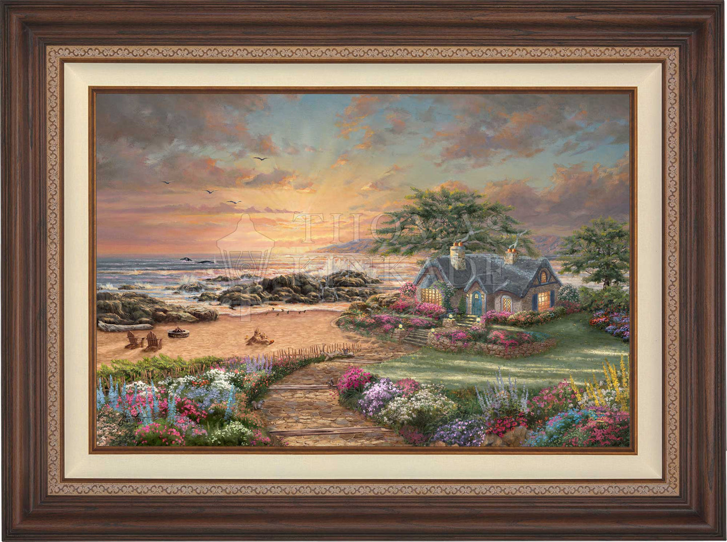“The voice of the ocean speaks to the soul.” – Anonymous The enchanting setting sun radiates a warm glow as the ocean waves crash against the rocks on the seashore. The serenity of early evening fills the air, accented by the flowers’ beauty, the vibrant sunset, and the tranquil beach. The splash of the water from the breaching whales will bring a smile to those who are lucky to have witnessed their passing travels. The inviting cottage with its welcoming lights is the perfect place to enjoy Nature. Thomas Kinkade Studios presents Seaside Cottage , an idyllic sanctuary for all to refresh their faith, spirit, and soul.