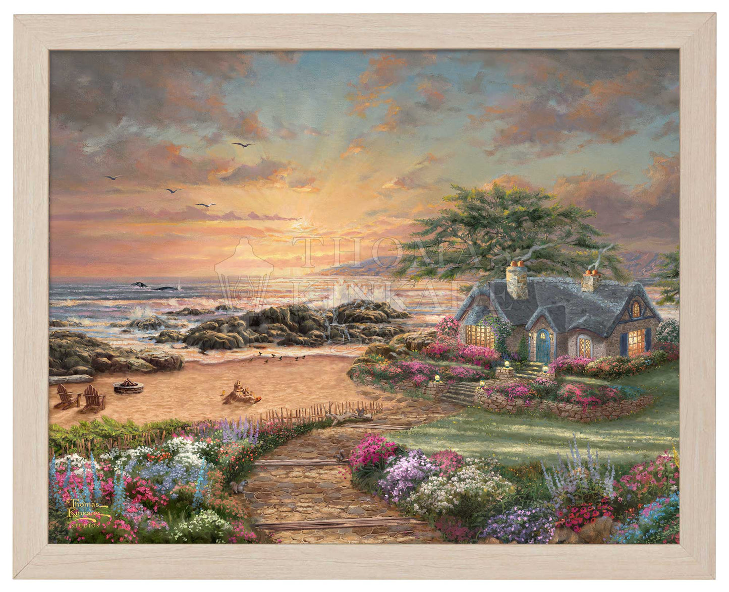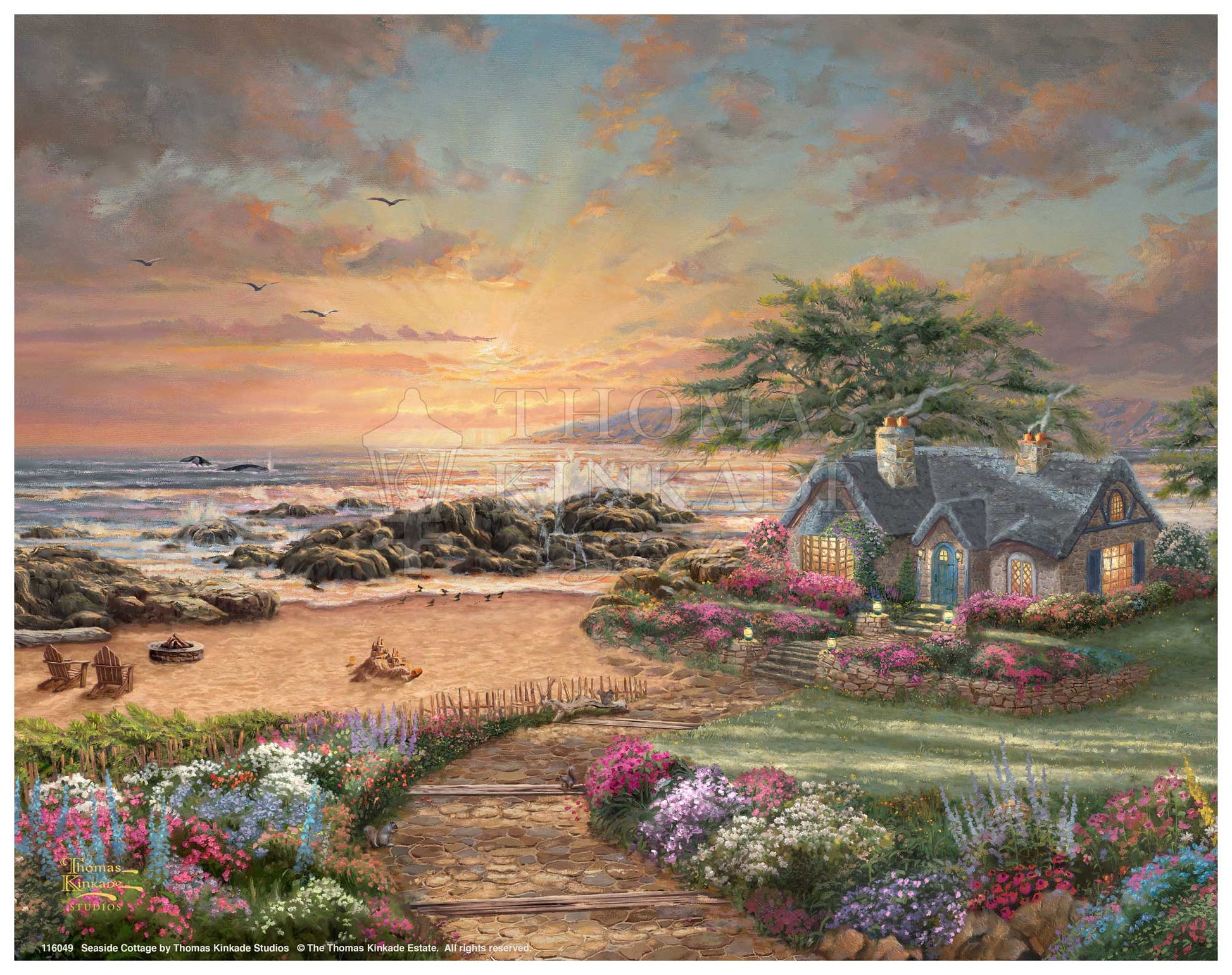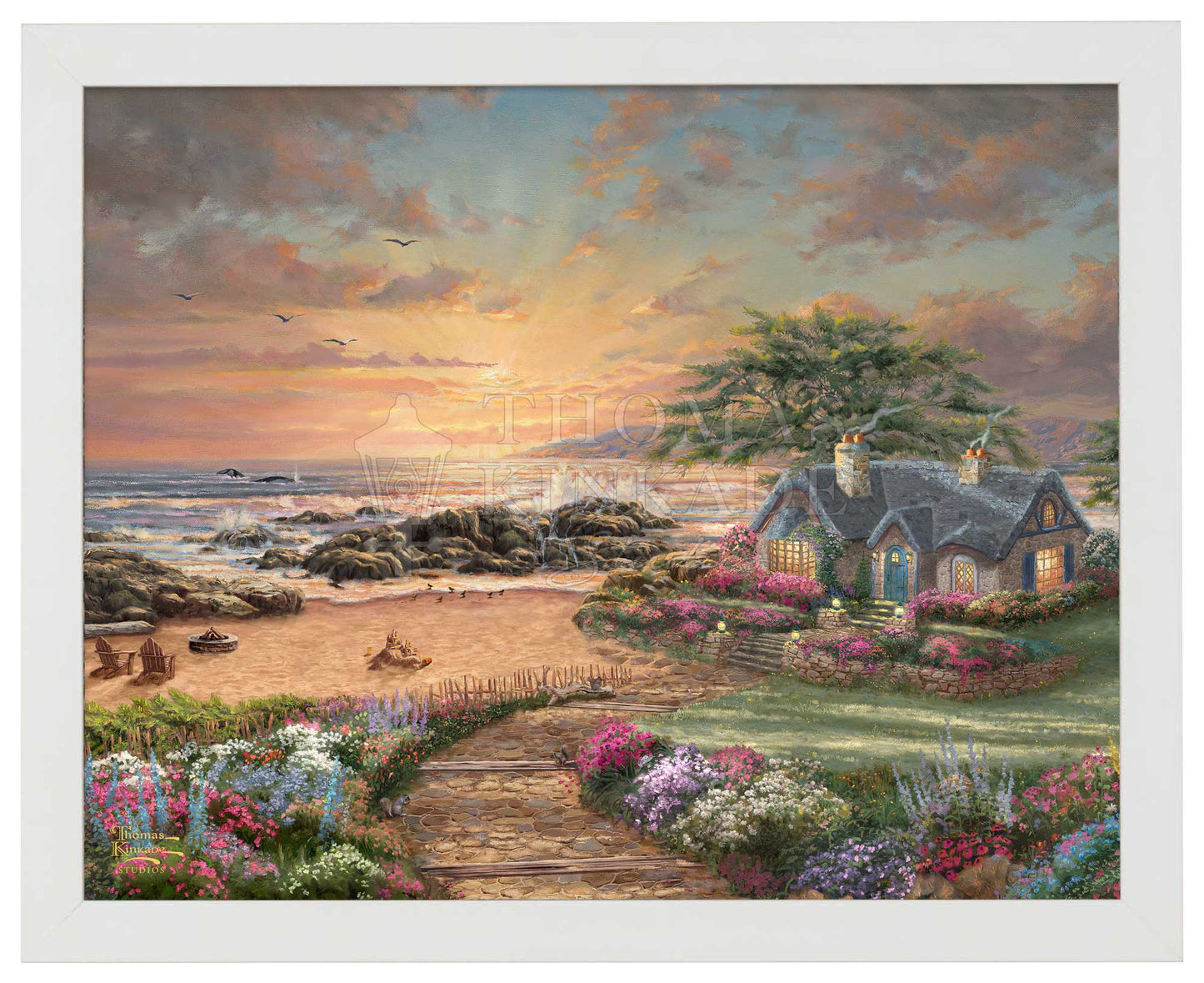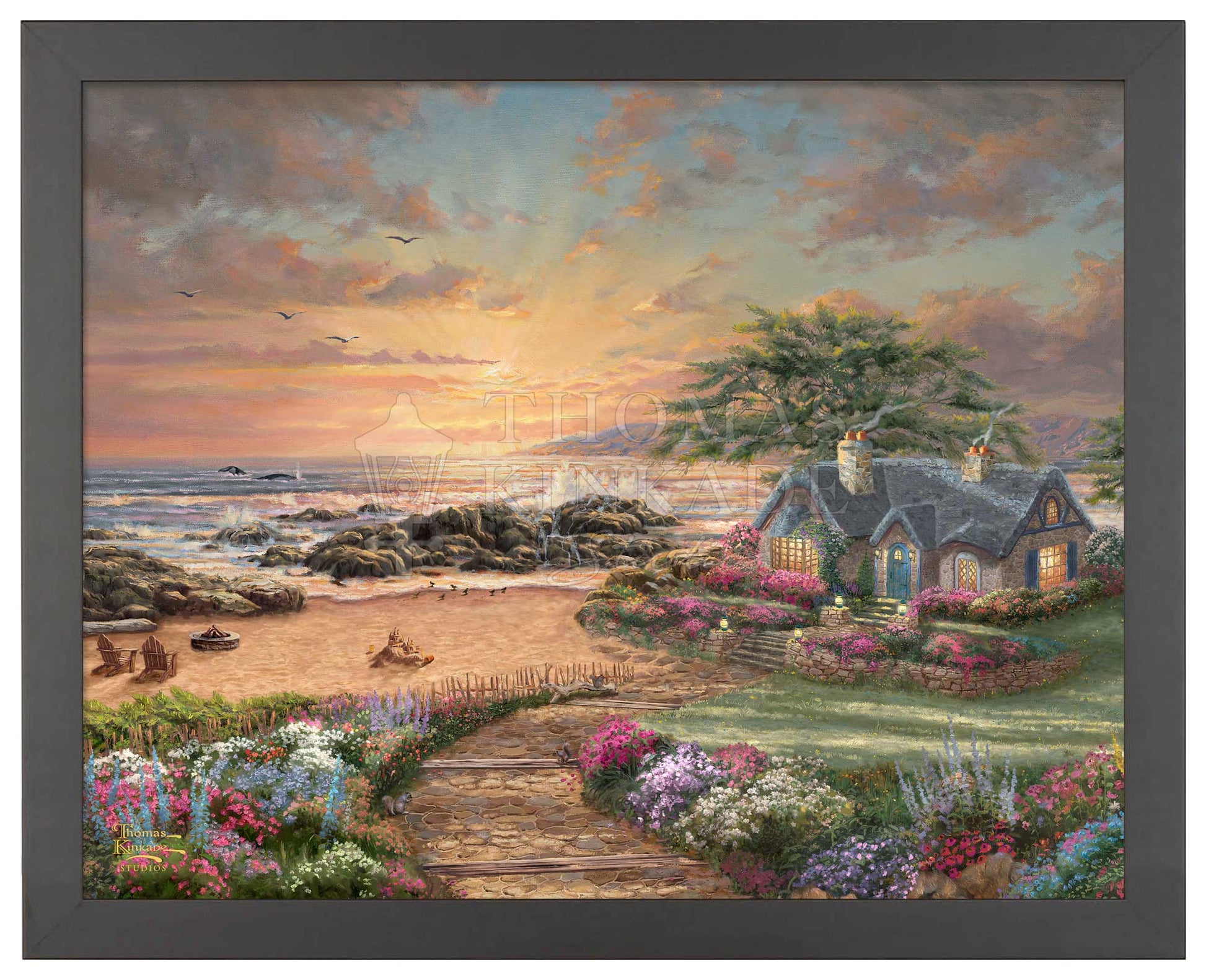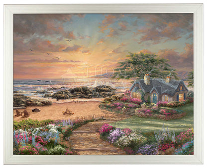 The enchanting setting sun radiates a warm glow as the ocean waves crash against the rocks on the seashore. The serenity of early evening fills the air, accented by the flowers' beauty, the vibrant sunset, and the tranquil beach. The splash of the water from the breaching whales will bring a smile to those who are lucky to have witnessed their passing travels. The inviting cottage with its welcoming lights is the perfect place to enjoy Nature. Thomas Kinkade Studios presents Seaside Cottage, an idyllic sanctuary for all to refresh their faith, spirit, and soul.