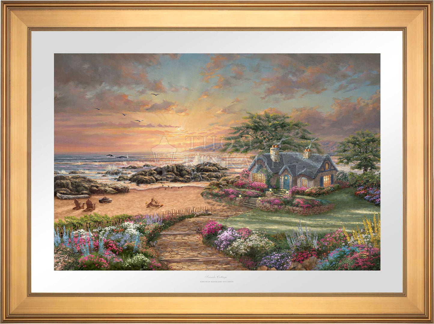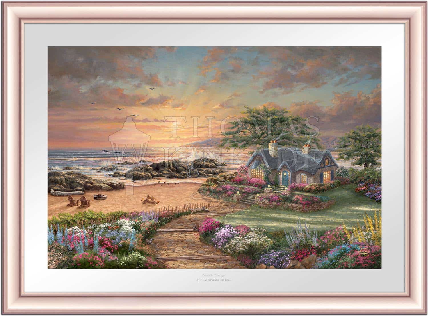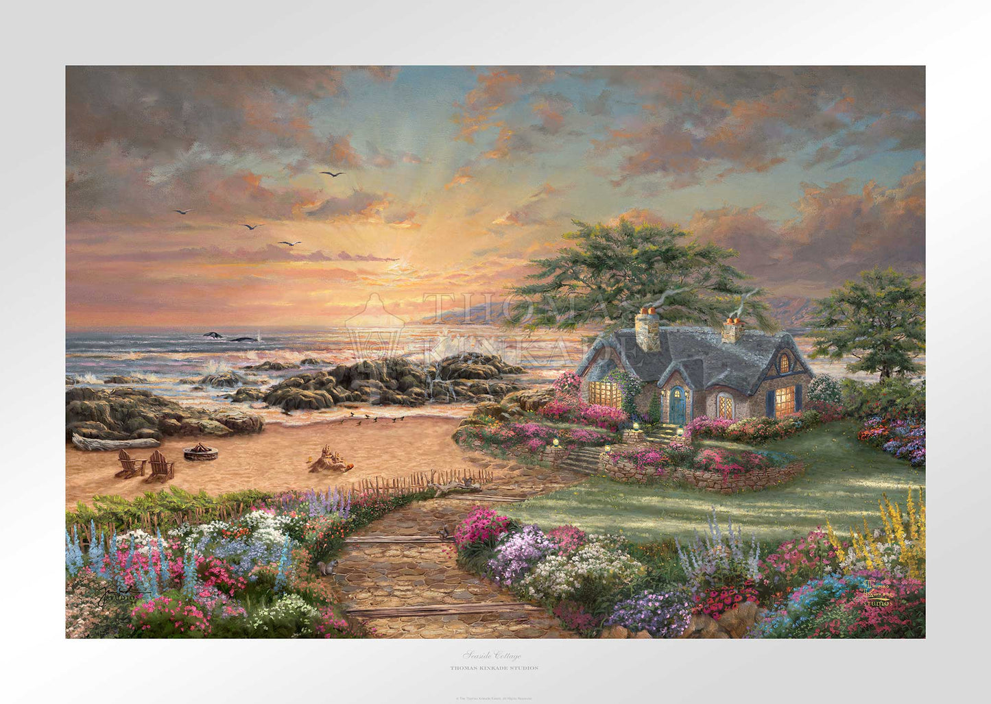 The enchanting setting sun radiates a warm glow as the ocean waves crash against the rocks on the seashore. The serenity of early evening fills the air, accented by the flowers’ beauty, the vibrant sunset, and the tranquil beach. The splash of the water from the breaching whales will bring a smile to those who are lucky to have witnessed their passing travels. The inviting cottage with its welcoming lights is the perfect place to enjoy Nature. Thomas Kinkade Studios presents Seaside Cottage, an idyllic sanctuary for all to refresh their faith, spirit, and soul.