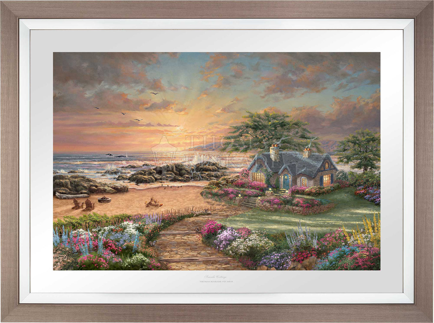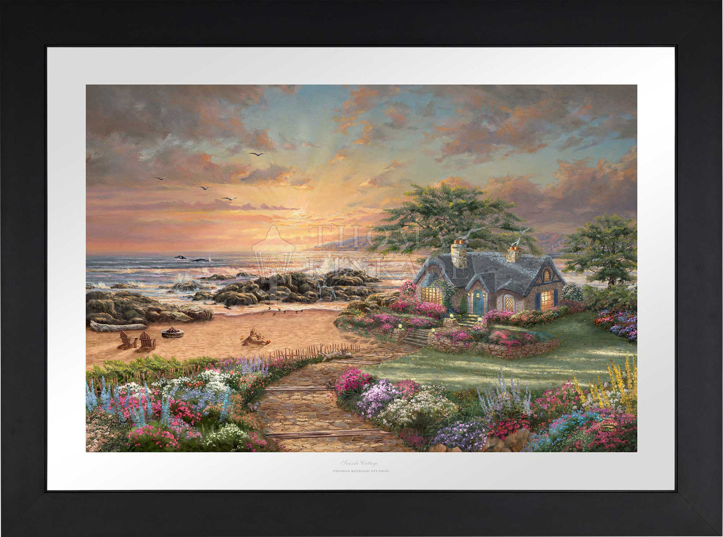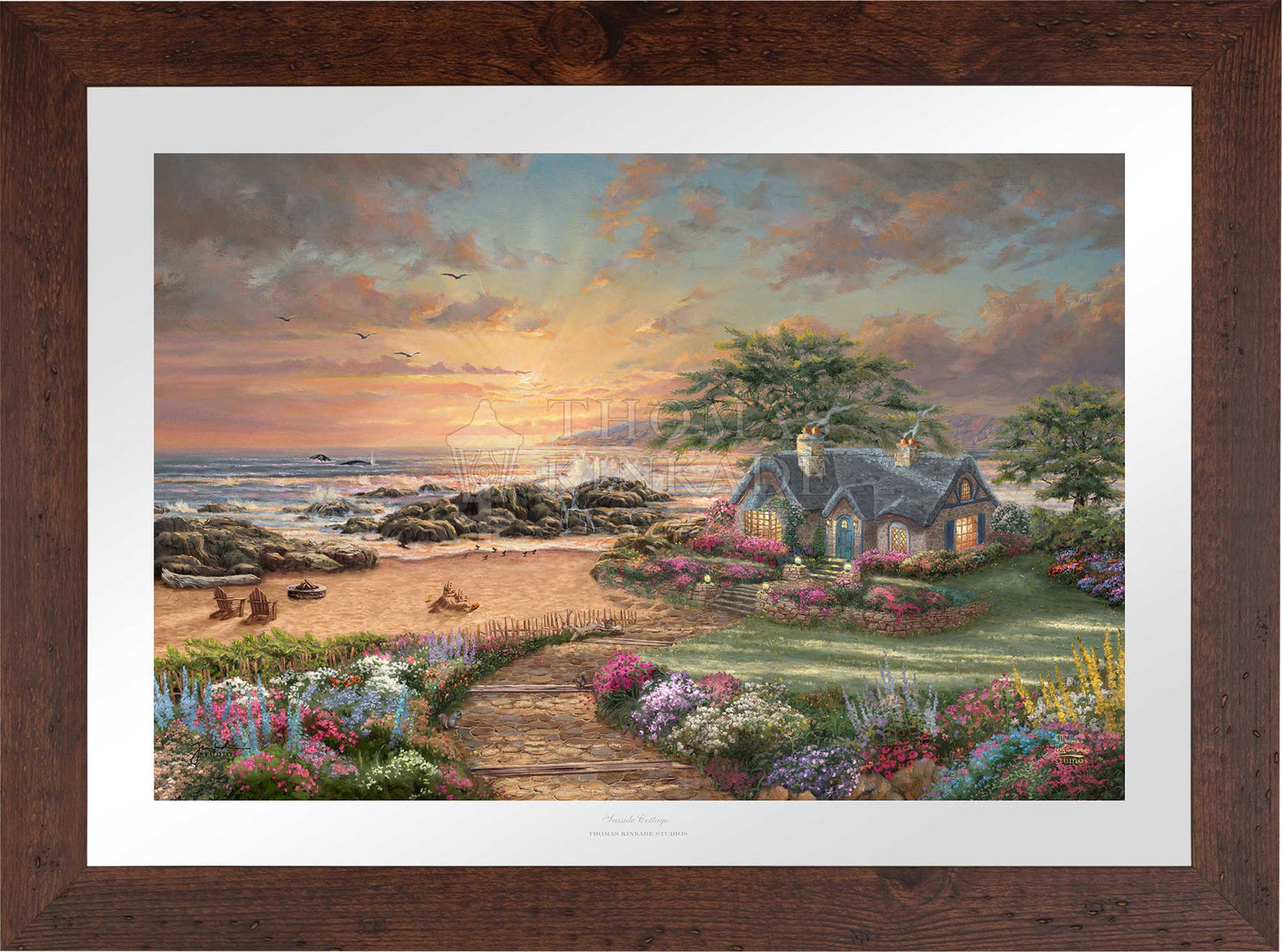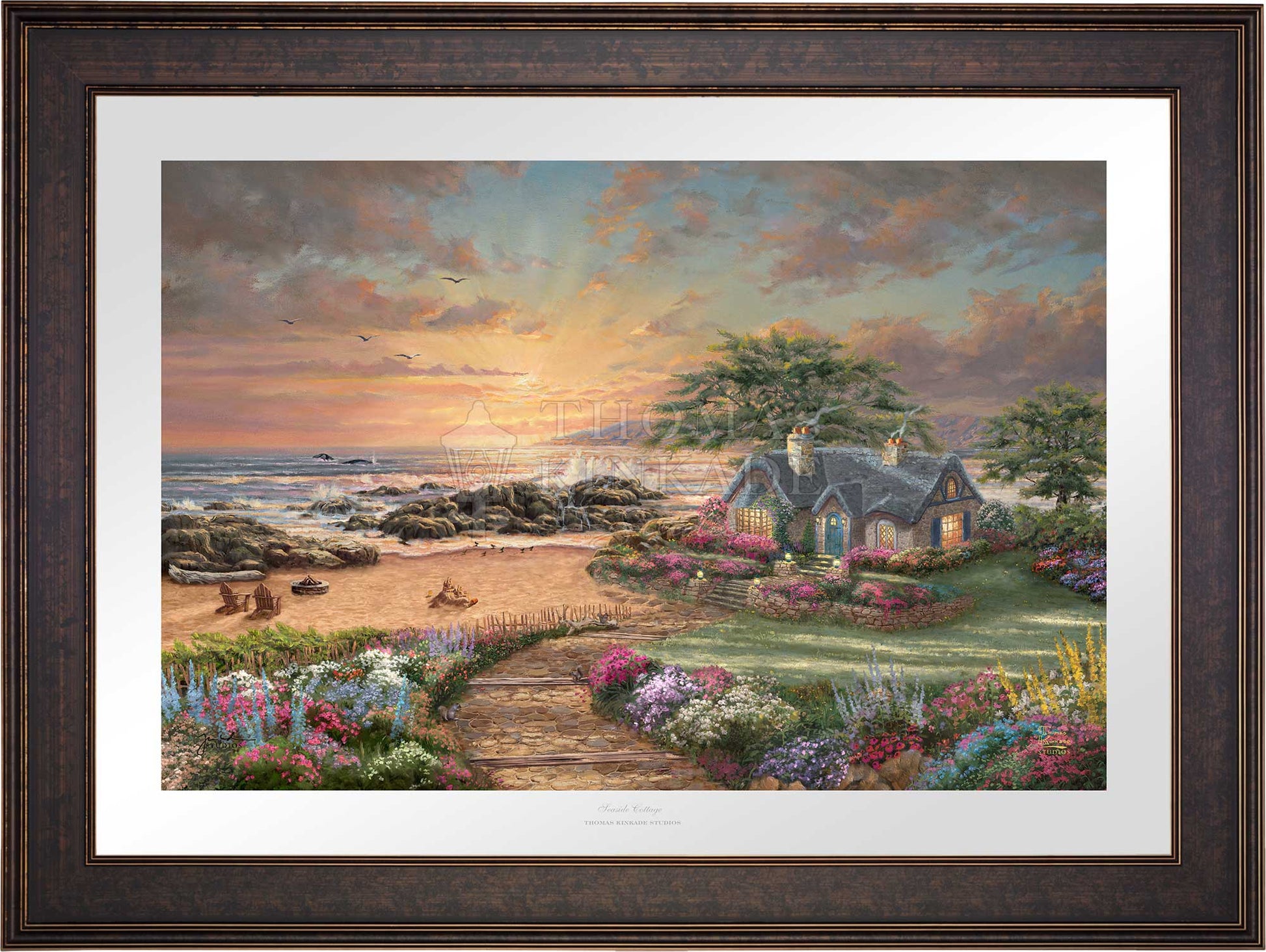 The enchanting setting sun radiates a warm glow as the ocean waves crash against the rocks on the seashore. The serenity of early evening fills the air, accented by the flowers’ beauty, the vibrant sunset, and the tranquil beach. The splash of the water from the breaching whales will bring a smile to those who are lucky to have witnessed their passing travels. The inviting cottage with its welcoming lights is the perfect place to enjoy Nature. Thomas Kinkade Studios presents Seaside Cottage, an idyllic sanctuary for all to refresh their faith, spirit, and soul.