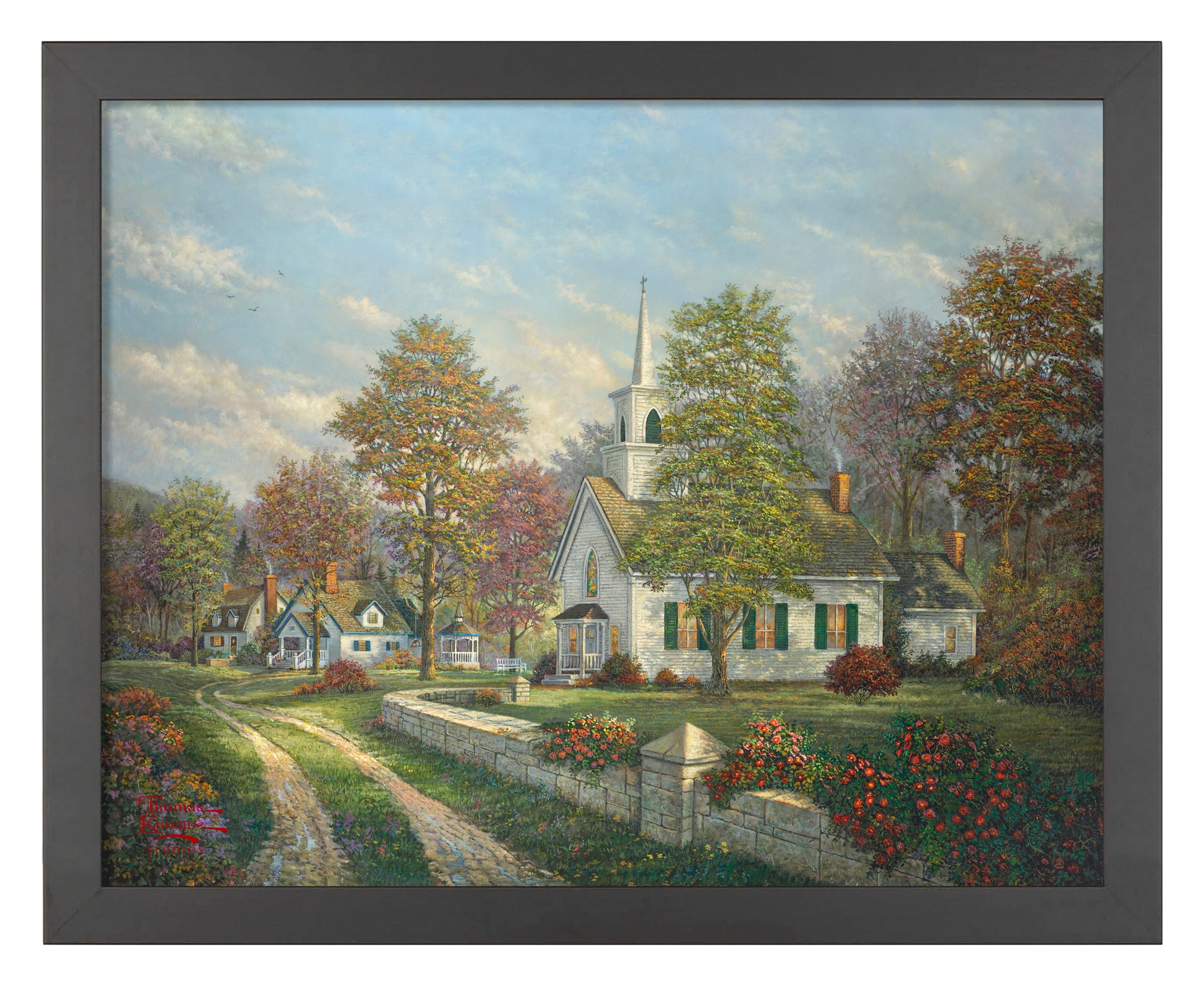 Thomas Kinkade loved to capture small town life by putting paint to canvas. Even as a young man he would come to believe in an idyllic world where love, hope and family came first. Thom always carried a small notebook, and a stub of a pencil, that he would use to sketch the scenes he came across. Over time, these travels and sketches would be the inspiration that would become the masterworks his collectors love. Inspired by a Thomas Kinkade original unfinished oil painting, Serenity Chapel by Thomas Kinkade Studios evokes all the timeless elements he loved to reflect in his paintings.