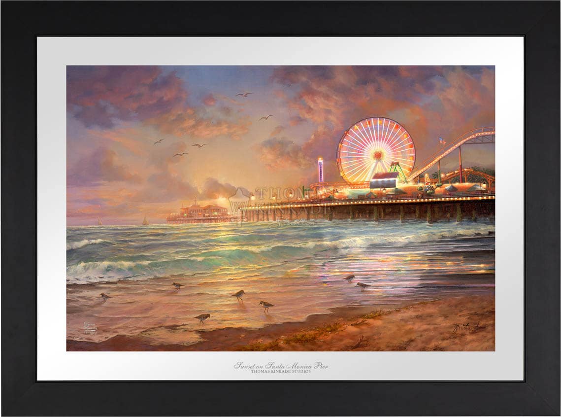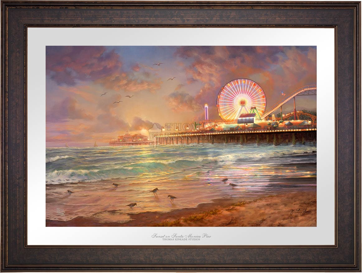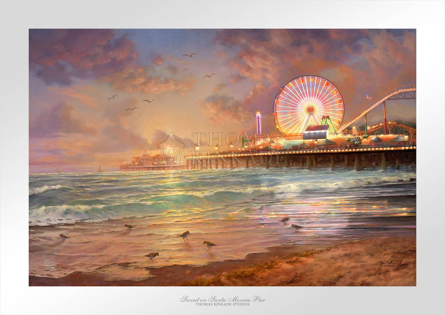 If one stands perfectly still on the soft beach, reflecting on the colors emanating from the pier and listening to the calliope of sounds bouncing off the water, you will feel the harmonic embrace of man and nature. Thomas Kinkade Studios’ Sunset at Santa Monica Pier brings to life the vibrancy of the setting sun reflecting off the picturesque pier and the magical sounds of fun rolling across the ocean waves. This painting is a celebration of natural beauty and cherished family memories.
