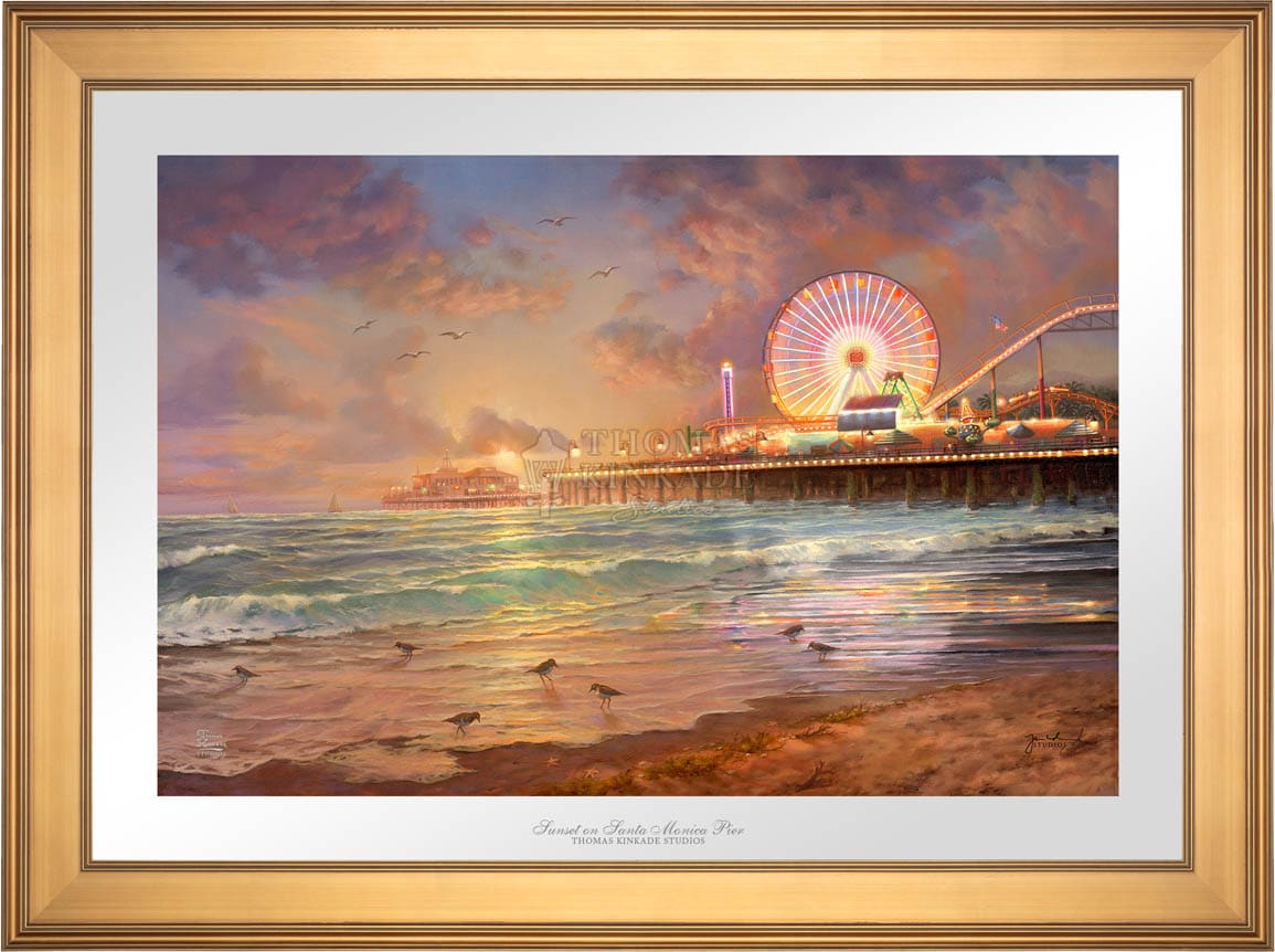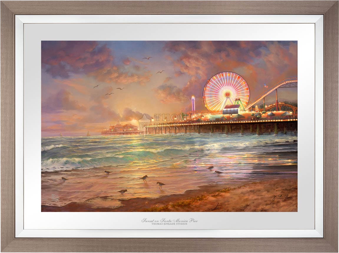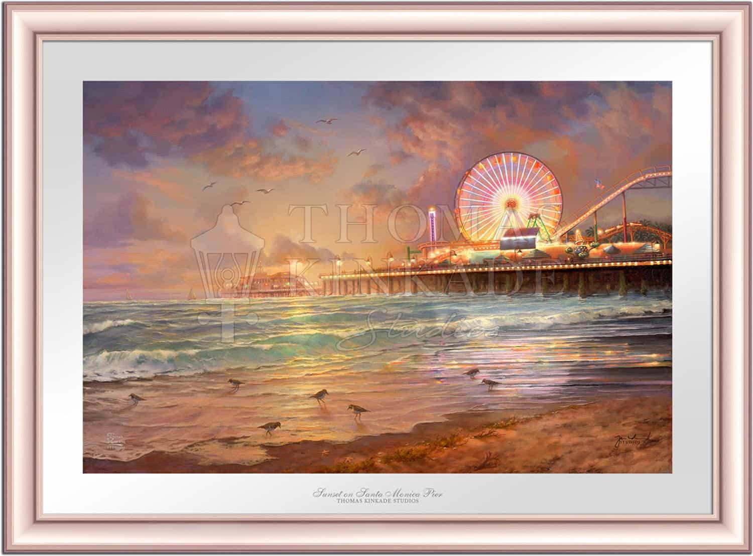 If one stands perfectly still on the soft beach, reflecting on the colors emanating from the pier and listening to the calliope of sounds bouncing off the water, you will feel the harmonic embrace of man and nature. Thomas Kinkade Studios’ Sunset at Santa Monica Pier brings to life the vibrancy of the setting sun reflecting off the picturesque pier and the magical sounds of fun rolling across the ocean waves. This painting is a celebration of natural beauty and cherished family memories.