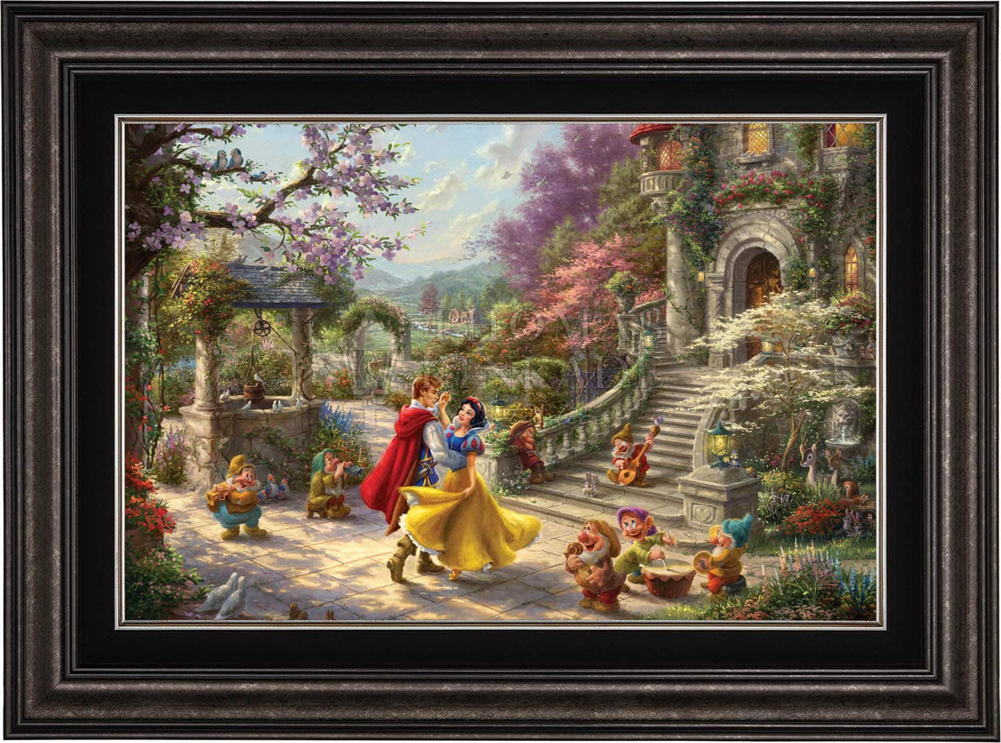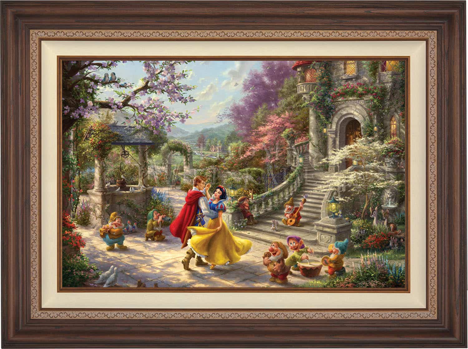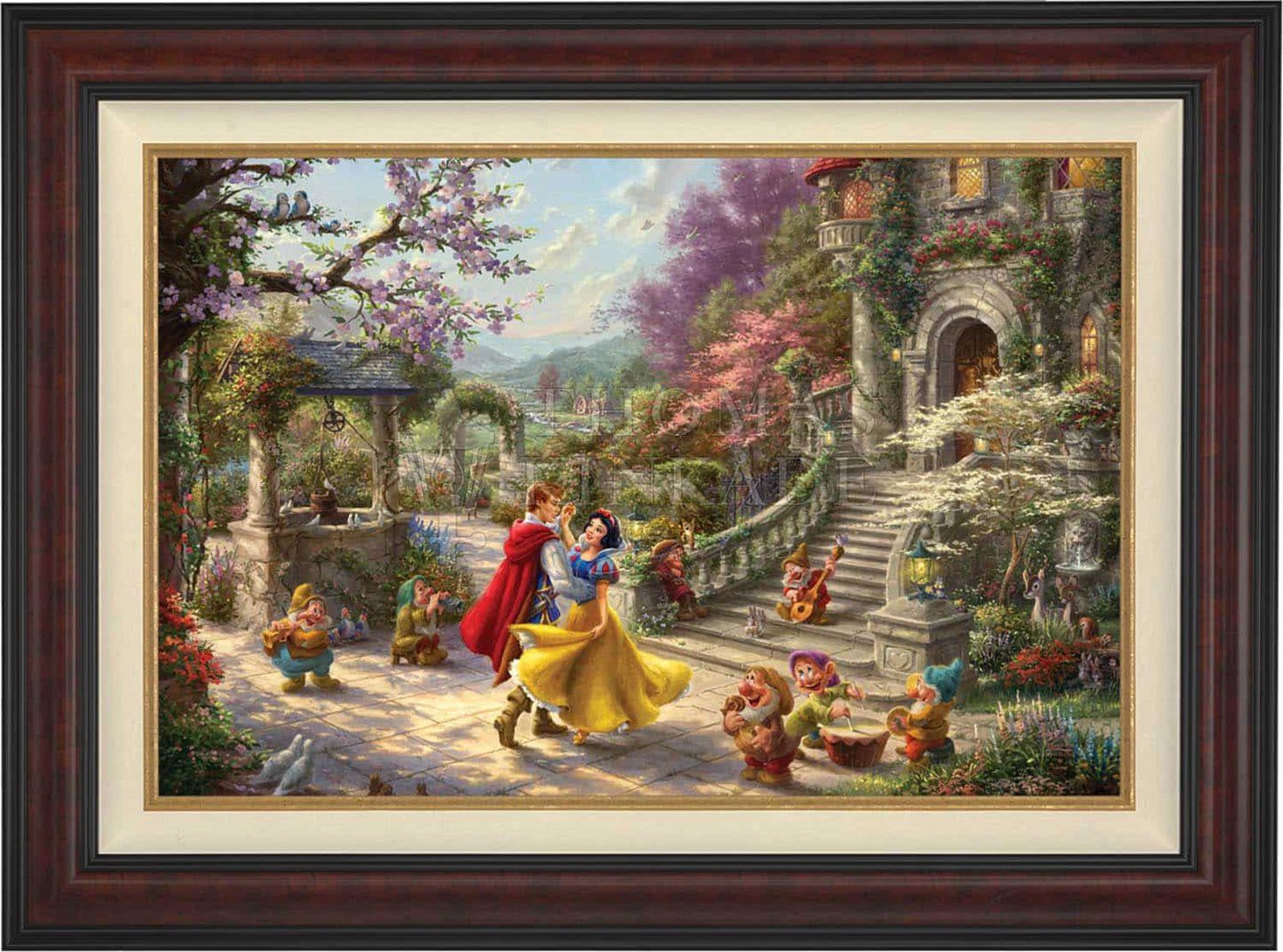 This simple story of a charming princess saved by a group of seven adorable dwarfs and a prince from the evil deeds of her vain and wicked Stepmother the Queen, made history when it was first released in 1937 as the highest grossing sound film of the time. Now this timeless story of love, envy, and friendship has been recreated in this vibrantly colorful painting by Thomas Kinkade Studios in Snow White Dancing in the Sunlight , the third piece of the collection entitled, Dancing in the Light . This romantic scene takes place in the courtyard of the kingdom’s castle, where Snow White and all of her friends are celebrating the defeat of the wicked Queen and reuniting of true love.