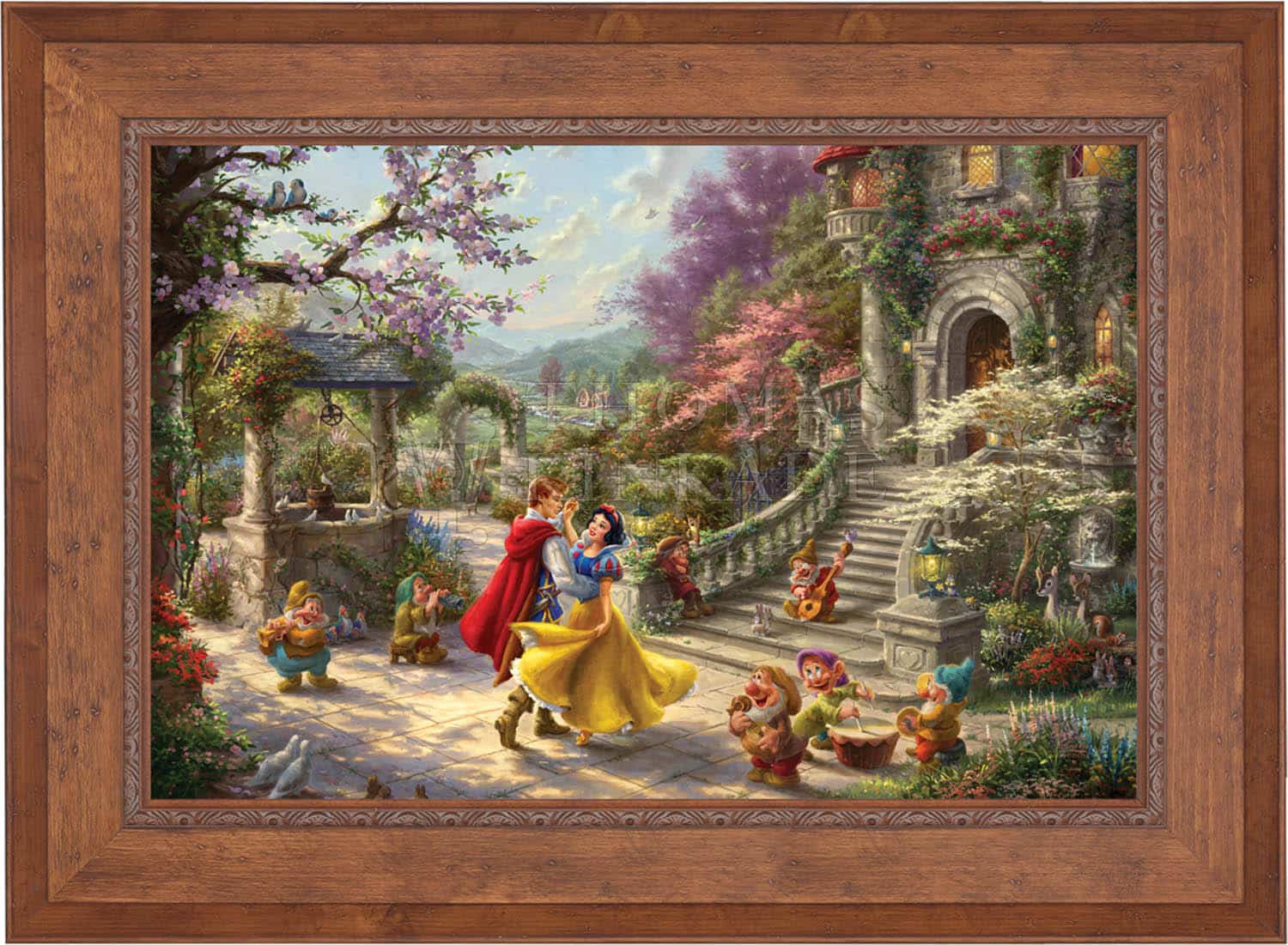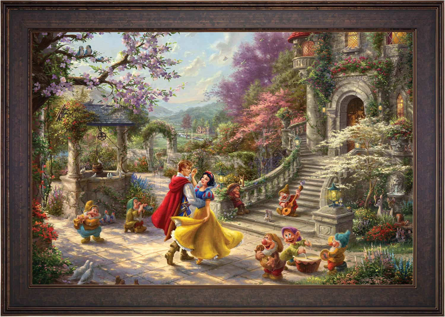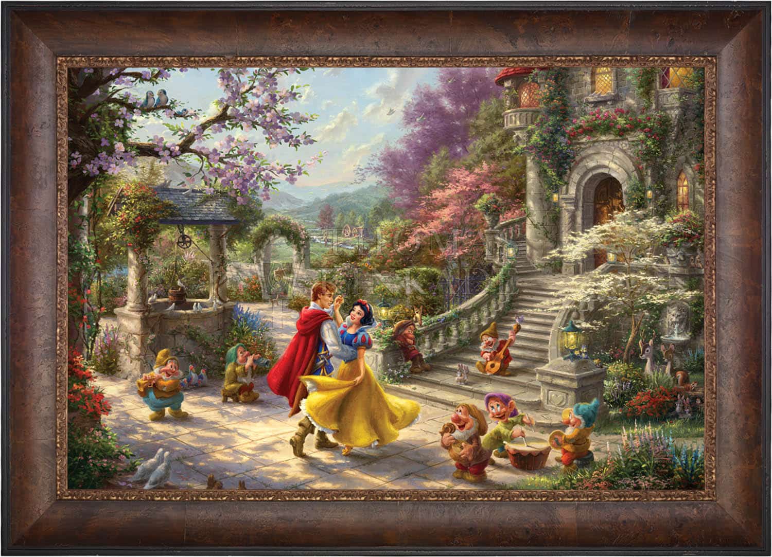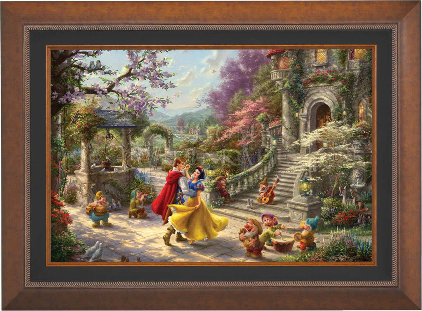 This simple story of a charming princess saved by a group of seven adorable dwarfs and a prince from the evil deeds of her vain and wicked Stepmother the Queen, made history when it was first released in 1937 as the highest grossing sound film of the time. Now this timeless story of love, envy, and friendship has been recreated in this vibrantly colorful painting by Thomas Kinkade Studios in Snow White Dancing in the Sunlight , the third piece of the collection entitled, Dancing in the Light . This romantic scene takes place in the courtyard of the kingdom’s castle, where Snow White and all of her friends are celebrating the defeat of the wicked Queen and reuniting of true love.
