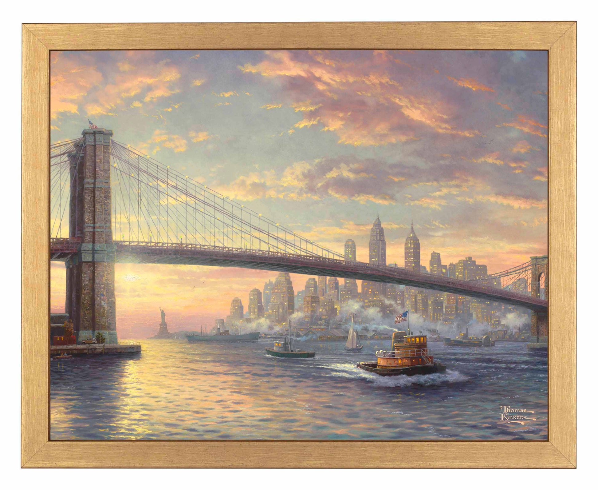 On a recent trip to New York with my family, we got the chance to boat on the East River, enjoying seldom-seen views of the city. As I savored the panorama of the Brooklyn Bridge towering above the glistening city skyline it dawned on me: what image could better summarize The Spirit of New York? As I labored on the epic canvas I came to see the many boats upon the East River as somehow symbolic. The humble harbor tug flying Old Glory expresses New York's tremendous resolve in the face of challenges. Cargo ships remind us of economic power, while a military vessel suggests the power of heroism. A vintage ferry boat plies the waters of the East River, and an array of pleasure boats confirm that after all these years, the city still knows how to throw a party. In the far distance, Lady Liberty holds high the torch of freedom for all to see.