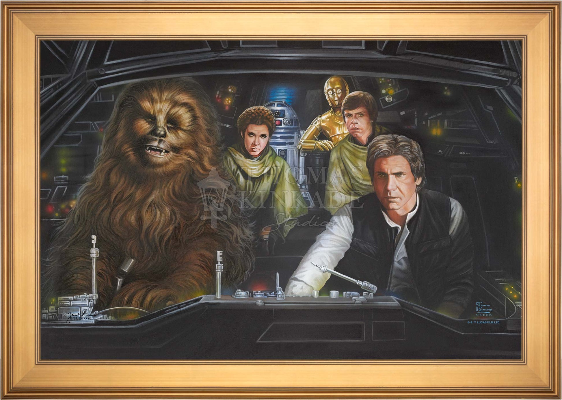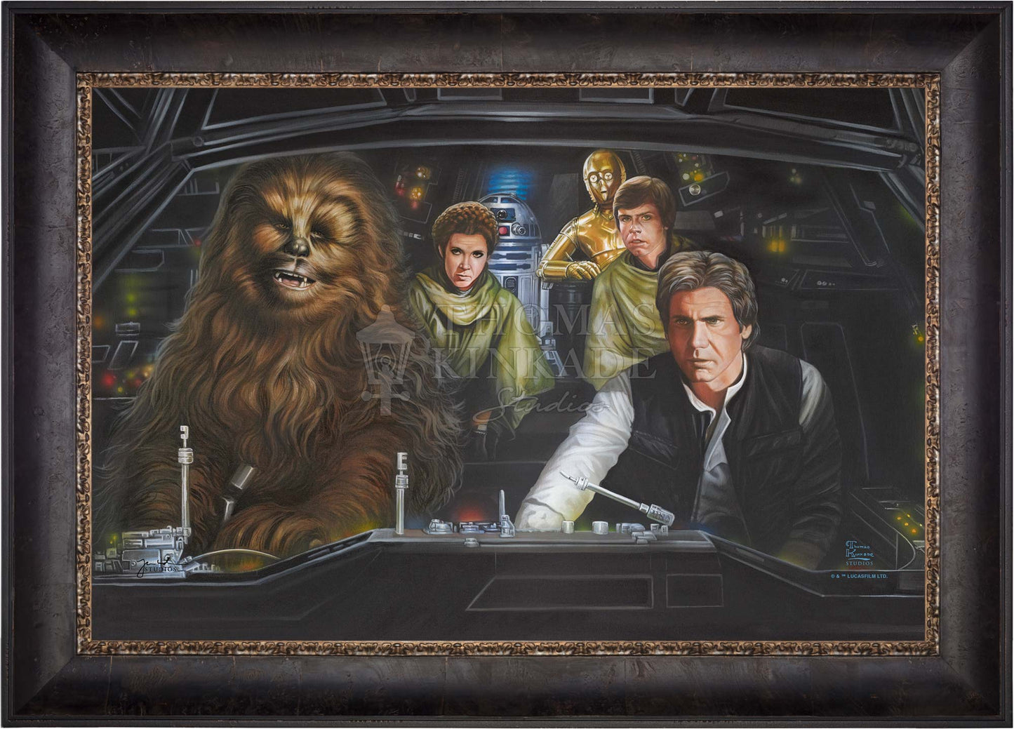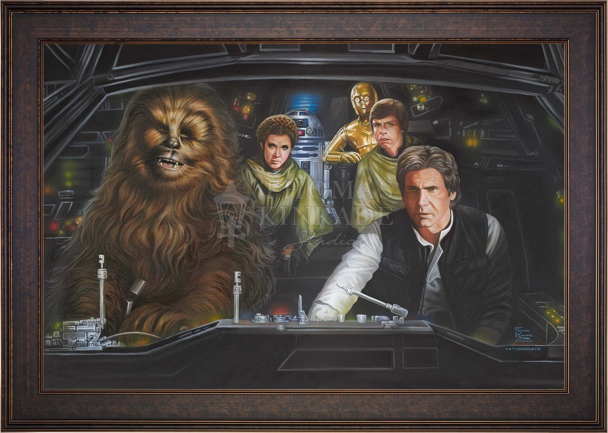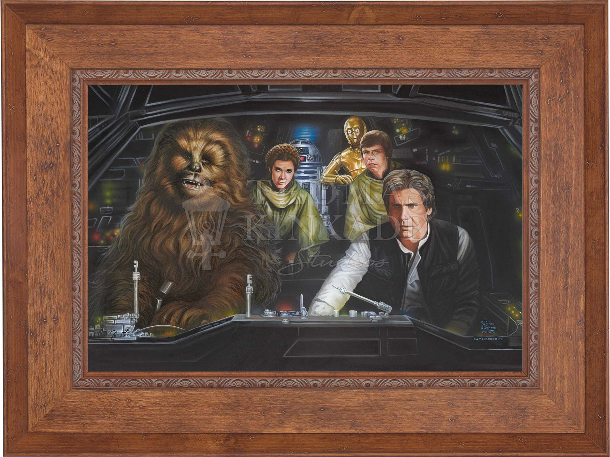 General Han Solo leads a small team of rebels including Chewbacca™, Princess Leia Organa™, Luke Skywalker™, and the Droids, C-3PO™ and R2-D2™ aboard The Tydirium, a stolen Imperial shuttle disguised as a cargo ship. The mission is to use a secret Imperial code, land on the forest moon, and deactivate the shield generator protecting the Death Star. While the team waits to see if the code will work and allow them to land on the forest moon to start their secret mission, the Rebel Alliance fleet starts their journey towards Endor to defeat the Empire and blow up the Death Star. Thomas Kinkade Studios is pleased to present Strike Team.