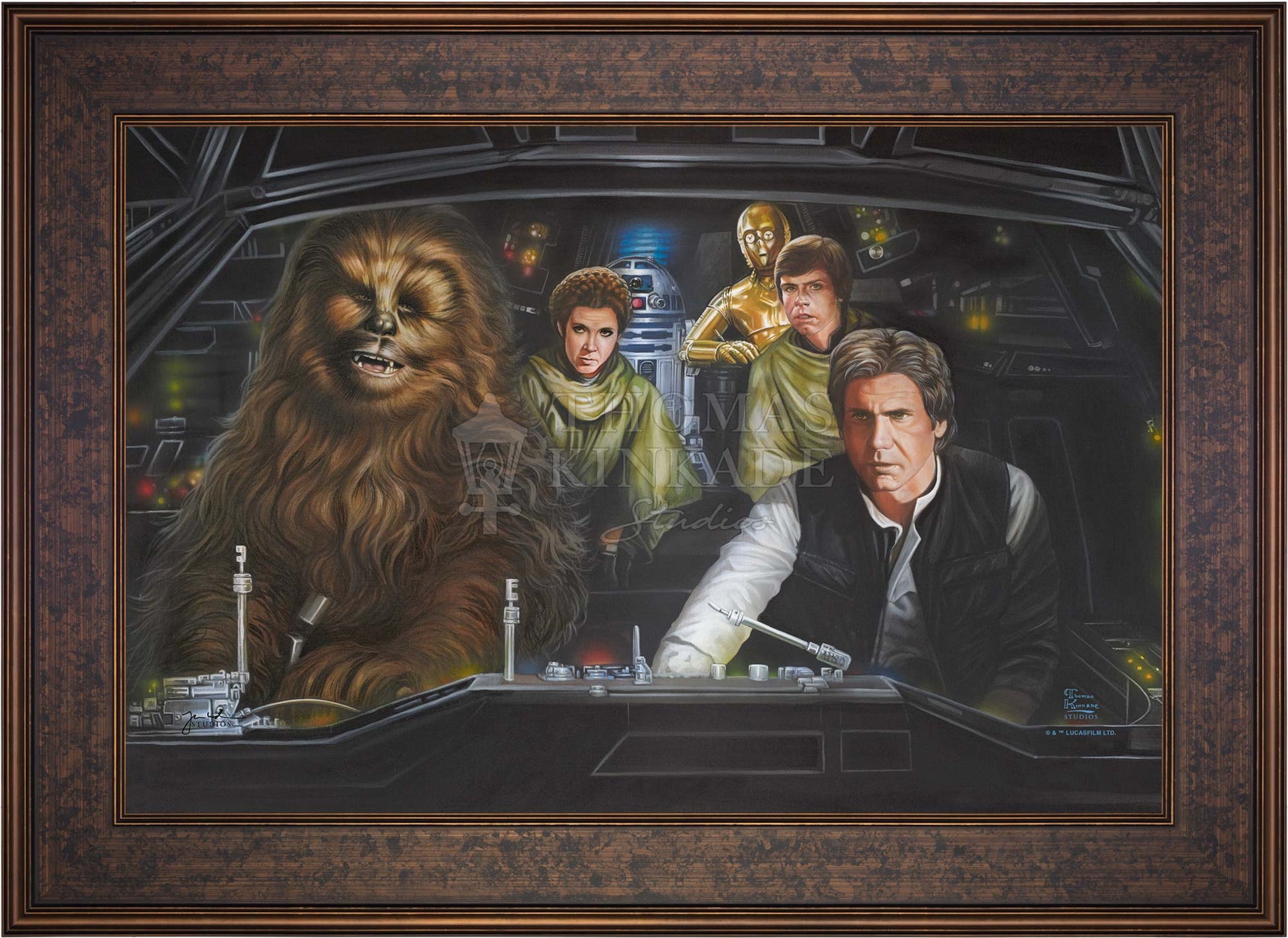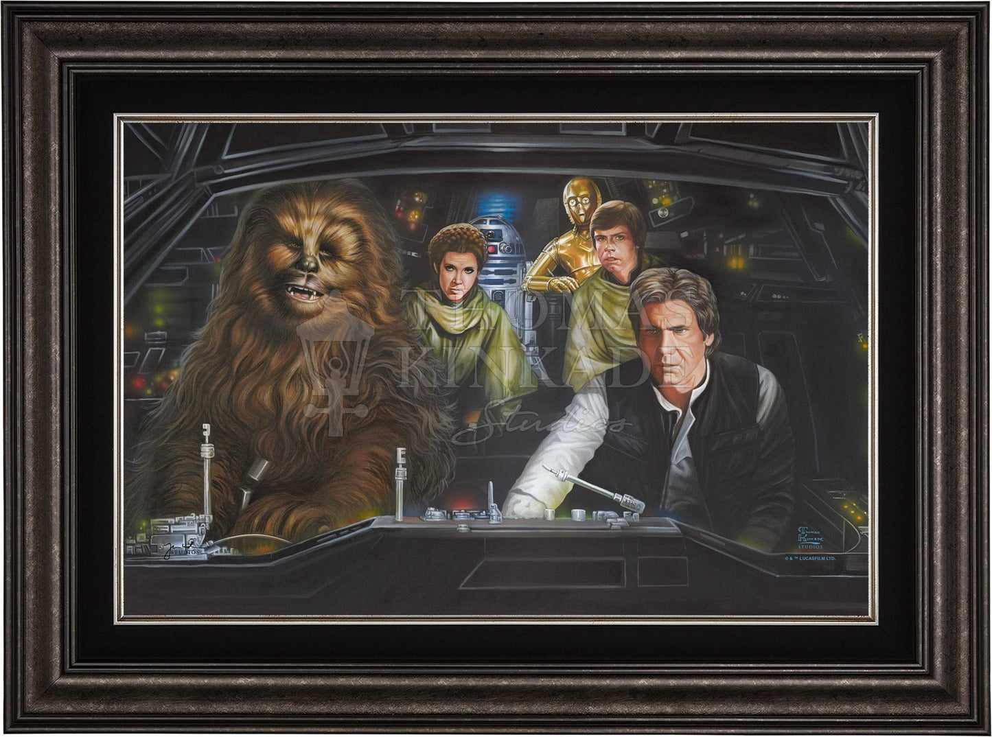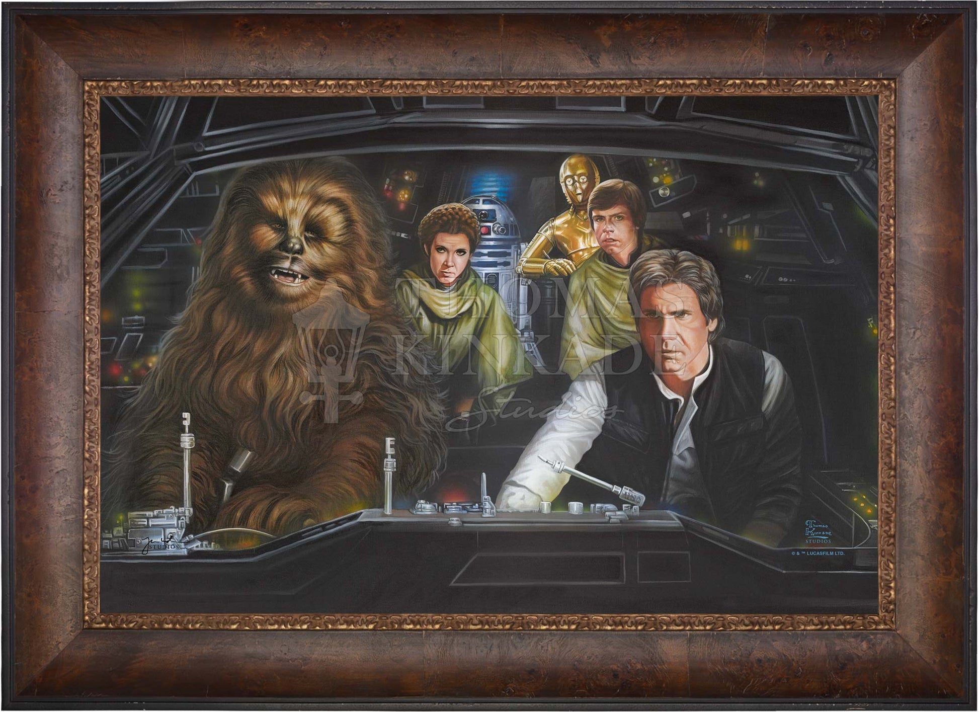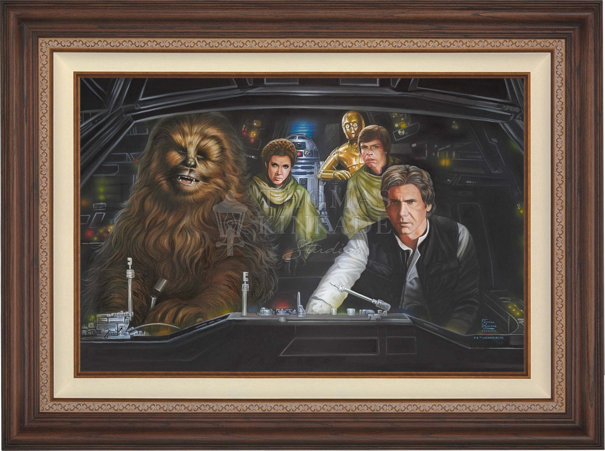 General Han Solo leads a small team of rebels including Chewbacca™, Princess Leia Organa™, Luke Skywalker™, and the Droids, C-3PO™ and R2-D2™ aboard The Tydirium, a stolen Imperial shuttle disguised as a cargo ship. The mission is to use a secret Imperial code, land on the forest moon, and deactivate the shield generator protecting the Death Star. While the team waits to see if the code will work and allow them to land on the forest moon to start their secret mission, the Rebel Alliance fleet starts their journey towards Endor to defeat the Empire and blow up the Death Star. Thomas Kinkade Studios is pleased to present Strike Team.