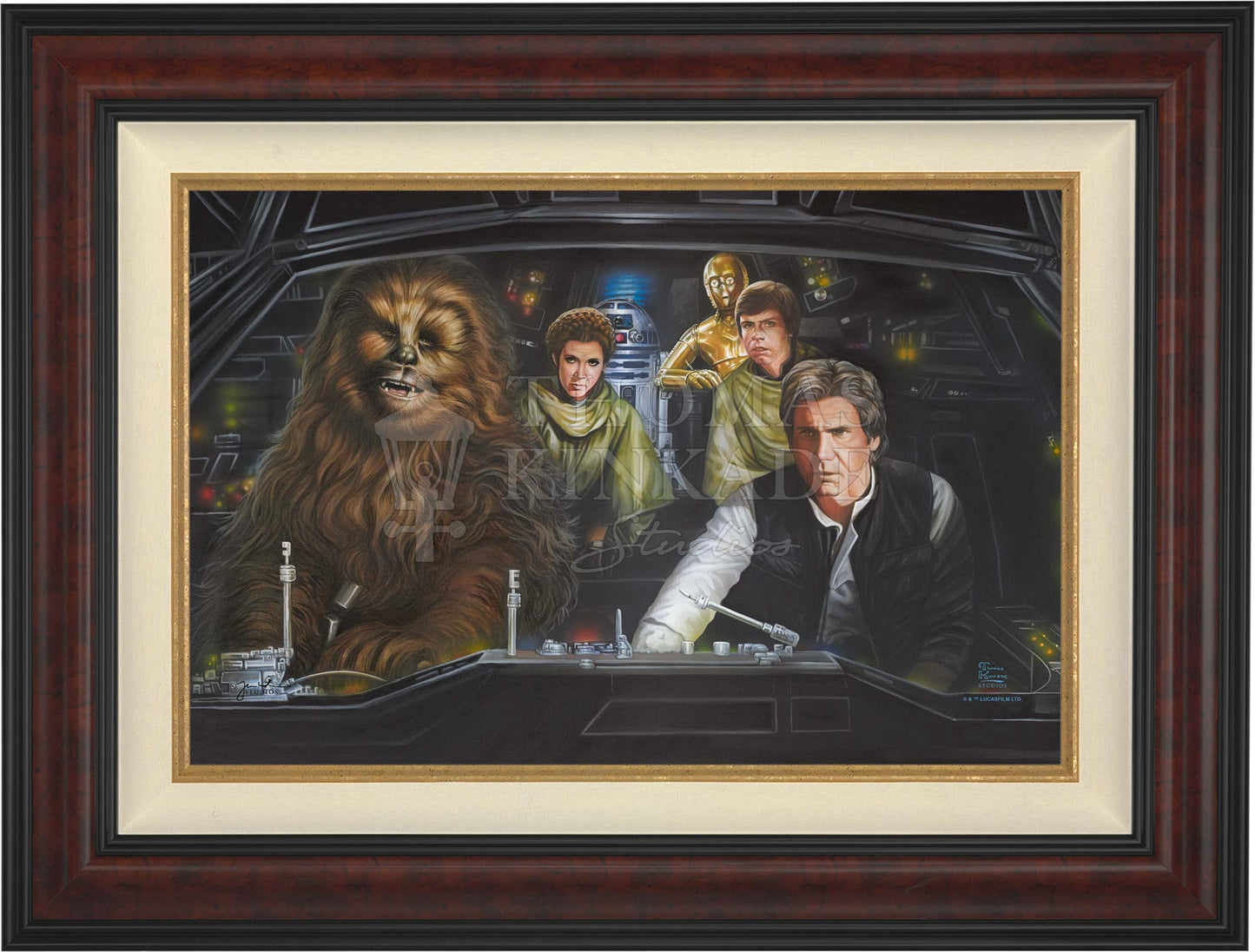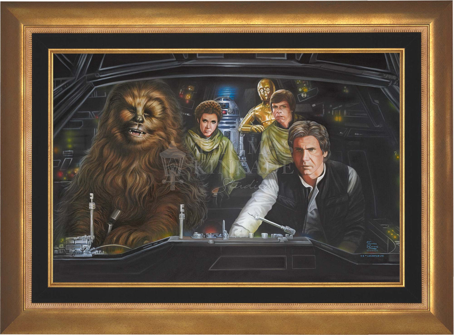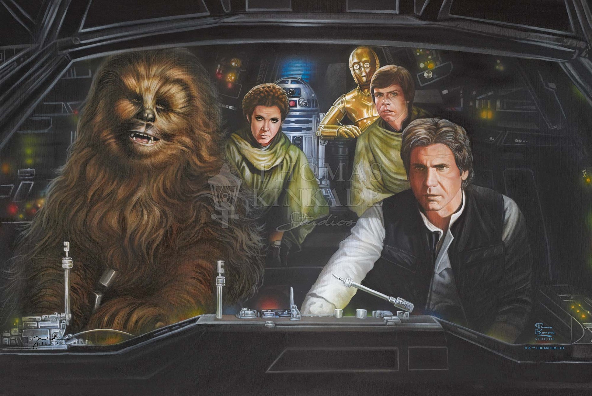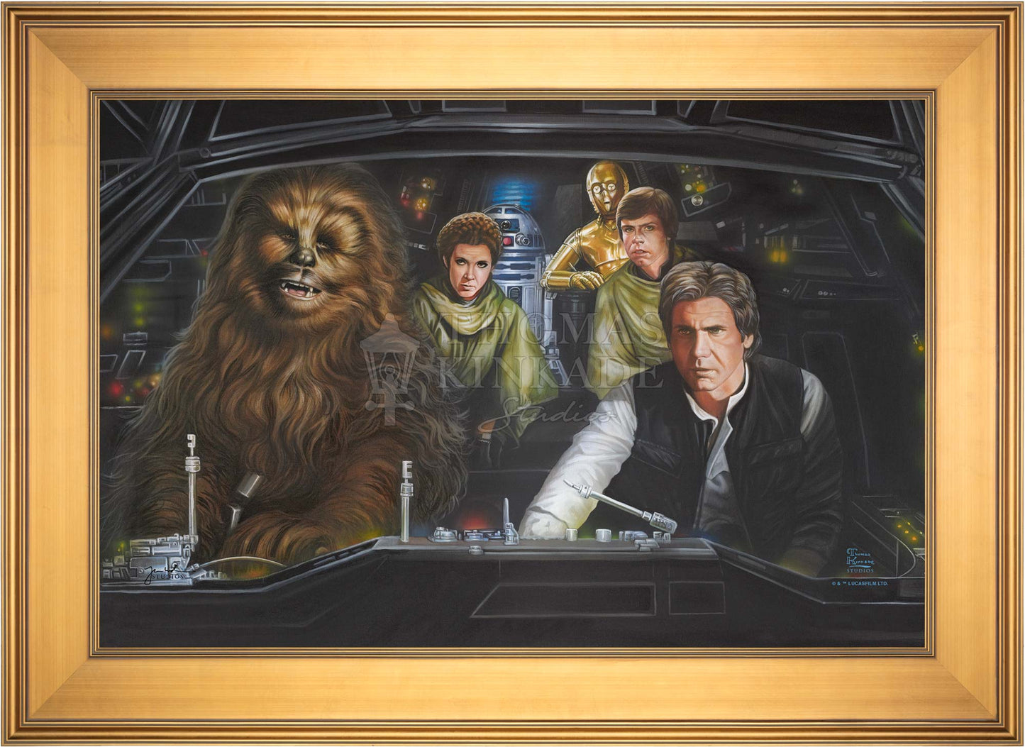 General Han Solo leads a small team of rebels including Chewbacca™, Princess Leia Organa™, Luke Skywalker™, and the Droids, C-3PO™ and R2-D2™ aboard The Tydirium, a stolen Imperial shuttle disguised as a cargo ship. The mission is to use a secret Imperial code, land on the forest moon, and deactivate the shield generator protecting the Death Star. While the team waits to see if the code will work and allow them to land on the forest moon to start their secret mission, the Rebel Alliance fleet starts their journey towards Endor to defeat the Empire and blow up the Death Star. Thomas Kinkade Studios is pleased to present Strike Team.
