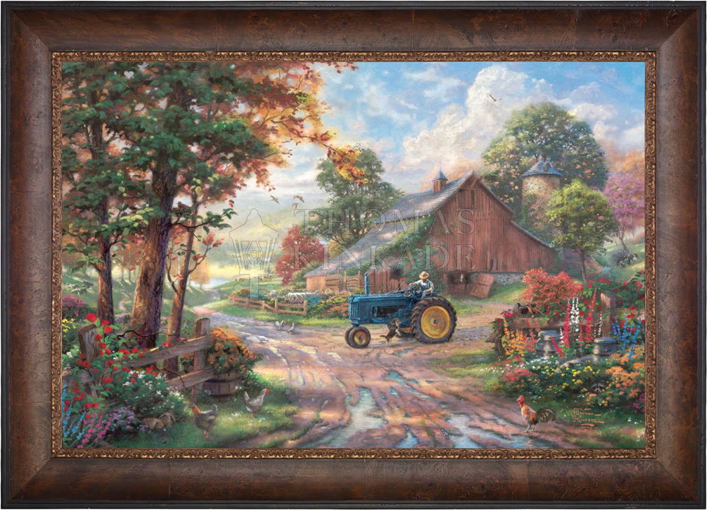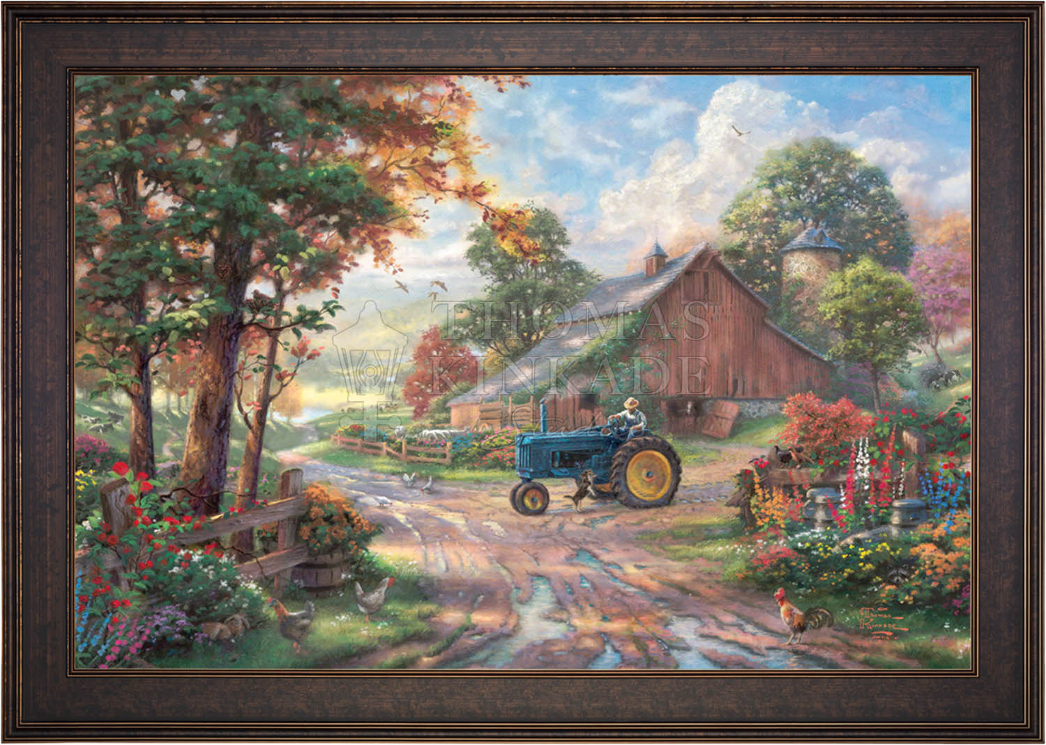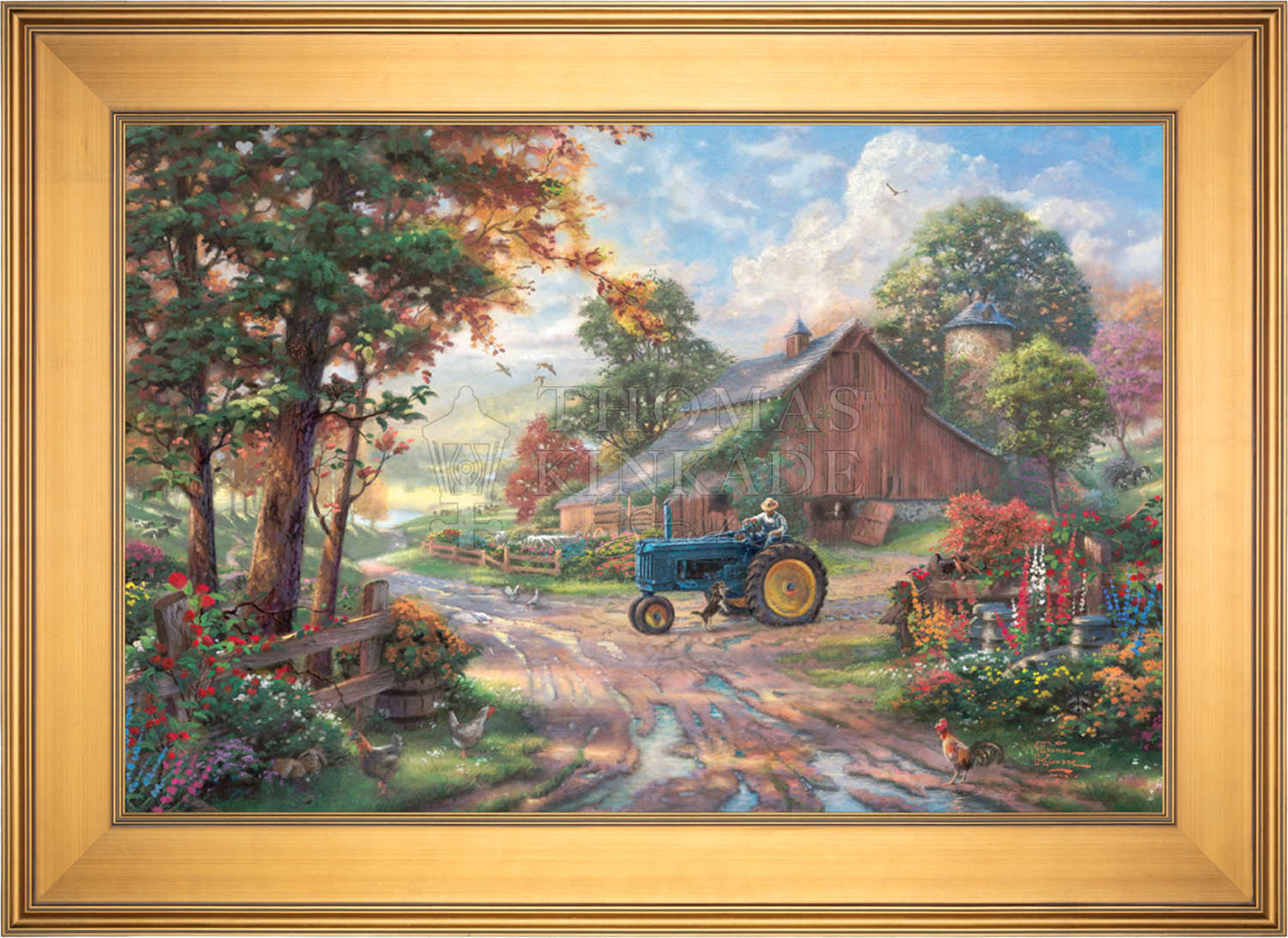 America's heritage and character was forged on storied ranches and farmhouses that dot the plains and foothills of our magnificent country. Everyday, the ranching and farming families ... nature's caretakers ... vest strength and energy caring for creation while in turn harvesting its bountiful rewards.As I thought of memorializing the impact of the family farms and ranches across our country, I imagined a grandfather starting his old reliable tractor early in the morning surrounded by a cohort of animals oblivious to his chores and duties. And what a great adventure for any youngster anxious to explore and leave a mark on granddad's farm ... the tractor, the barn, the animals, trees and pond ... could there be a better heritage afforded by summer ... could there be a better forge for character ... not likely!