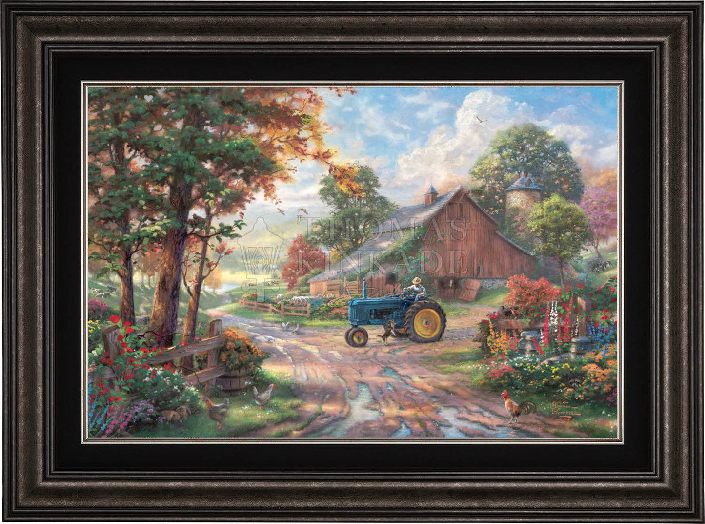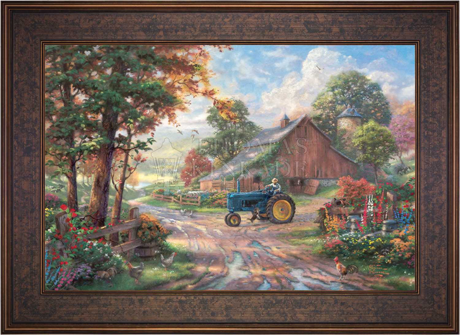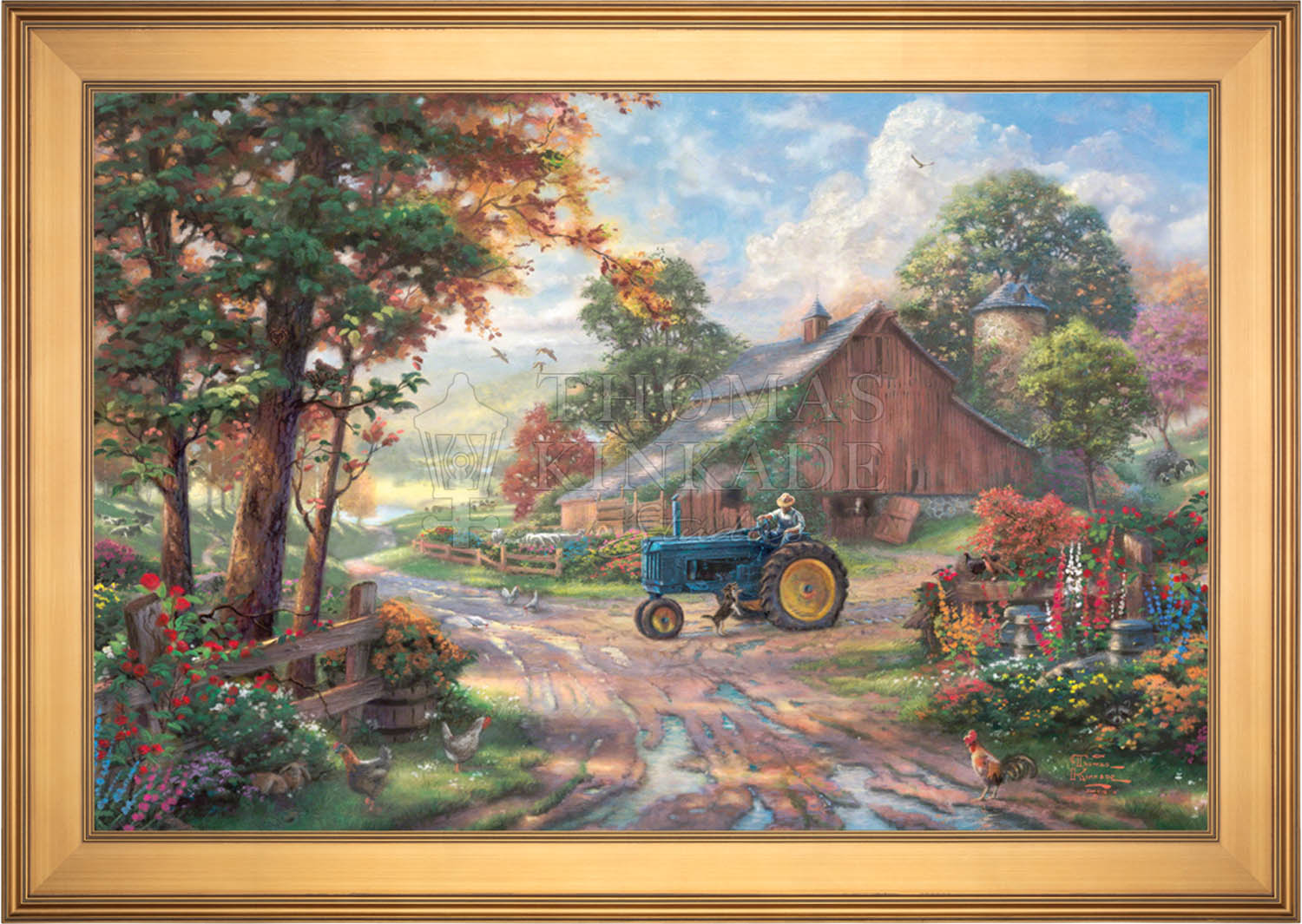 America's heritage and character was forged on storied ranches and farmhouses that dot the plains and foothills of our magnificent country. Everyday, the ranching and farming families ... nature's caretakers ... vest strength and energy caring for creation while in turn harvesting its bountiful rewards.As I thought of memorializing the impact of the family farms and ranches across our country, I imagined a grandfather starting his old reliable tractor early in the morning surrounded by a cohort of animals oblivious to his chores and duties. And what a great adventure for any youngster anxious to explore and leave a mark on granddad's farm ... the tractor, the barn, the animals, trees and pond ... could there be a better heritage afforded by summer ... could there be a better forge for character ... not likely!