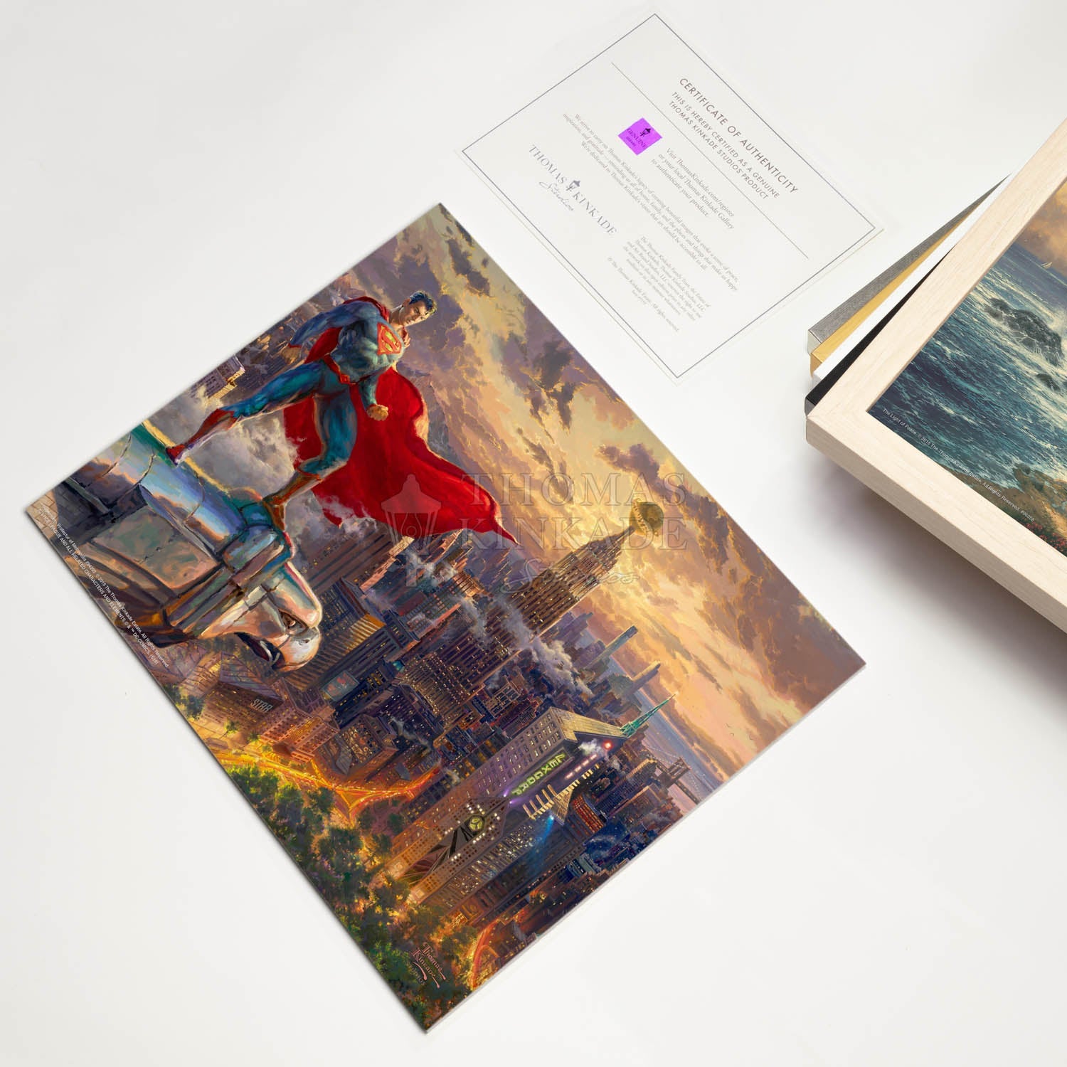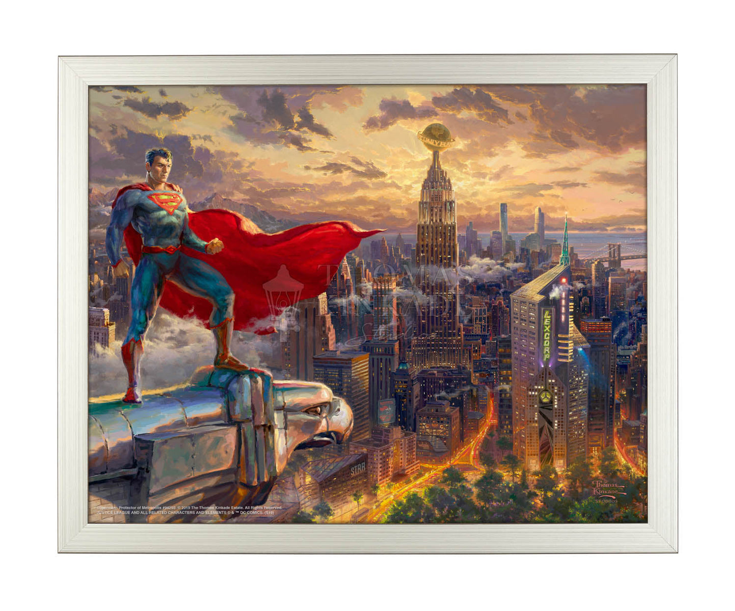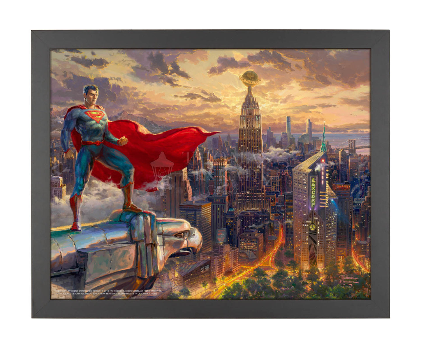 Under the ever-vigilant protection of SUPERMAN, METROPOLIS is a gleaming urban center, a melting pot of peoples and cultures, and an iconic city that is a beacon of hope. Coined as “The City of Tomorrow” it is a global center for commerce, industry and culture – making it an irresistible target for common criminals, Super-Villains and otherworldly aliens alike. SUPERMAN- Protector of METROPOLIS is a symbol of American opportunity and values. One of the hallmarks of America is that people can reach their full potential when allowed the freedom to do so. SUPERMAN embodies this ideal, since as a “superhuman” he chooses to help and protect rather than conquer and enslave. Join us as we peer into this Kinkadian scene, set atop of DC Comics’ most legendary city. At the break of dawn, the MAN OF STEEL is poised and ready to protect his adopted home town and planet from anything and anyone that threatens its safety.