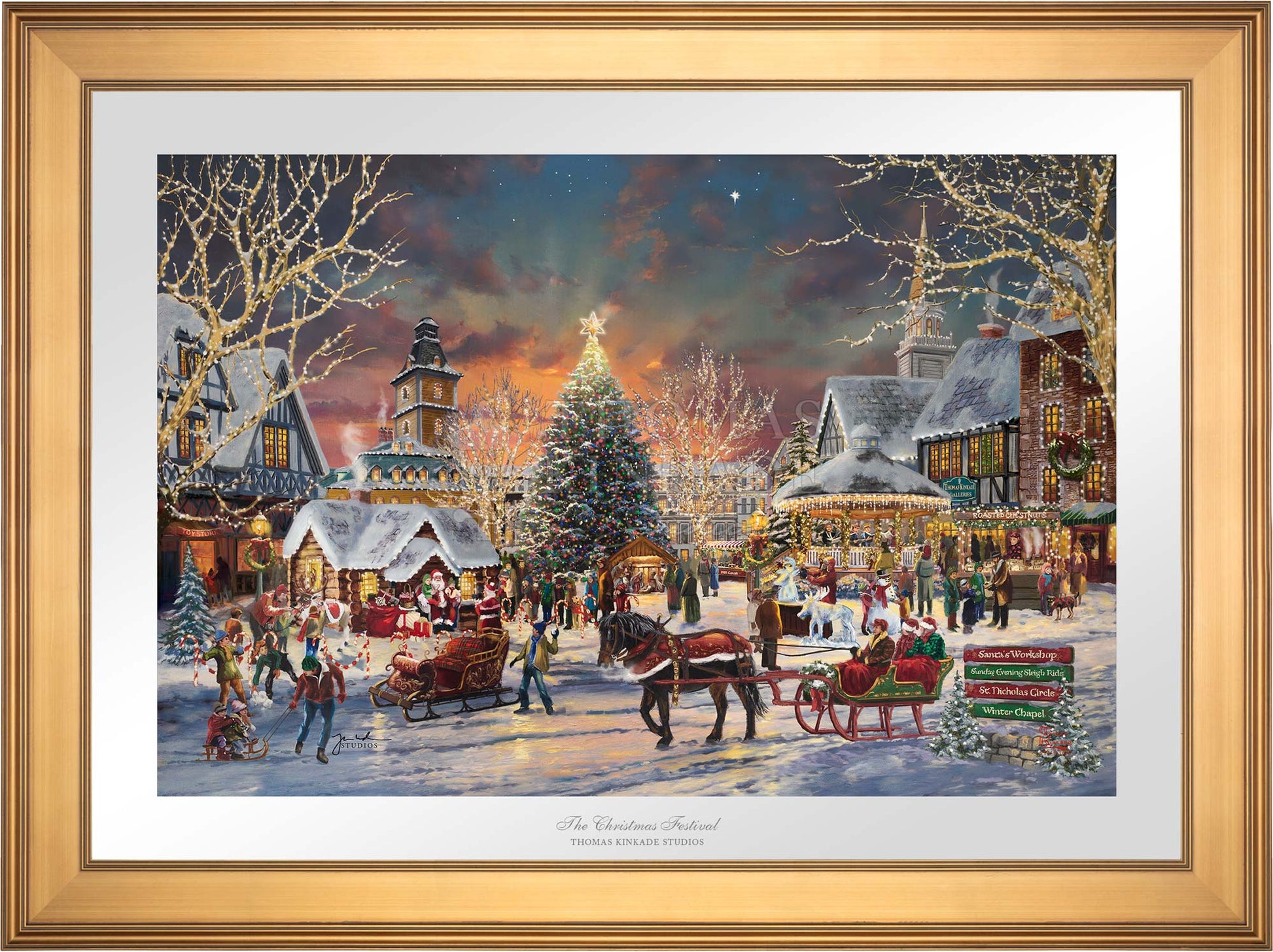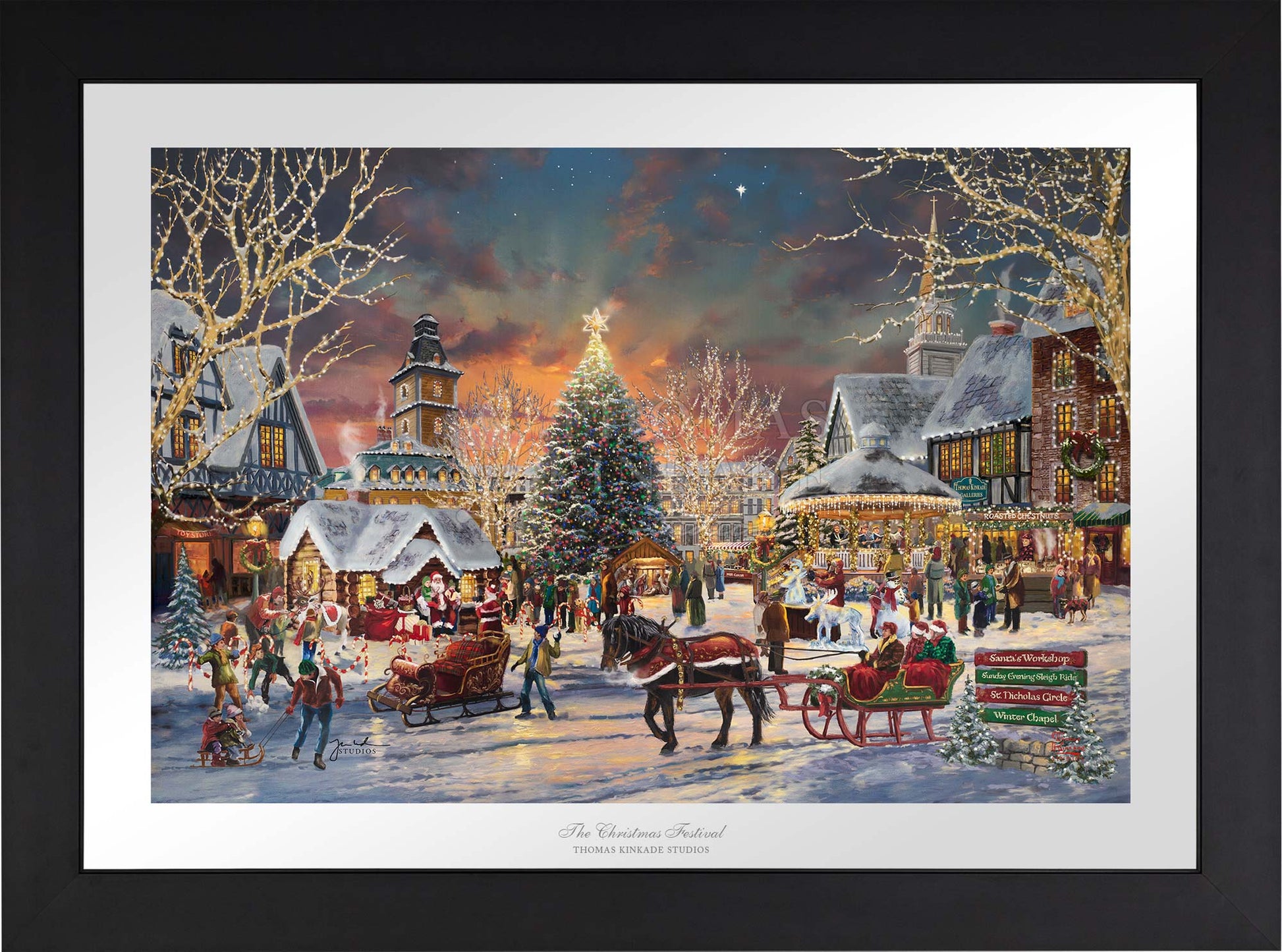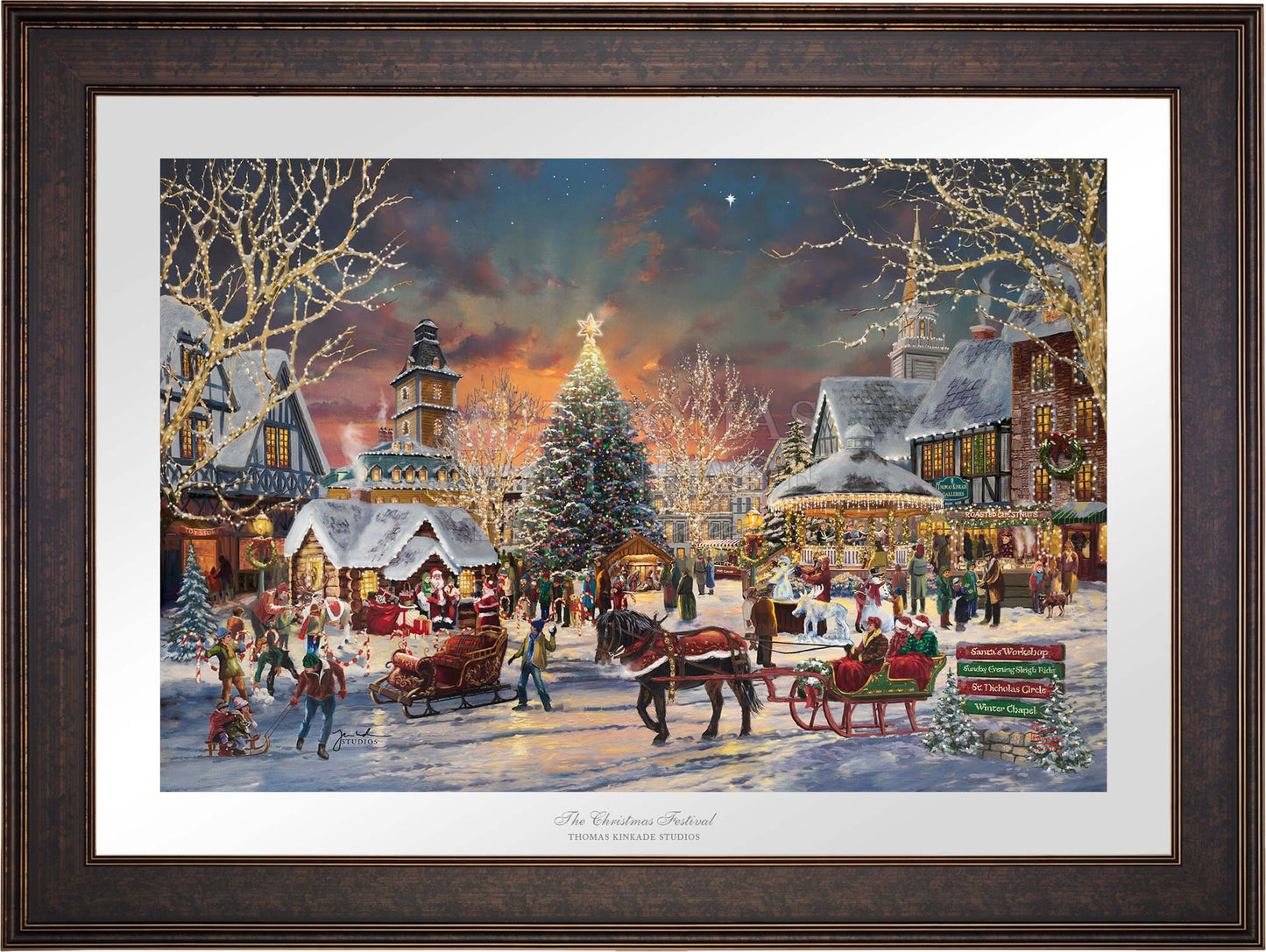 Call Us“Of all the holiday rituals, the one I prize the most is the coming together of loved ones in shared celebration.” – Thomas Kinkade A bright Christmas star illuminates the evening sky as young and old gather to begin celebrating the Christmas season. Santa has taken his seat, and excited children wait in line with their parents and grandparents to have their turn telling Santa what they would love for Christmas. As you walk around the town square one can enjoy the melodic sounds of the Christmas Carolers in the brightly decorated gazebo. Maybe have a cup of hot cocoa or a bag of roasted chestnuts while watching the ice sculptor create a cool icy version of one of Santa’s reindeer. The Thomas Kinkade Studios invites you to join us for the first day of The Christmas Festival.